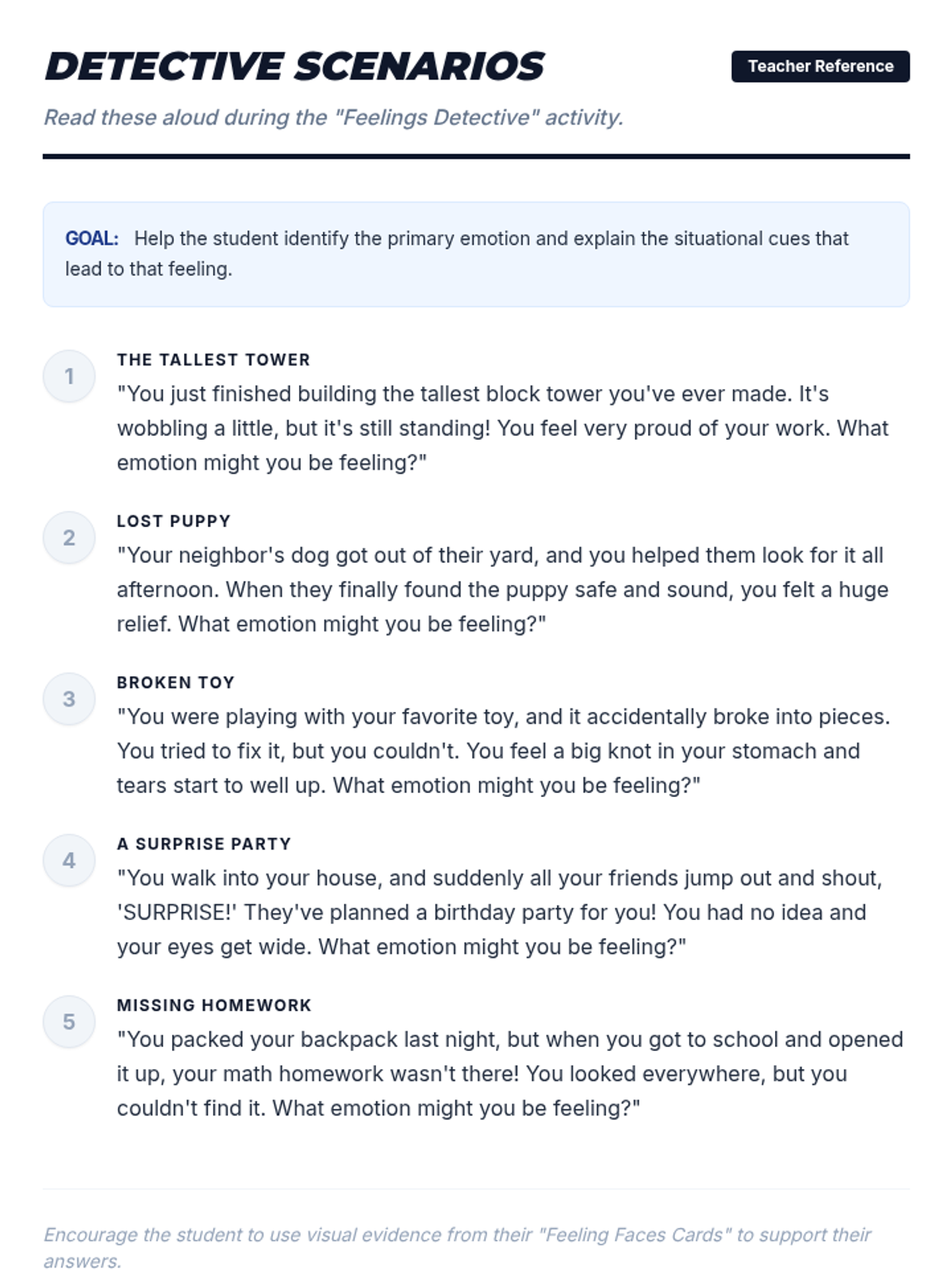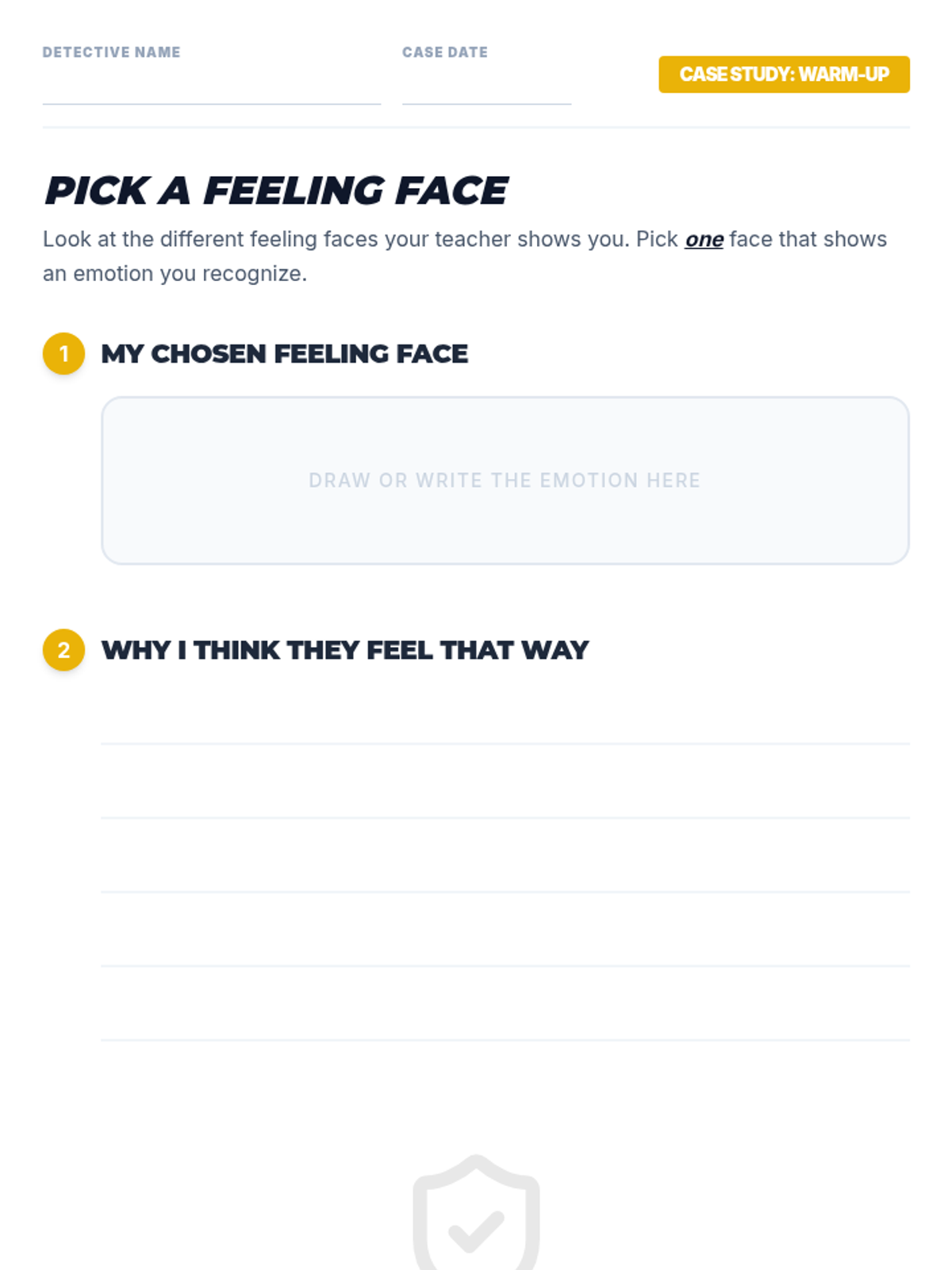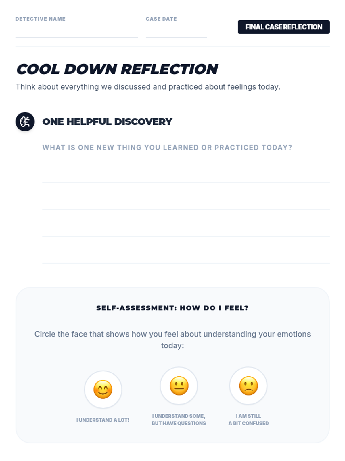 A Tier 3 intervention for 3rd-grade students to identify, communicate, and regulate emotions in real-time through interactive detective-themed activities.