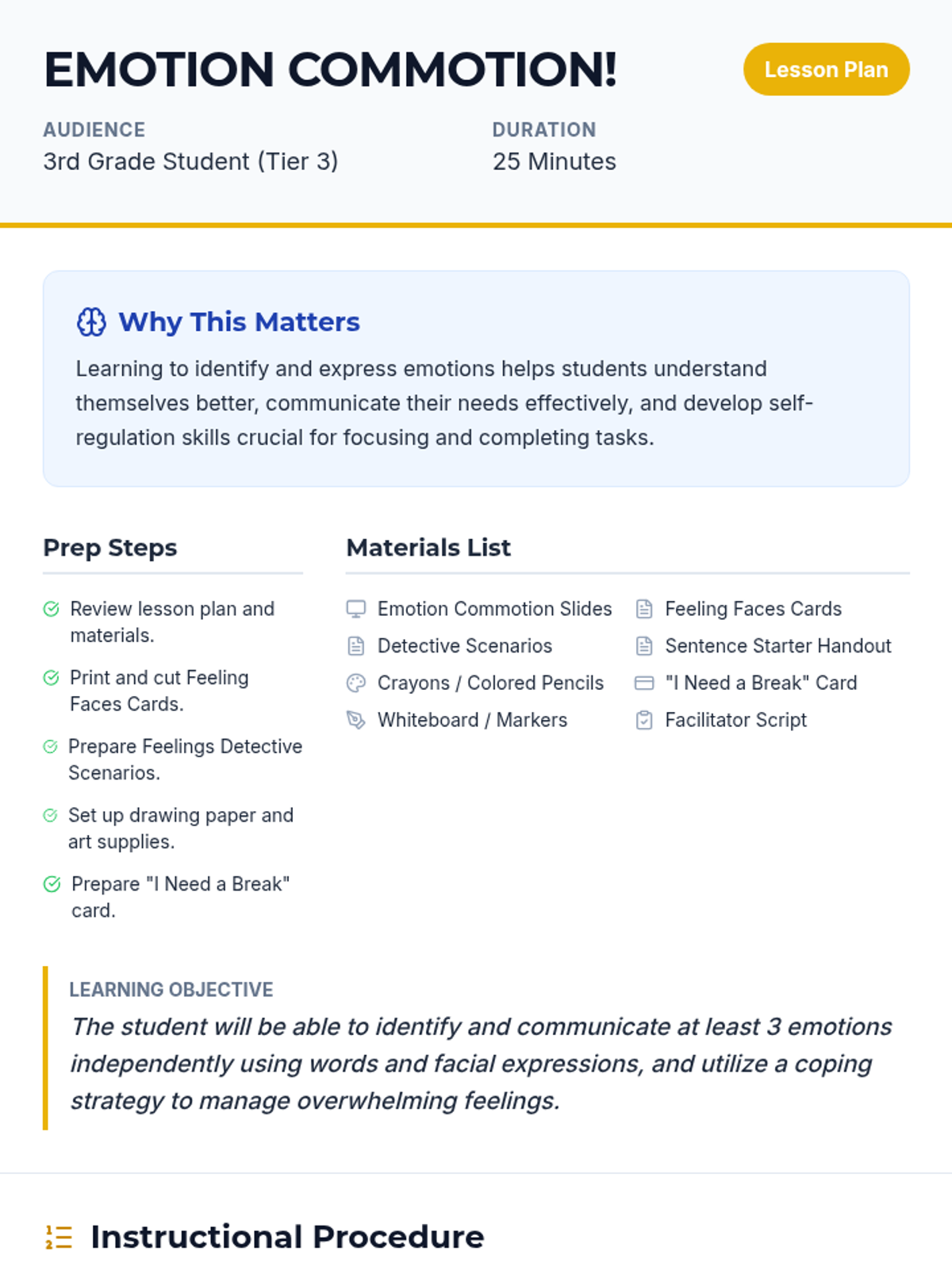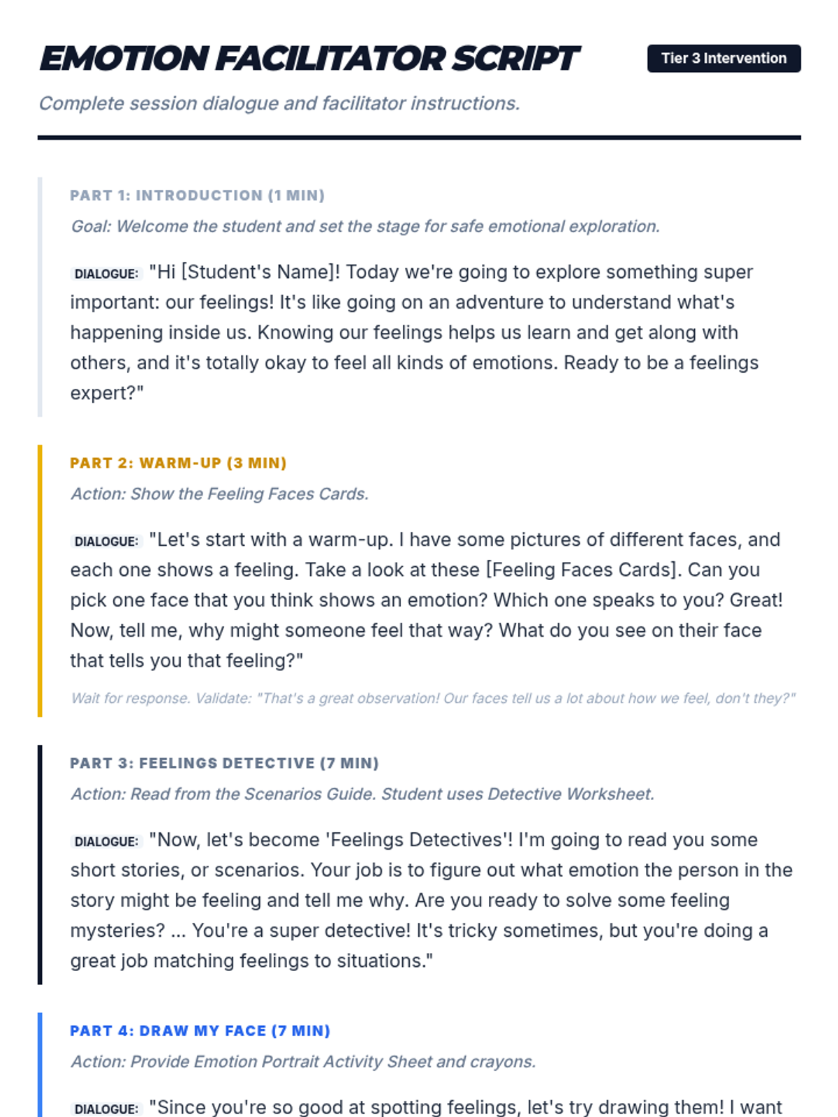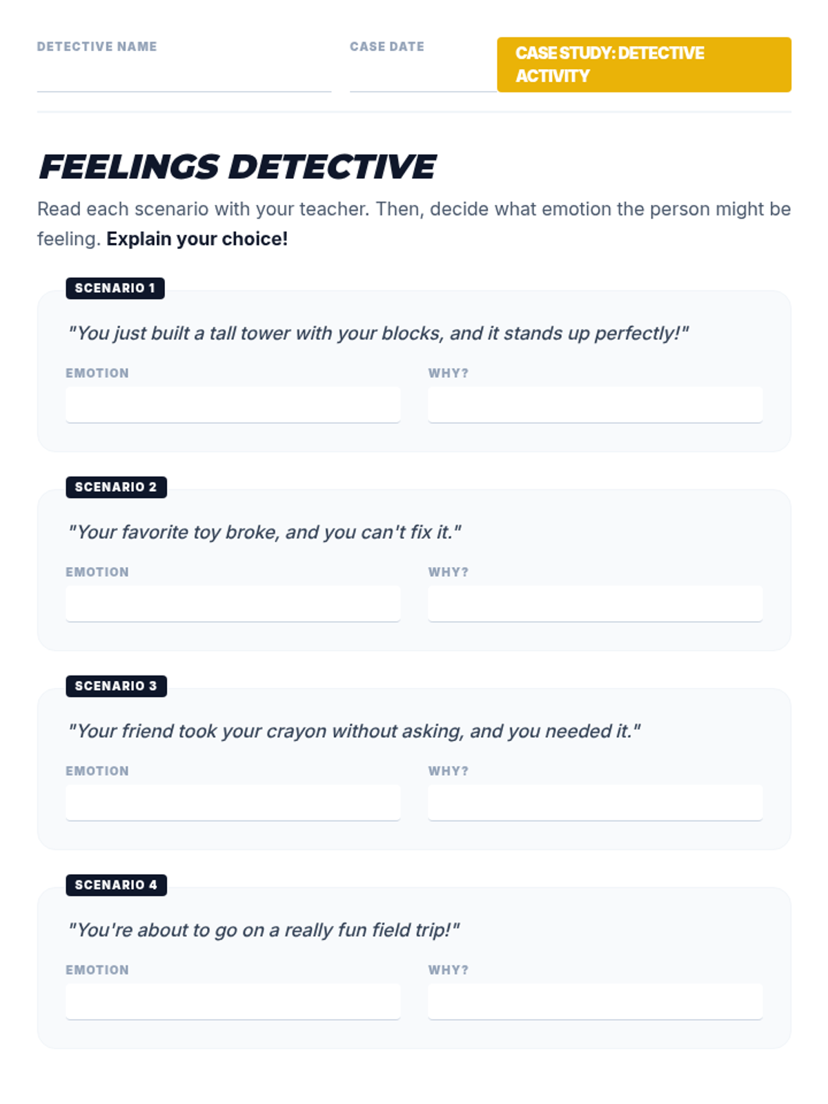 A Tier 3 intervention for 3rd-grade students to identify, communicate, and regulate emotions in real-time through interactive detective-themed activities.