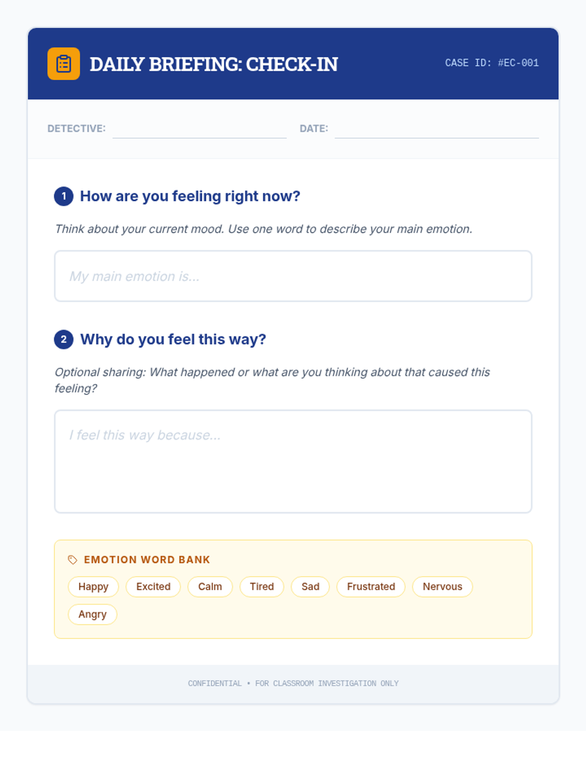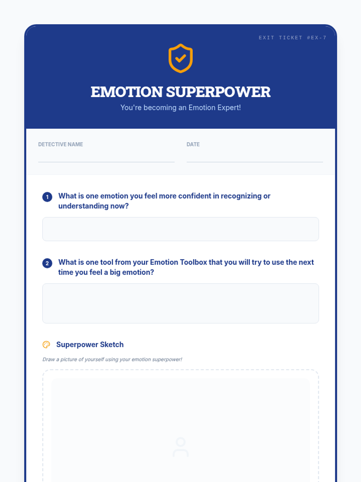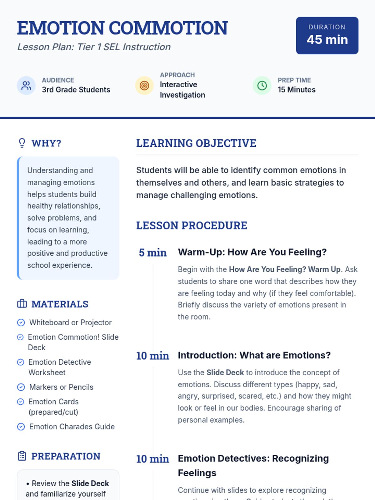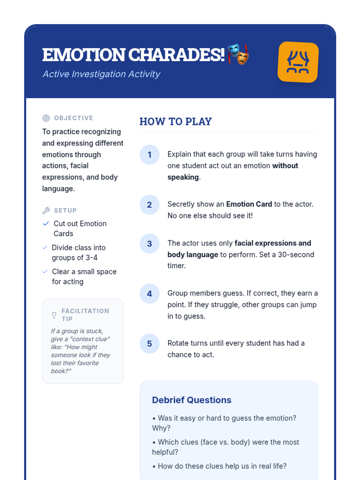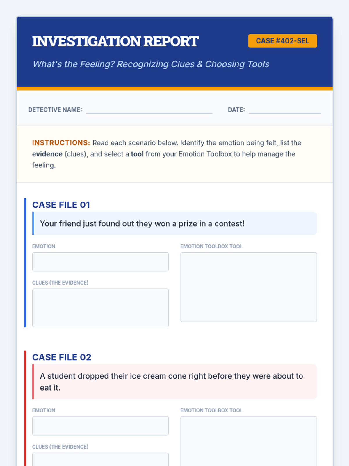 A 45-minute social-emotional learning lesson for 3rd graders designed to help them recognize emotions in themselves and others and build a toolbox of coping strategies through interactive investigation.