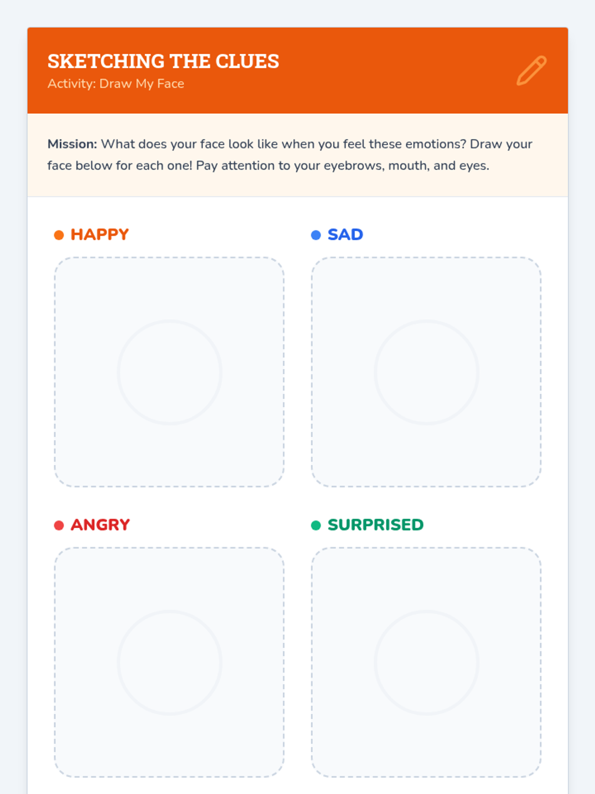 A foundational SEL lesson for Kindergarten students focusing on identifying basic emotions and simple social actions through drawing and play-based reflection.