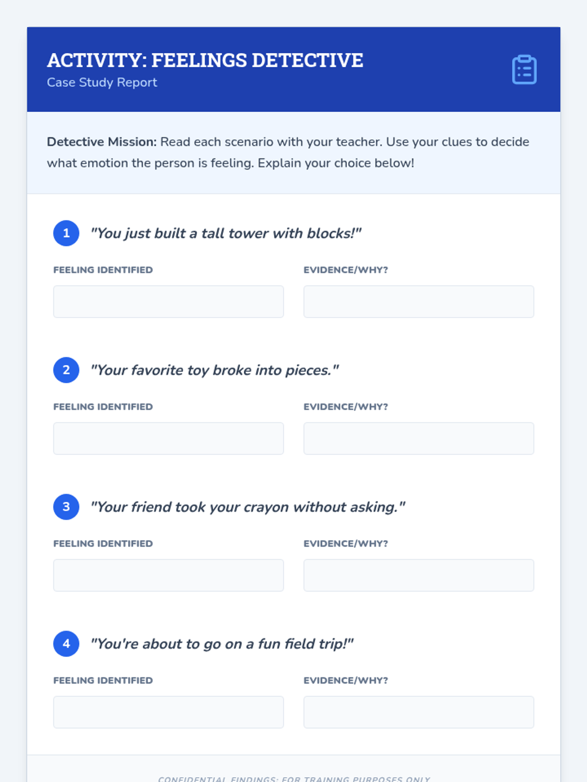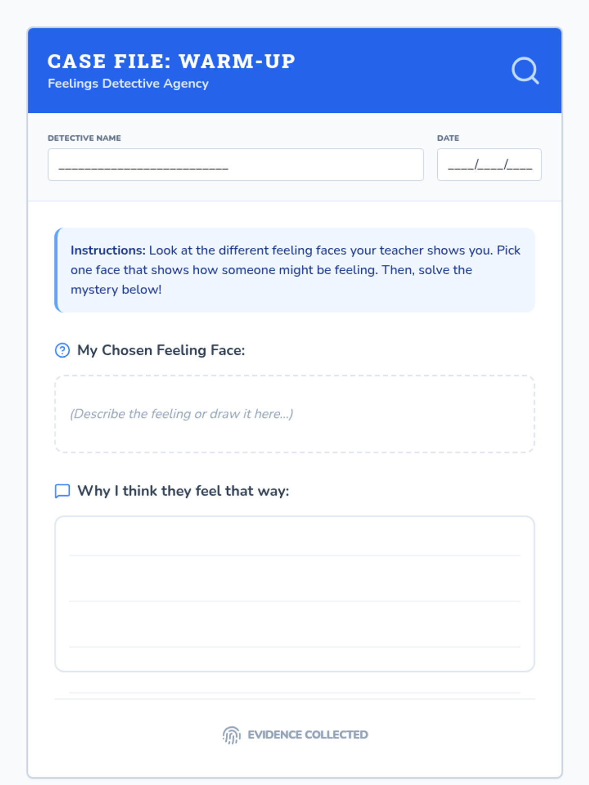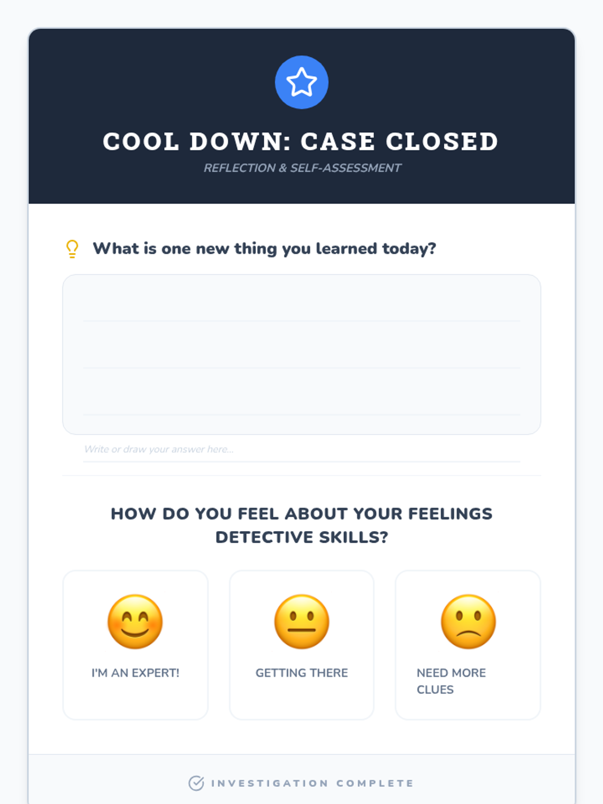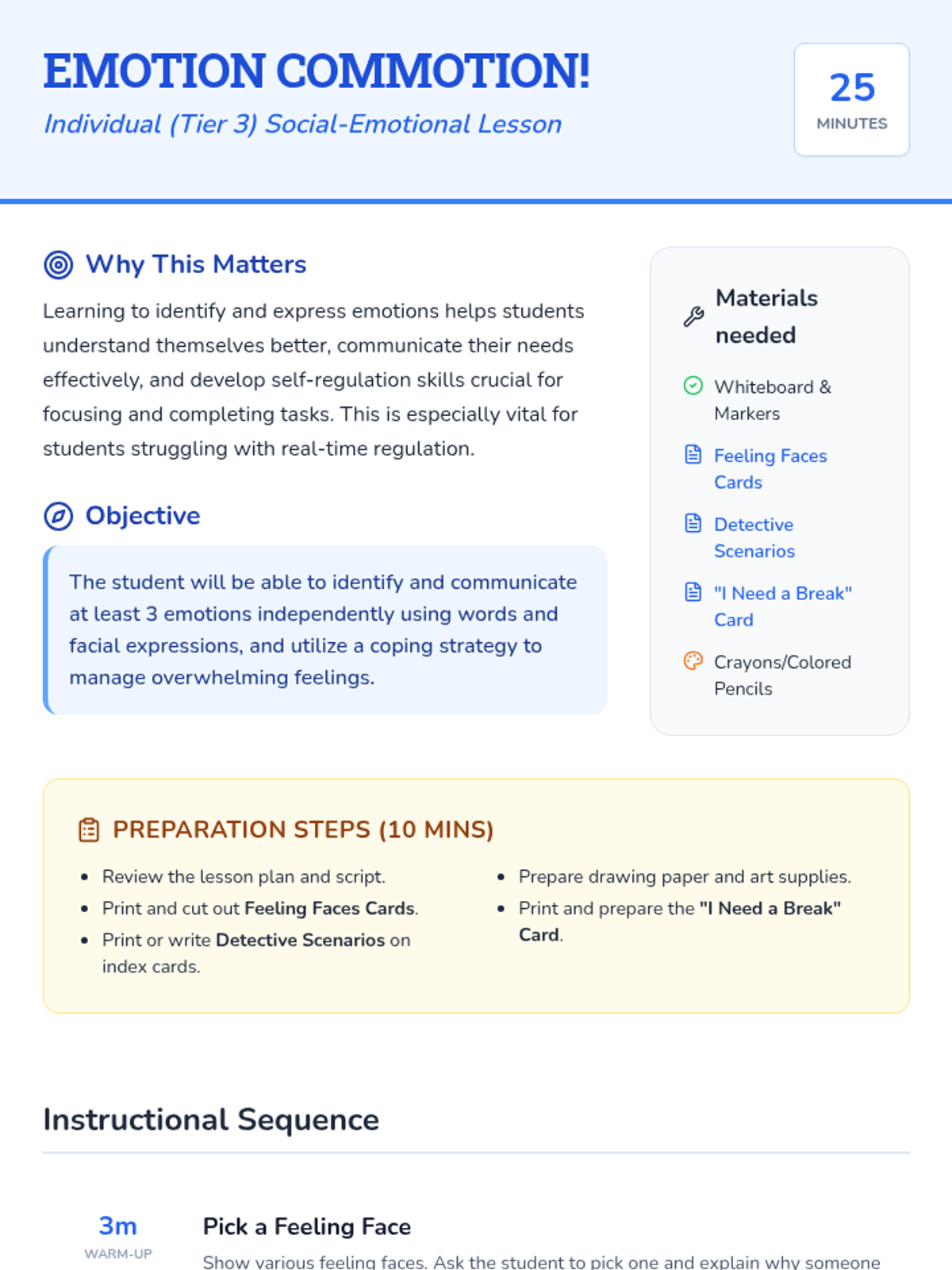 A 25-minute Tier 3 social-emotional learning lesson for 3rd grade focusing on real-time emotion identification and communication through detective-themed activities.