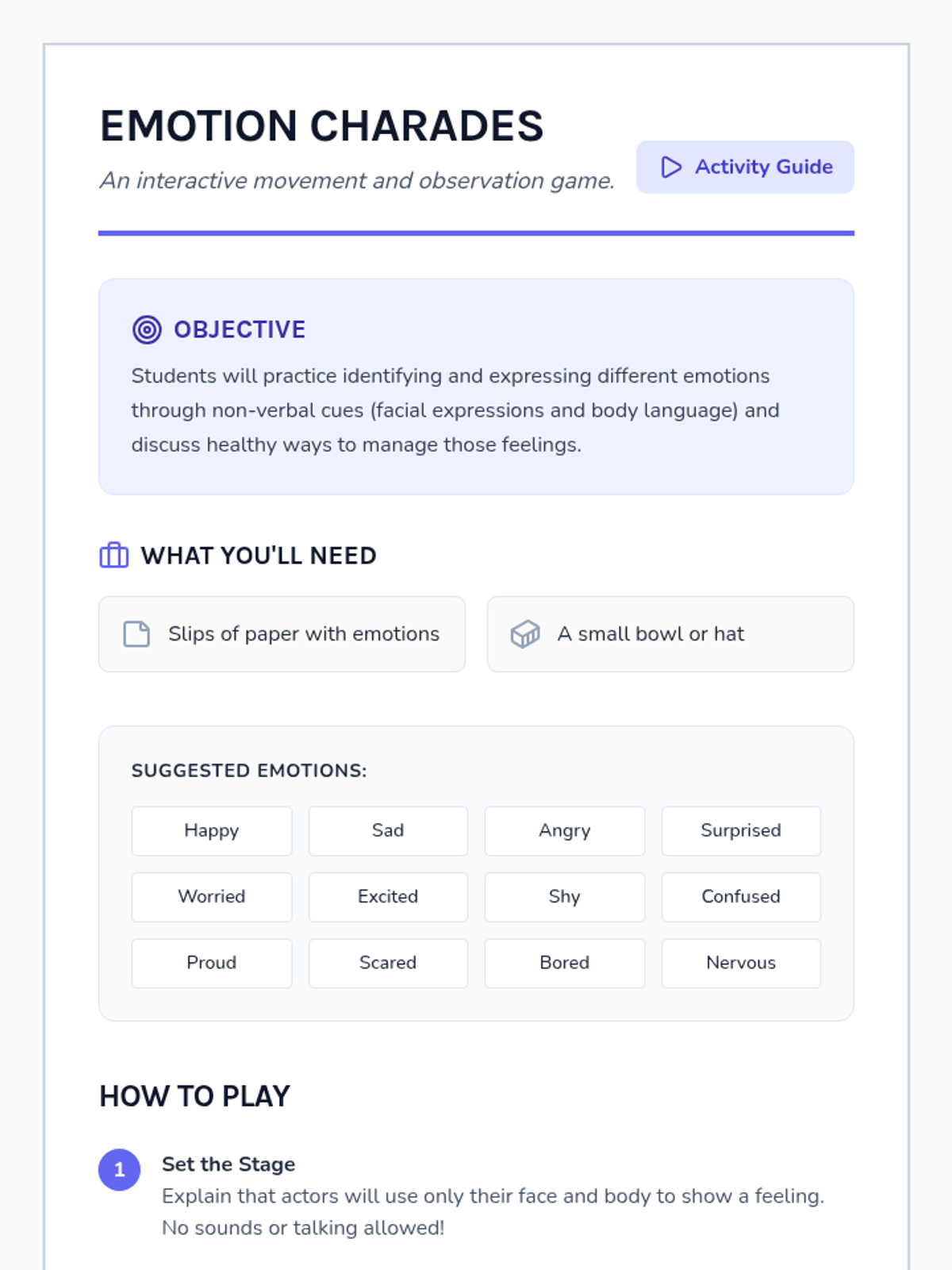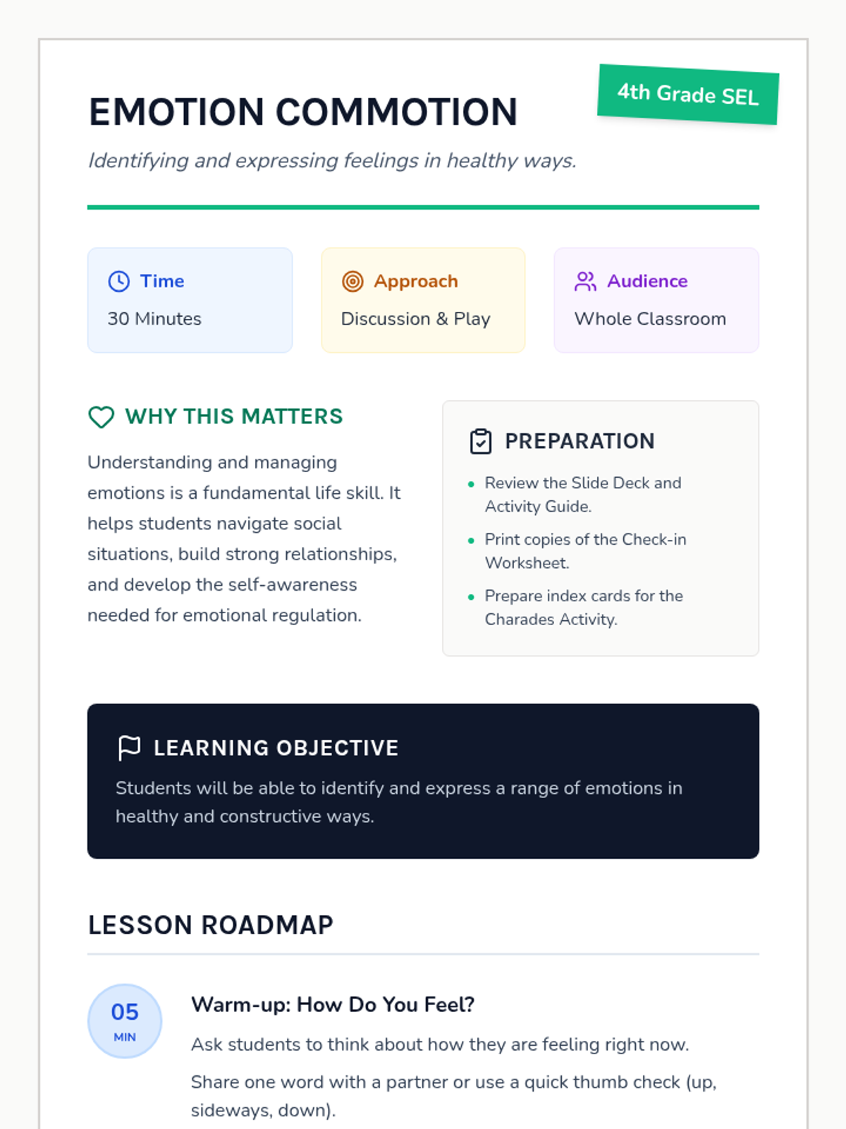 A 30-minute SEL lesson for 4th graders to identify, understand, and healthily express a range of emotions through discussion, charades, and personal reflection.