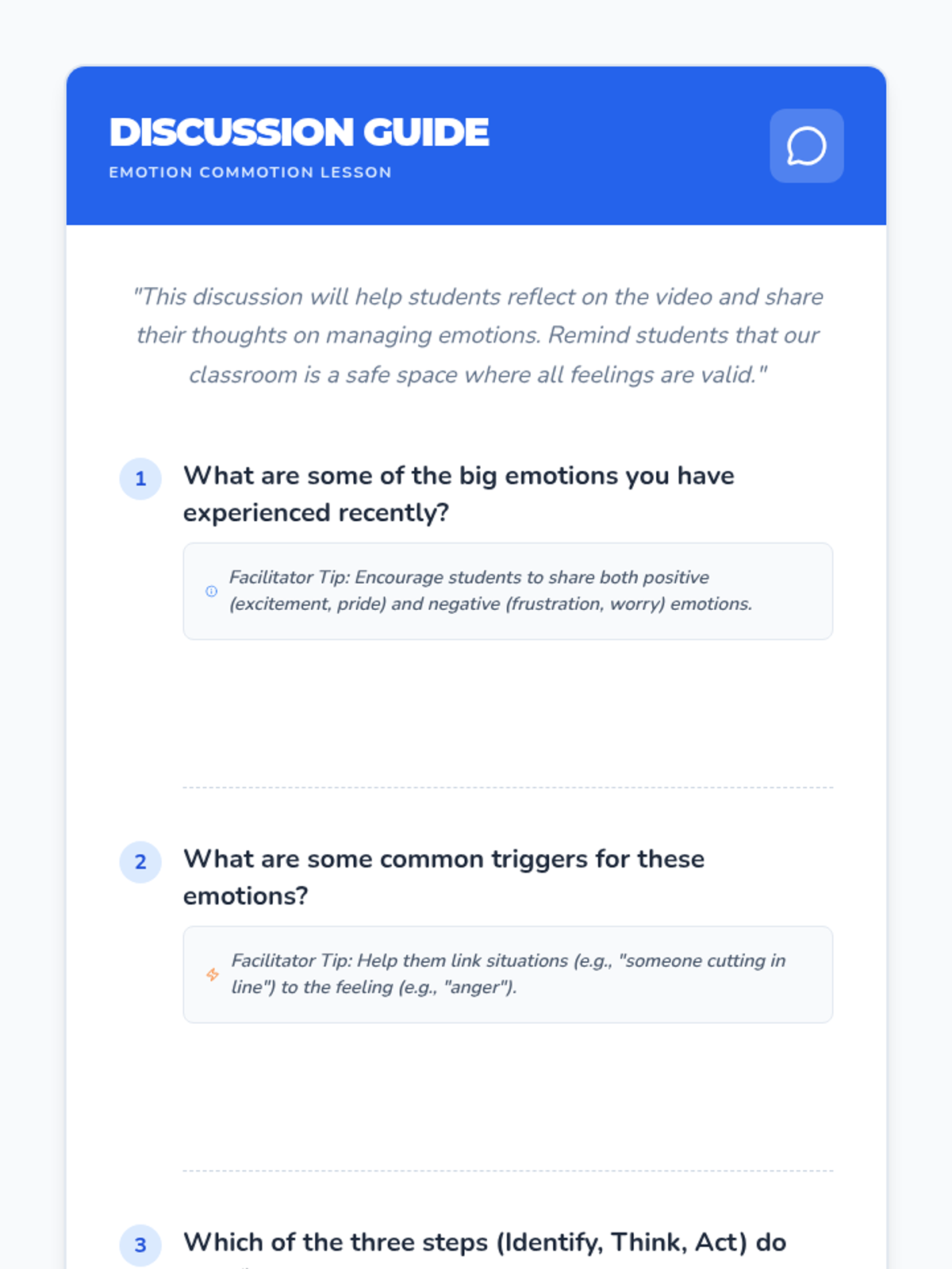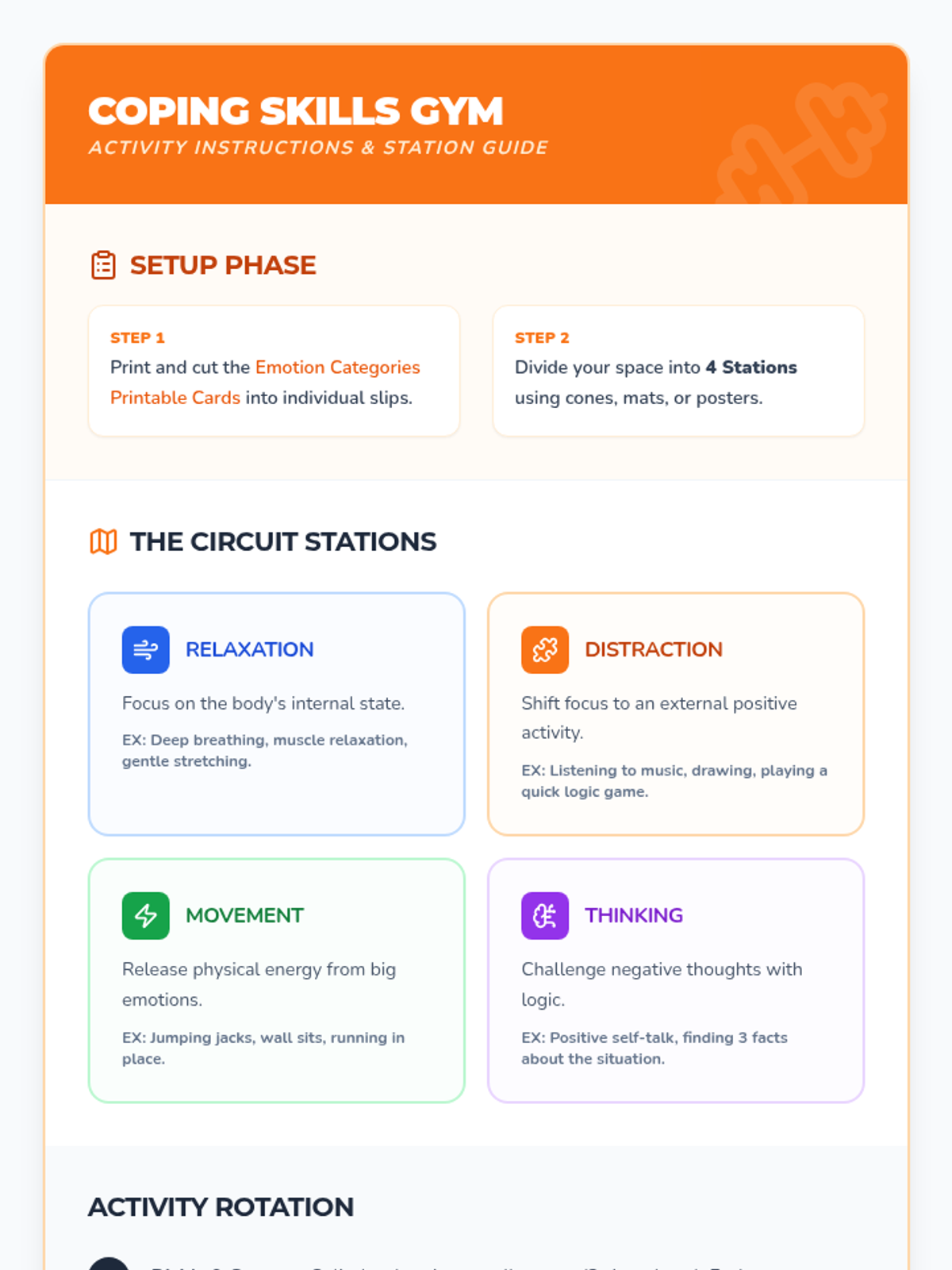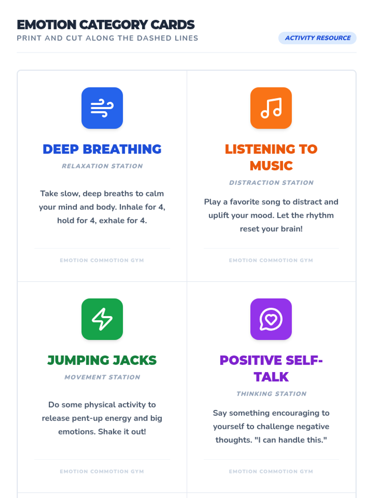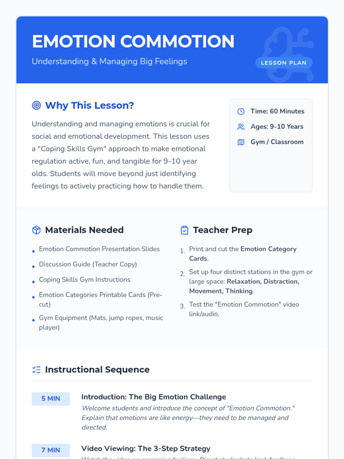 A high-energy, interactive lesson for 9-10 year olds focused on identifying, processing, and managing big emotions through a 'Gym Activity' approach. Students learn the three-step process of Identify, Think, and Act to build emotional resilience and healthy coping mechanisms.