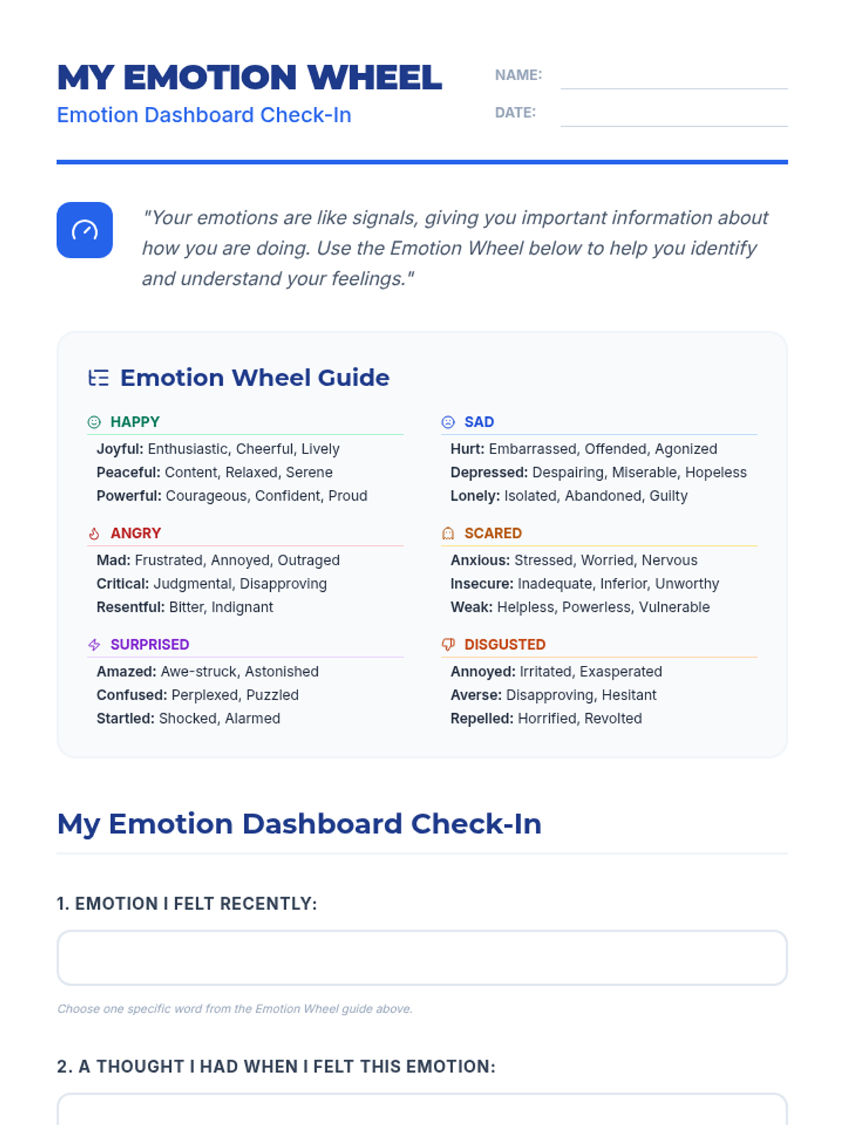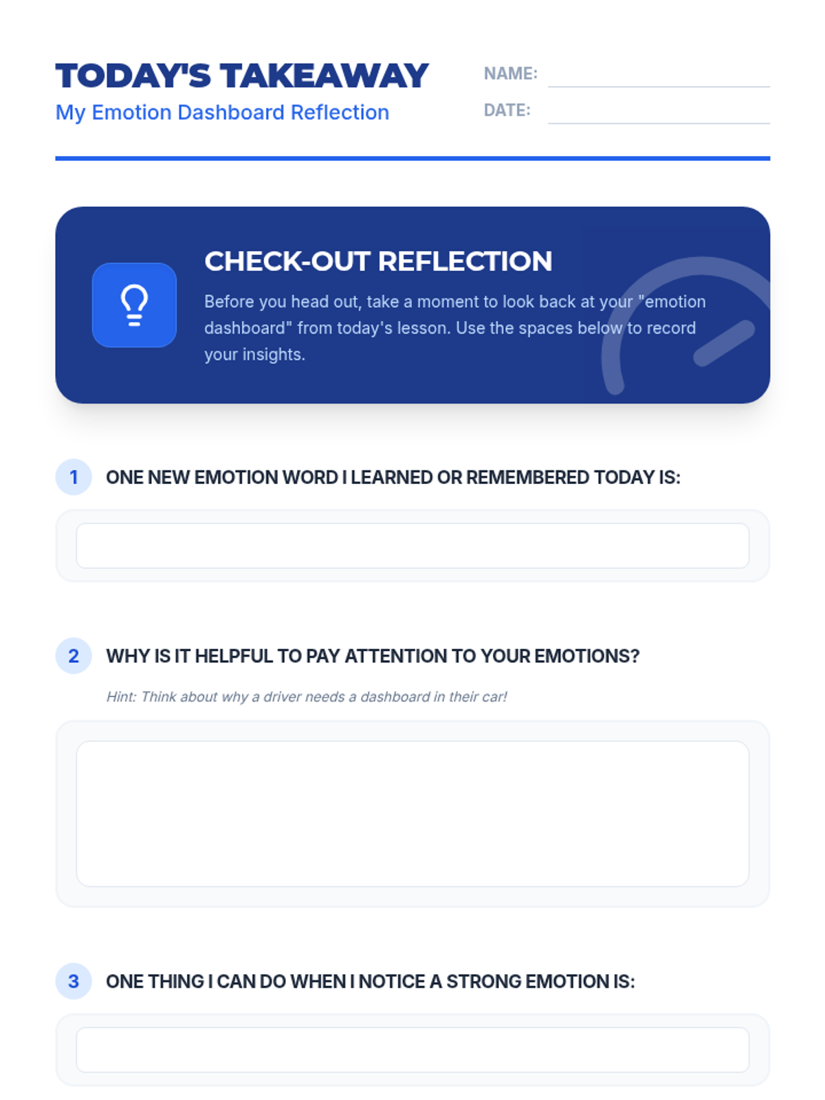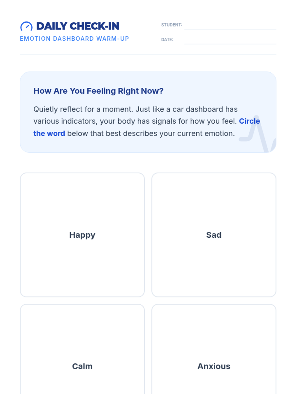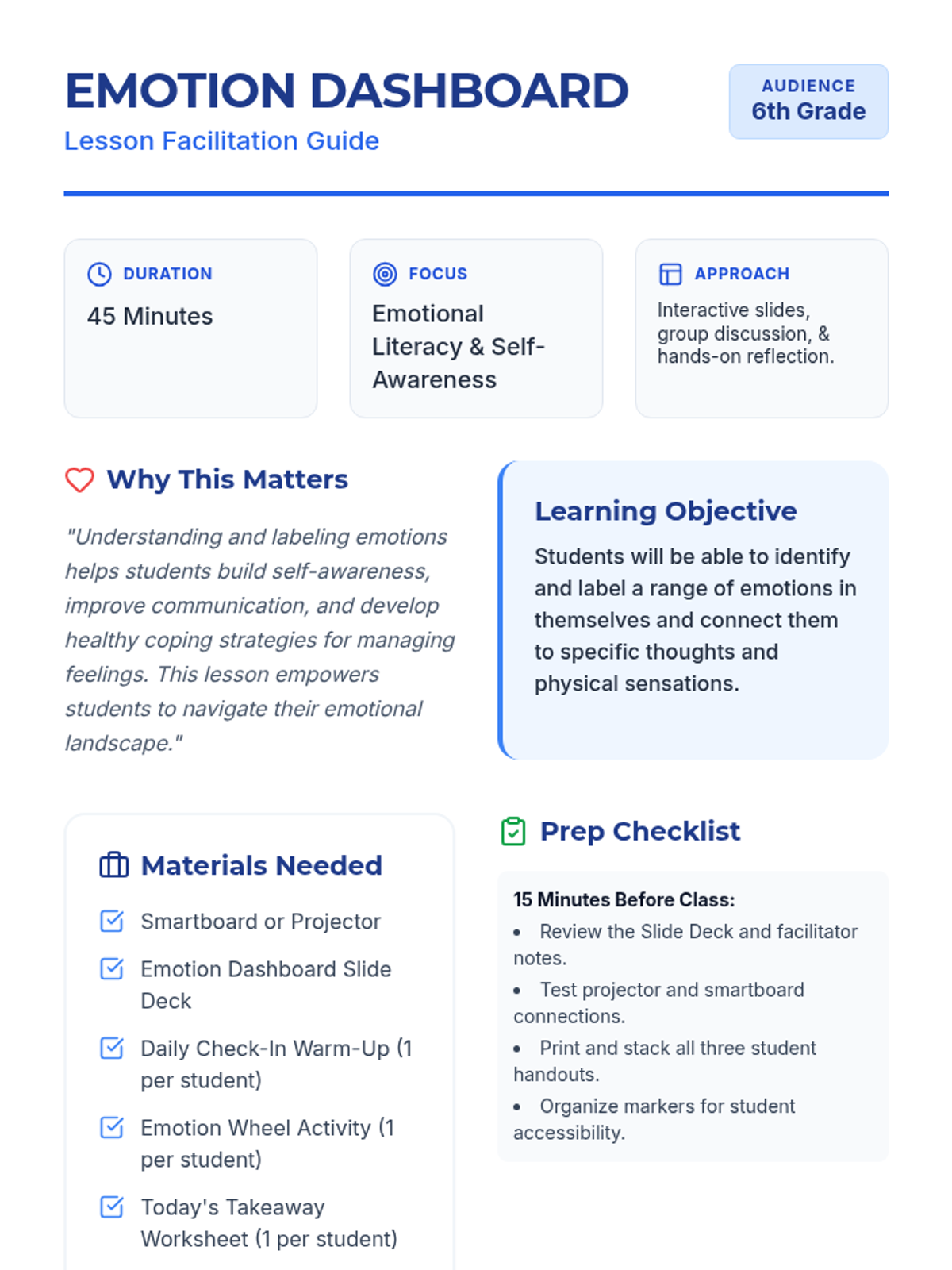 A social-emotional learning lesson for 6th graders to identify and label emotions by connecting them to thoughts and physical sensations using a car dashboard analogy.
