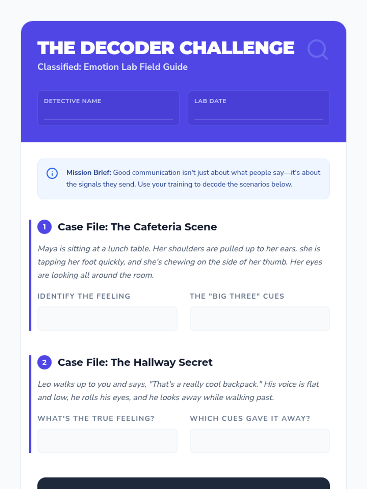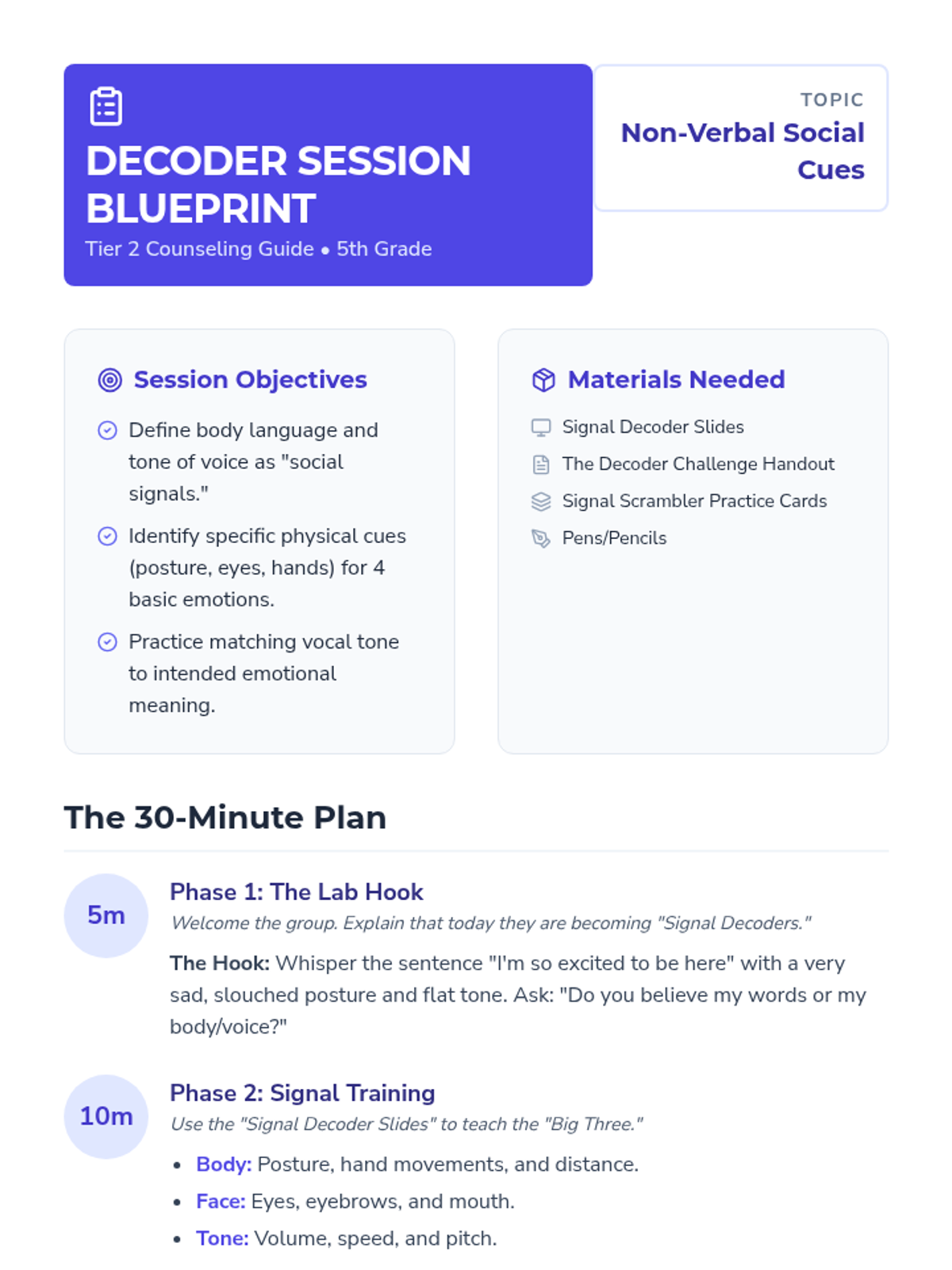 A Tier 2 small group counseling lesson designed for 5th graders to master the art of reading social cues. Students learn to decode non-verbal signals like body language and vocal tone to better understand the feelings of others.