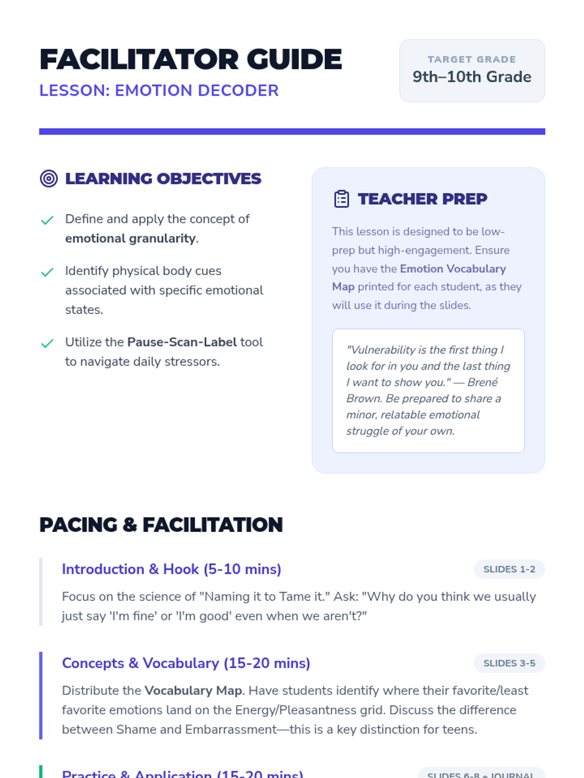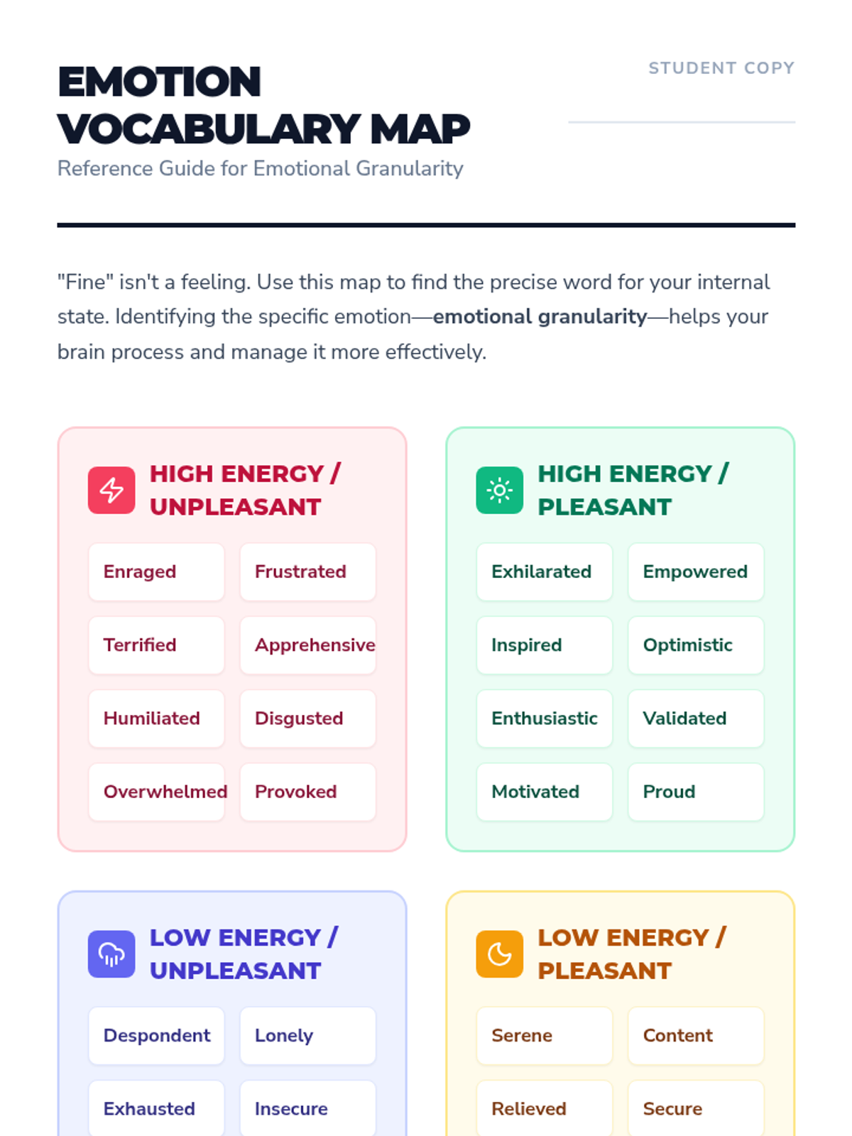 A lesson designed for high schoolers to develop emotional granularity, moving beyond basic labels to recognize the complex physical and mental states of daily teen life.