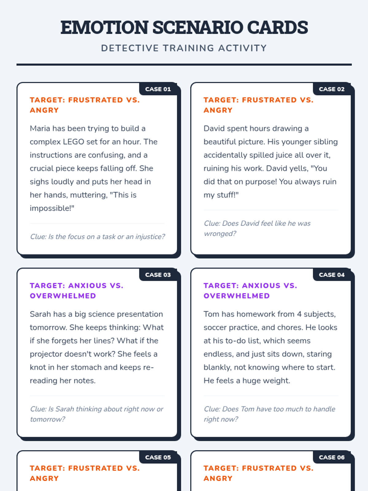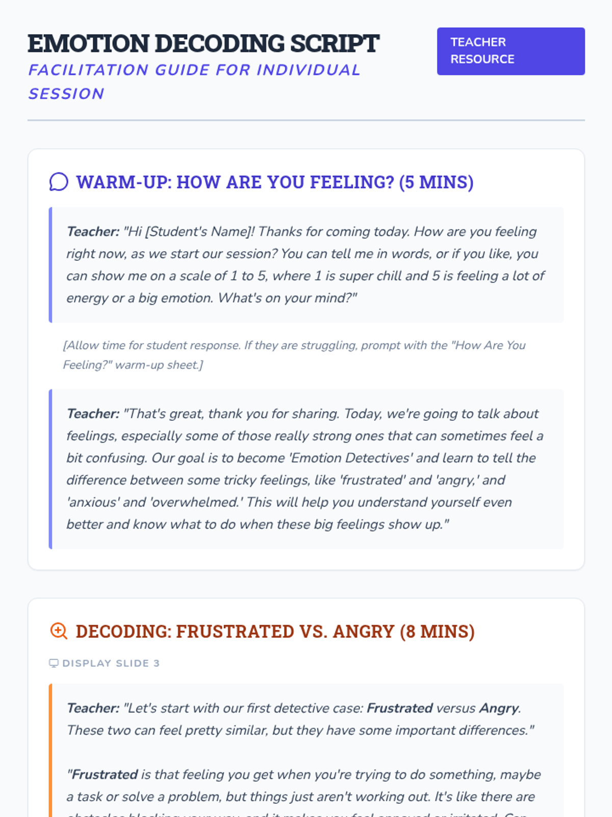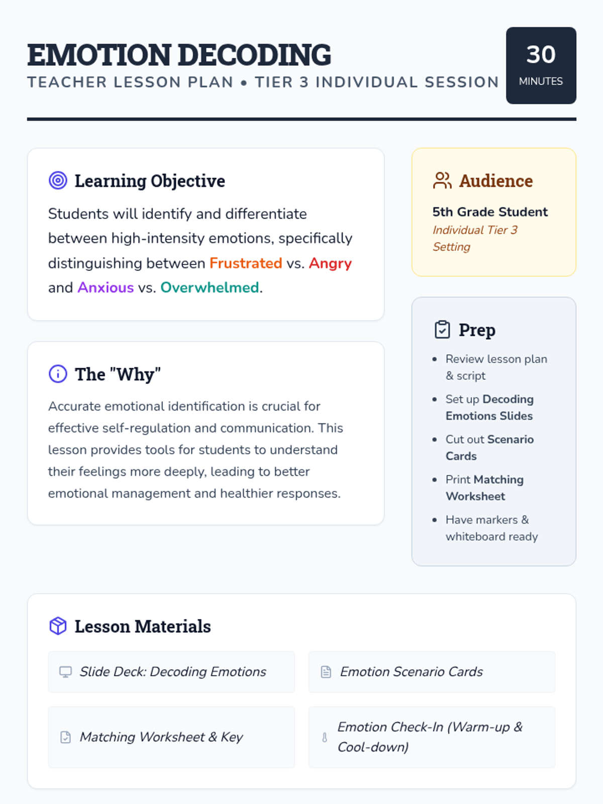 A 30-minute Tier 3 individual lesson for 5th graders to differentiate between high-intensity emotions like frustration vs. anger and anxiety vs. overwhelm. Students act as 'Emotion Detectives' to decode their feelings and develop better self-regulation skills.