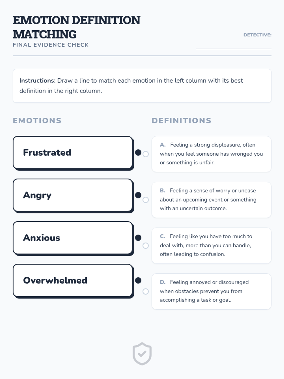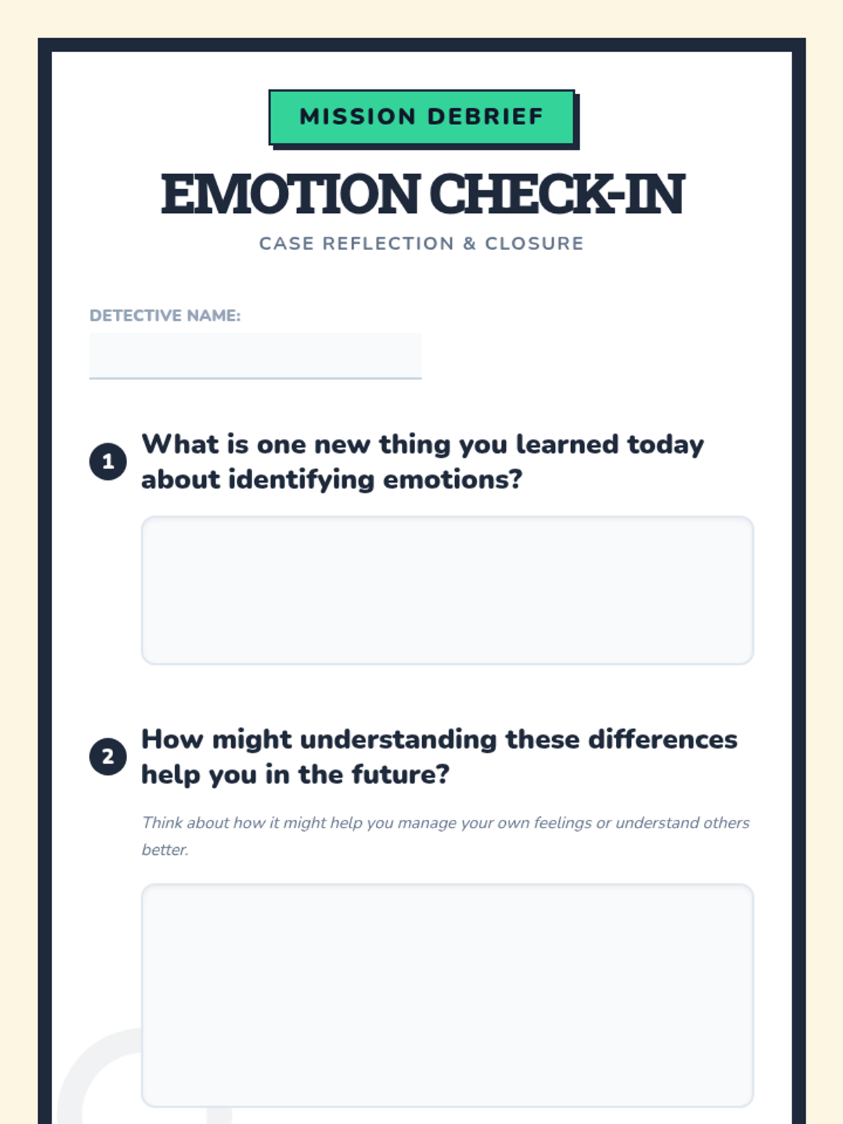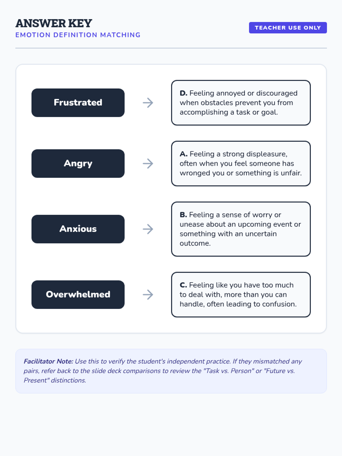 A 30-minute Tier 3 individual lesson for 5th graders to differentiate between high-intensity emotions like frustration vs. anger and anxiety vs. overwhelm. Students act as 'Emotion Detectives' to decode their feelings and develop better self-regulation skills.