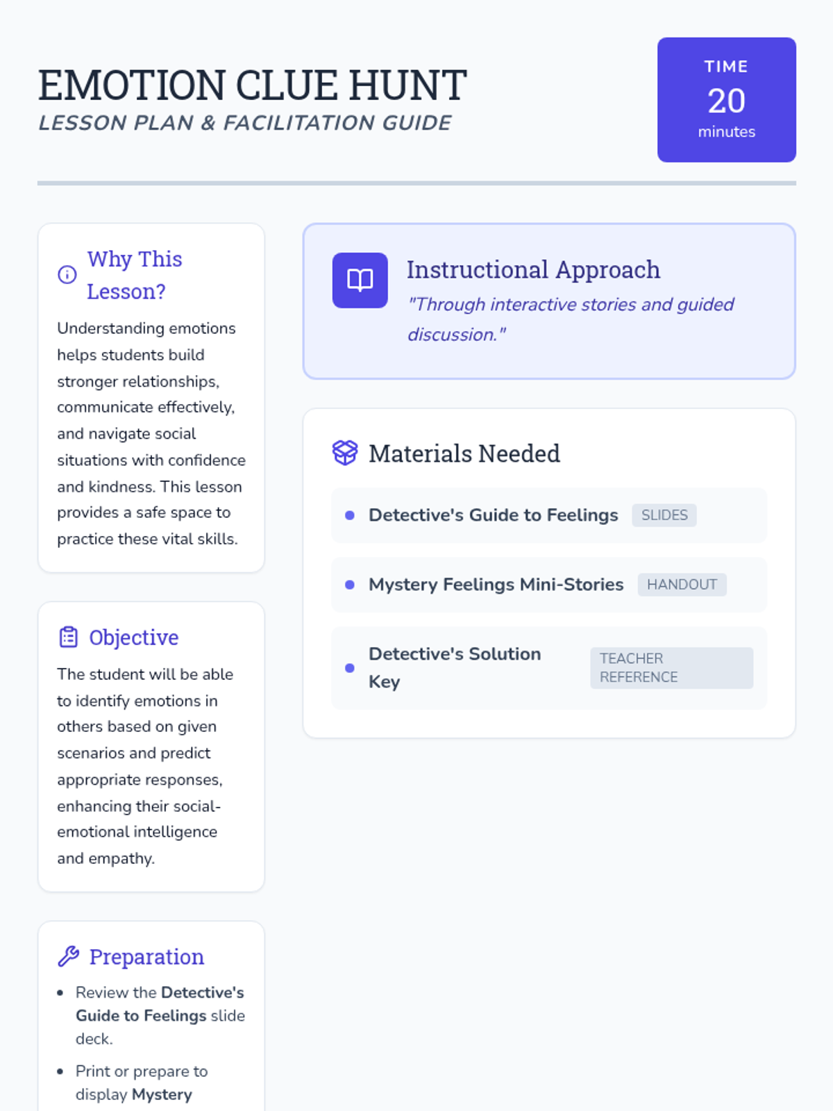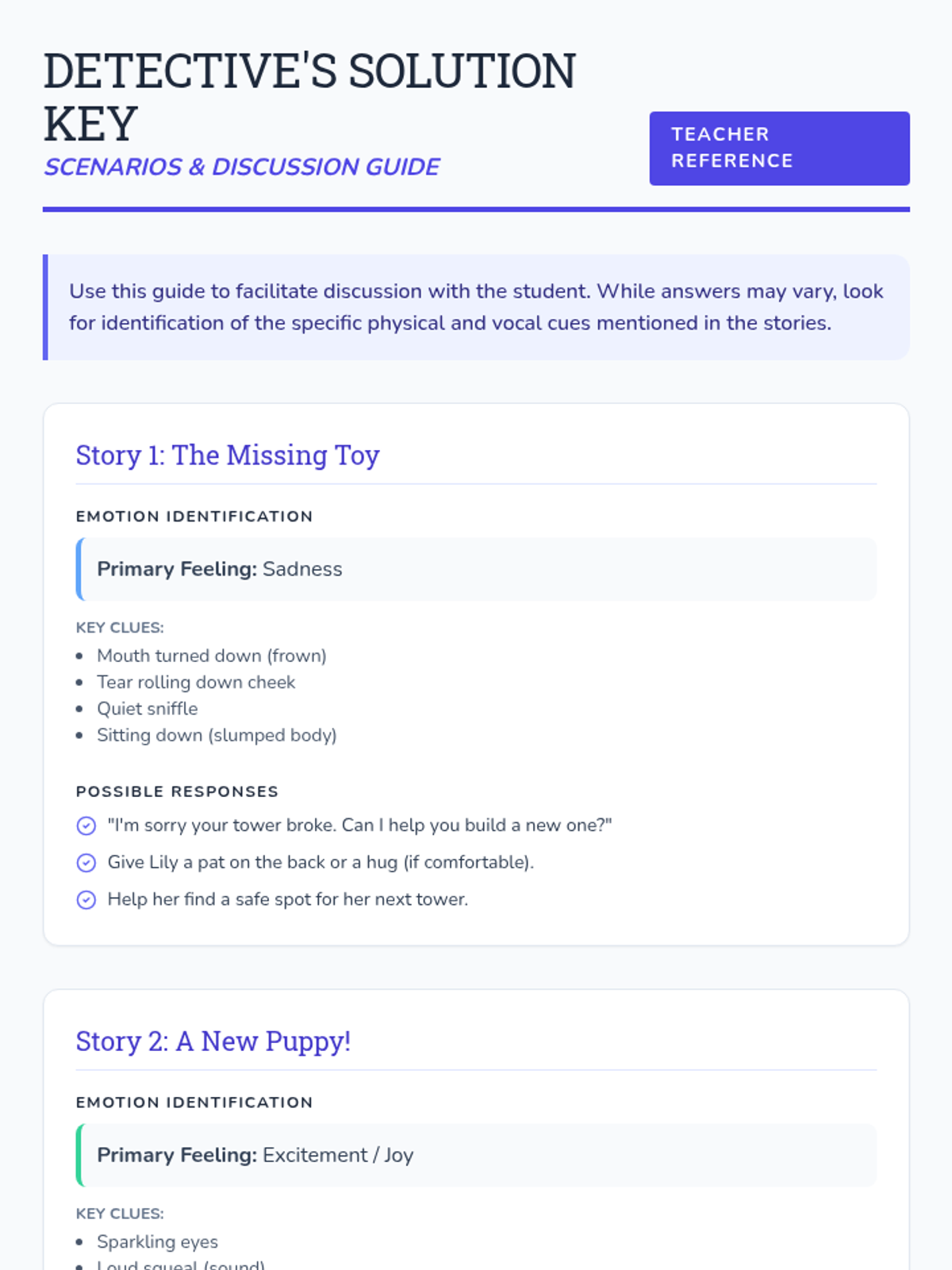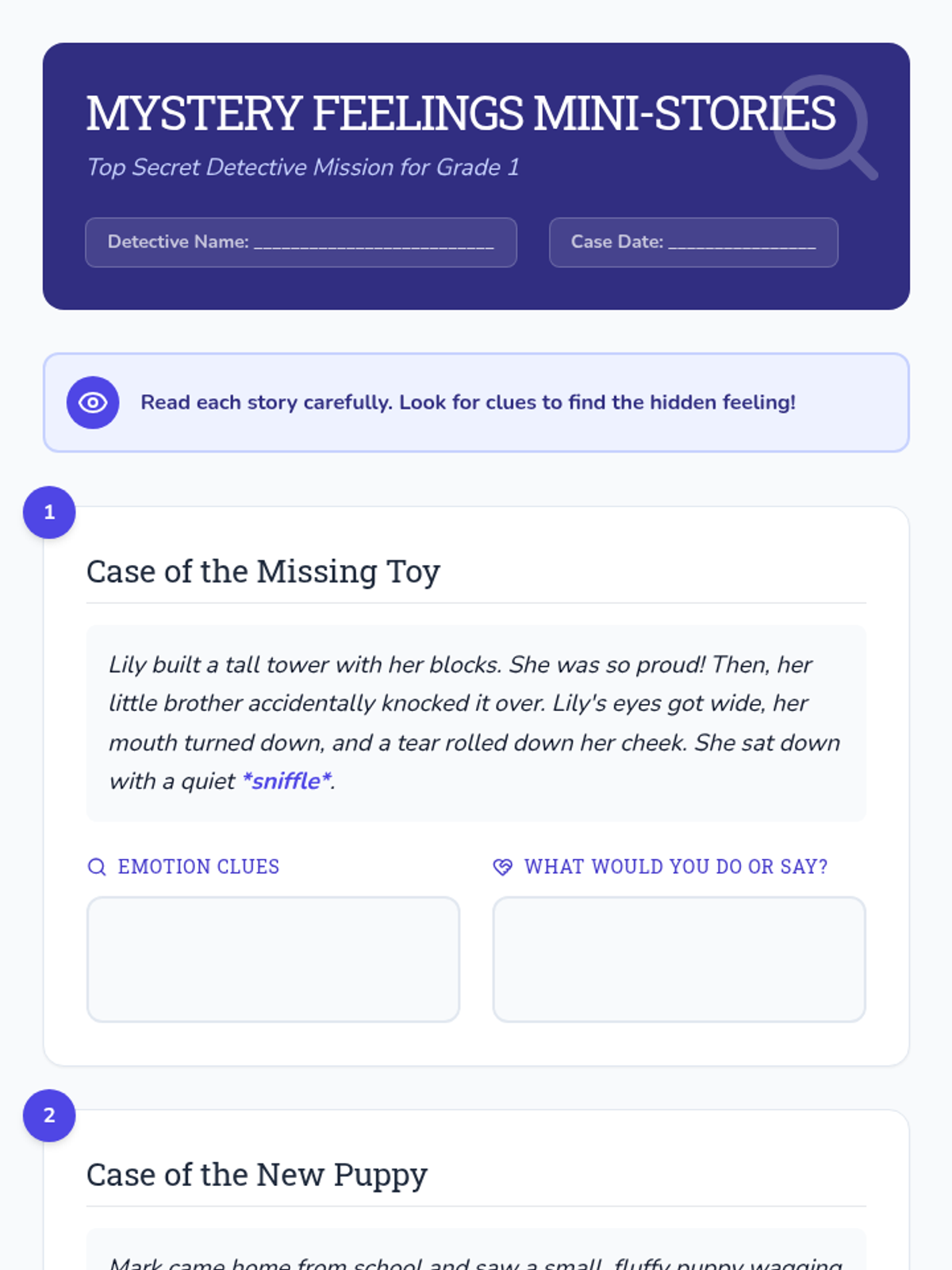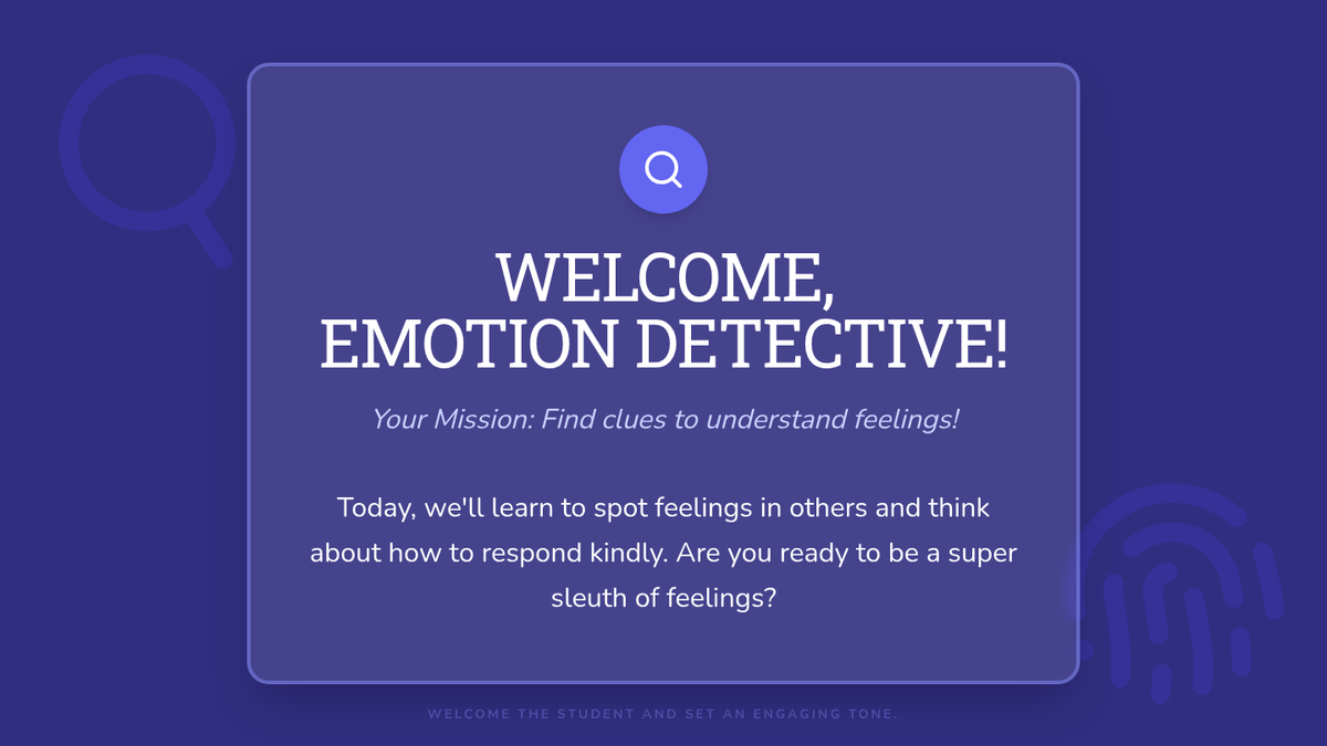 An individual Tier 3 lesson for 1st grade students focused on identifying emotions through 'detective' clues and practicing empathetic responses to social scenarios.