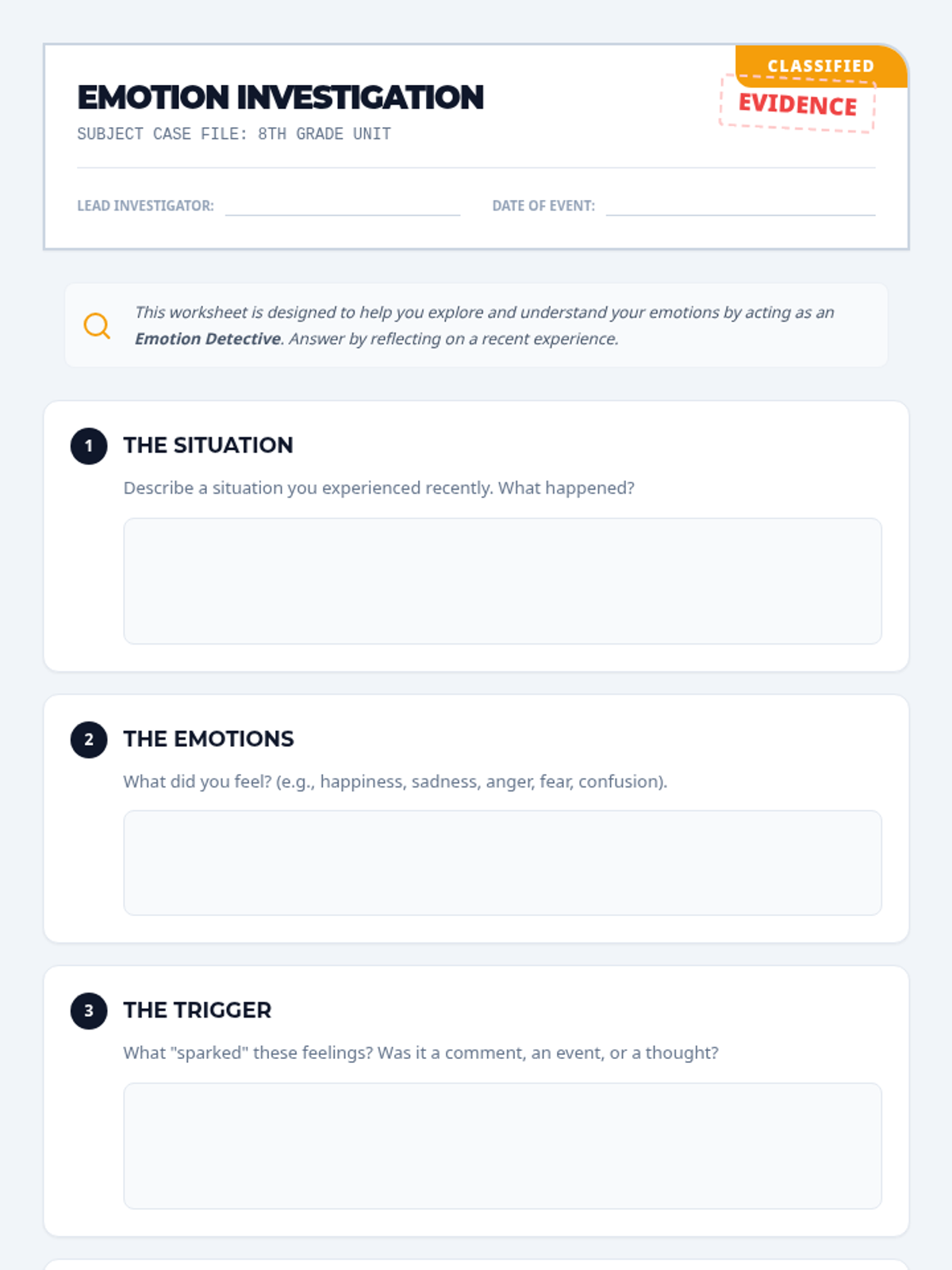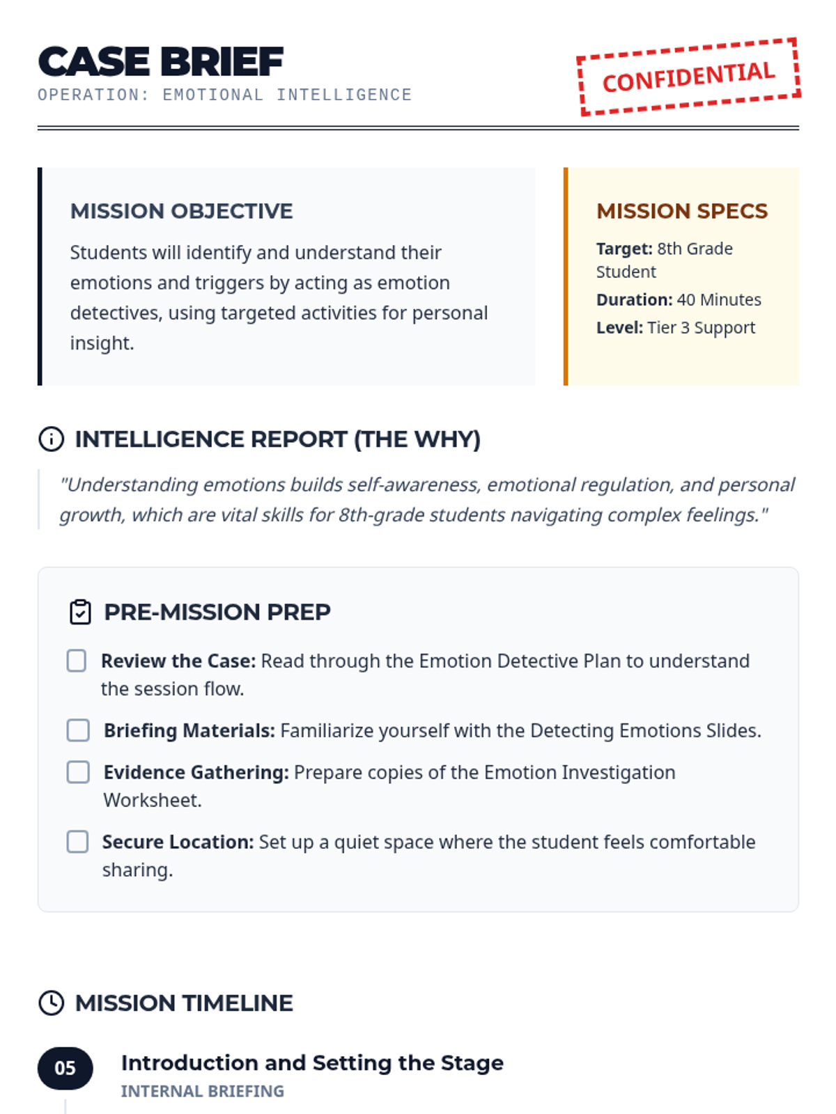 A Tier 3 individual support session designed to help 8th-grade students identify, understand, and track their emotions and triggers using a detective-themed investigative approach.