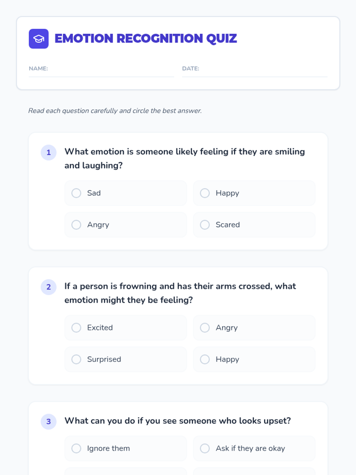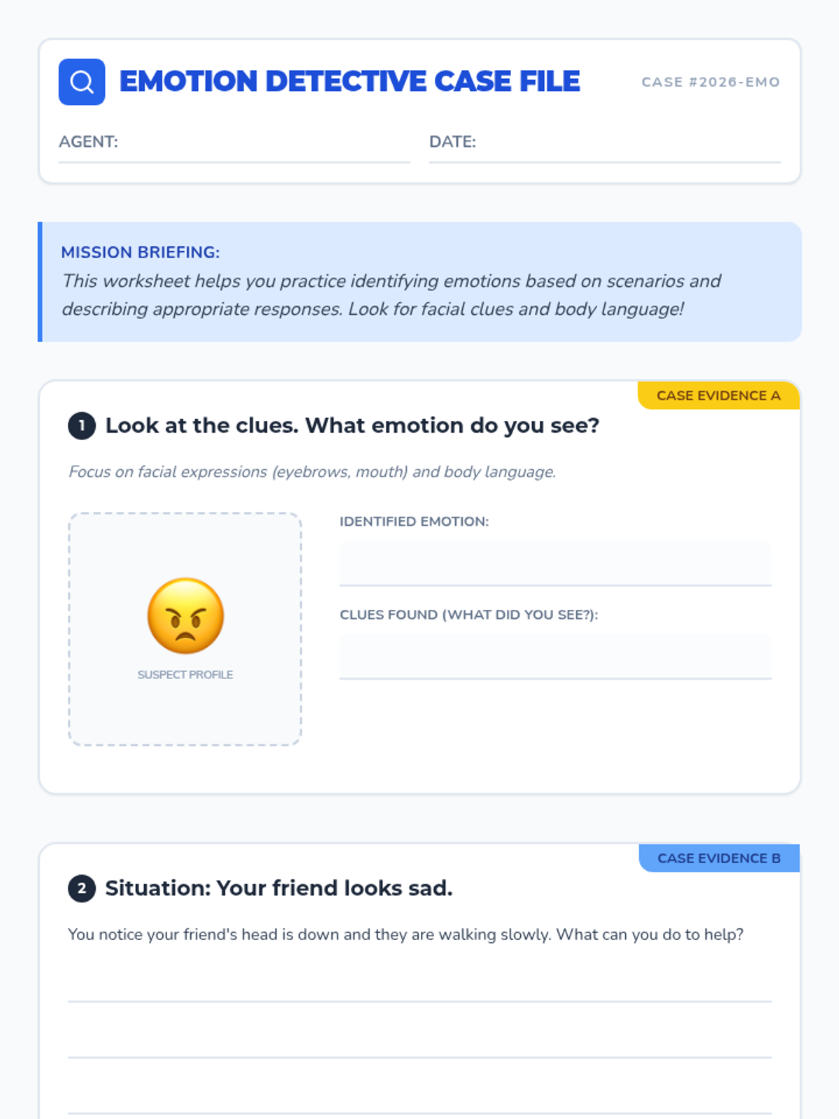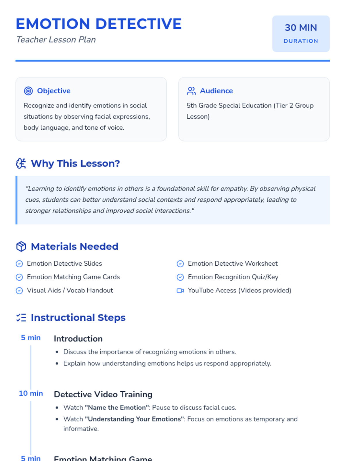 In this introductory lesson, students learn to identify emotions in others by observing facial expressions, body language, and tone of voice. They practice their skills through videos, a matching game, and scenario-based worksheets.