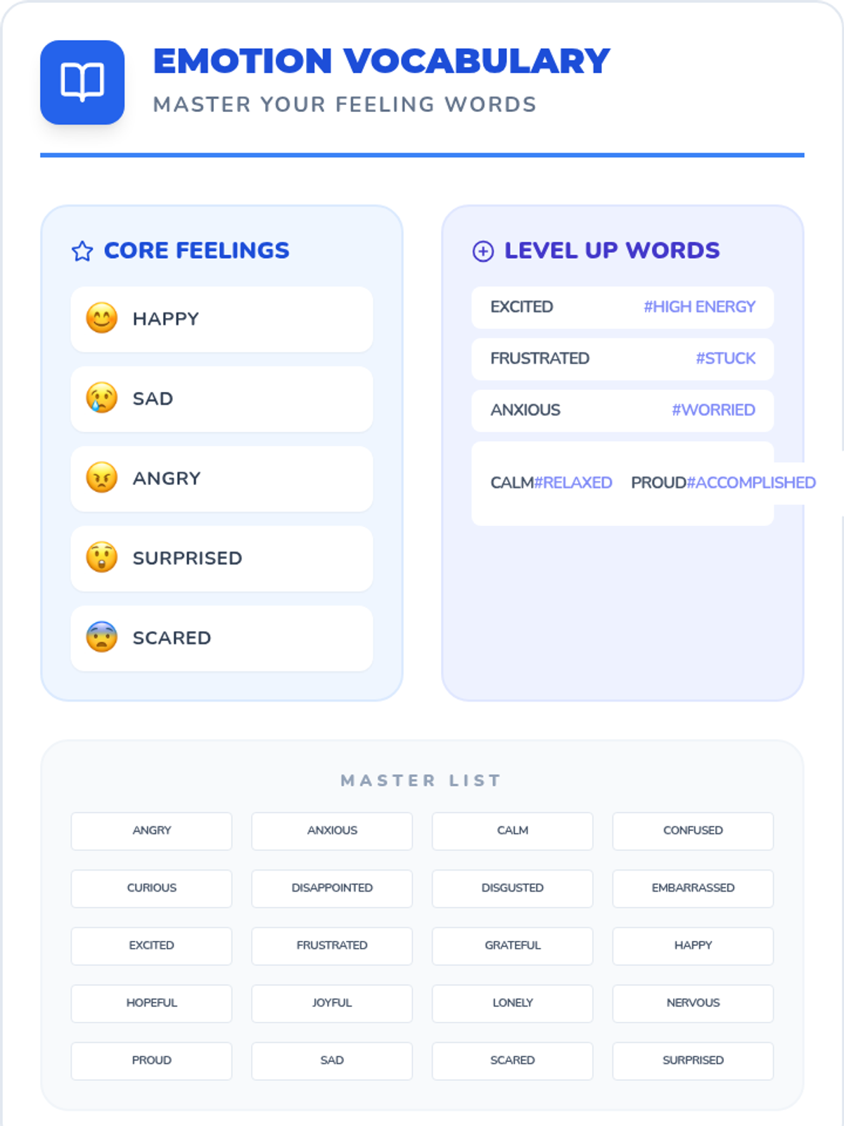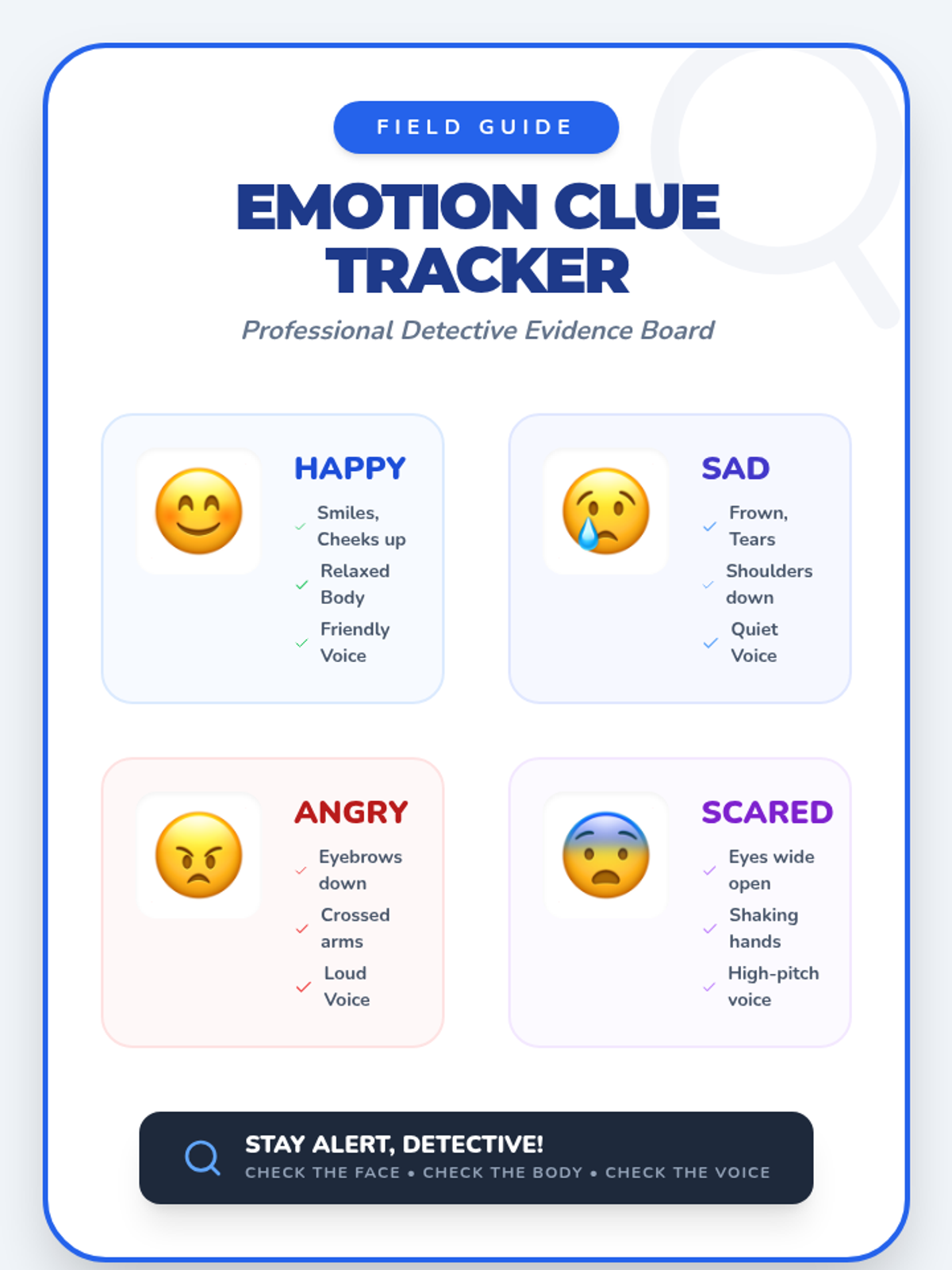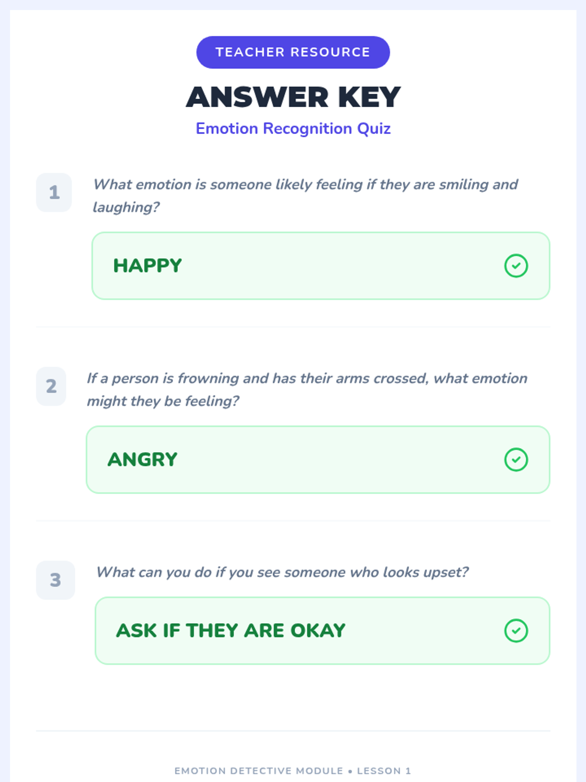 In this introductory lesson, students learn to identify emotions in others by observing facial expressions, body language, and tone of voice. They practice their skills through videos, a matching game, and scenario-based worksheets.