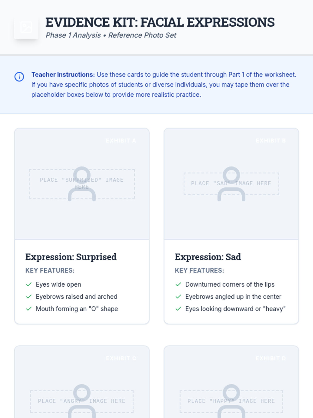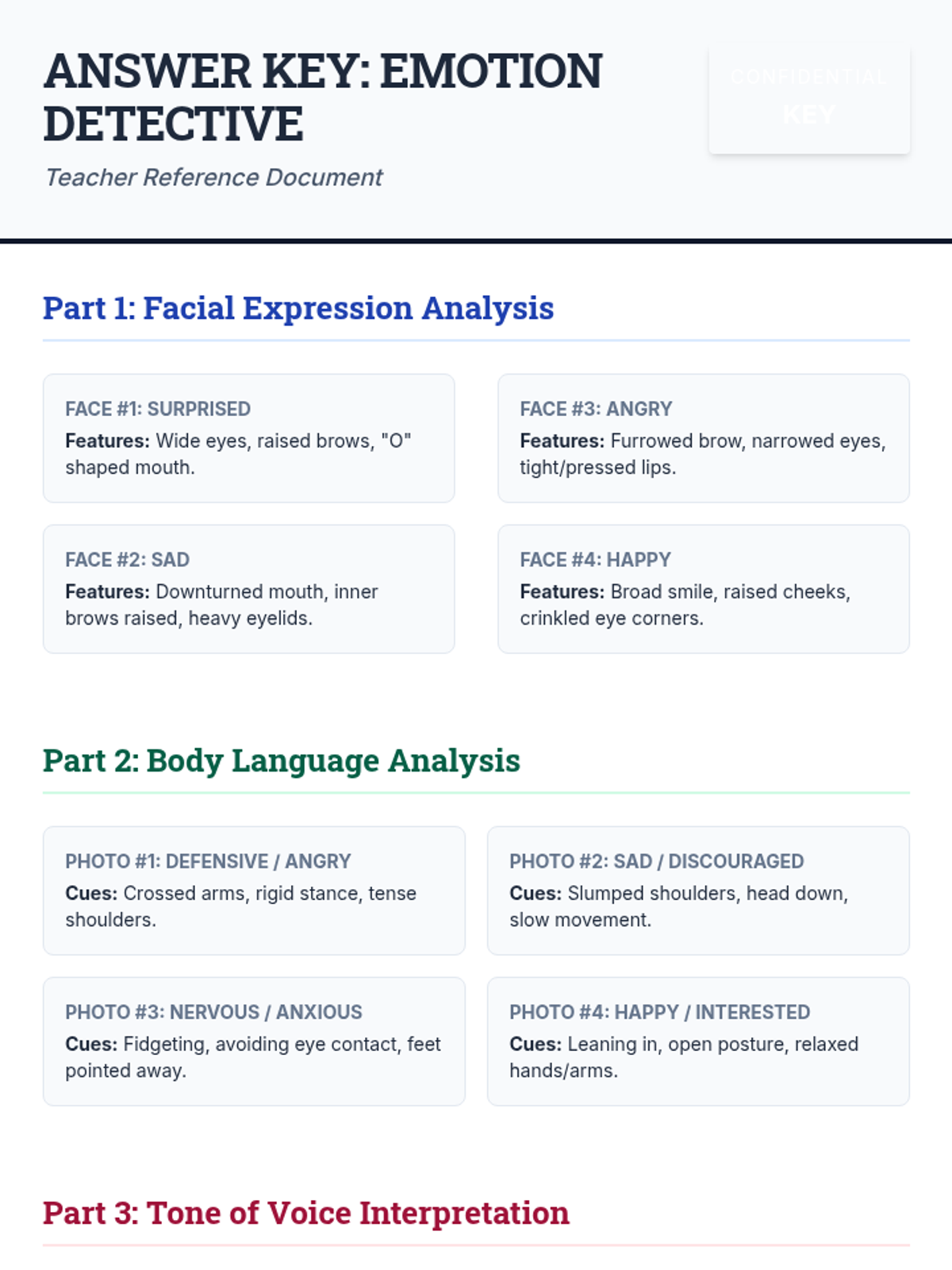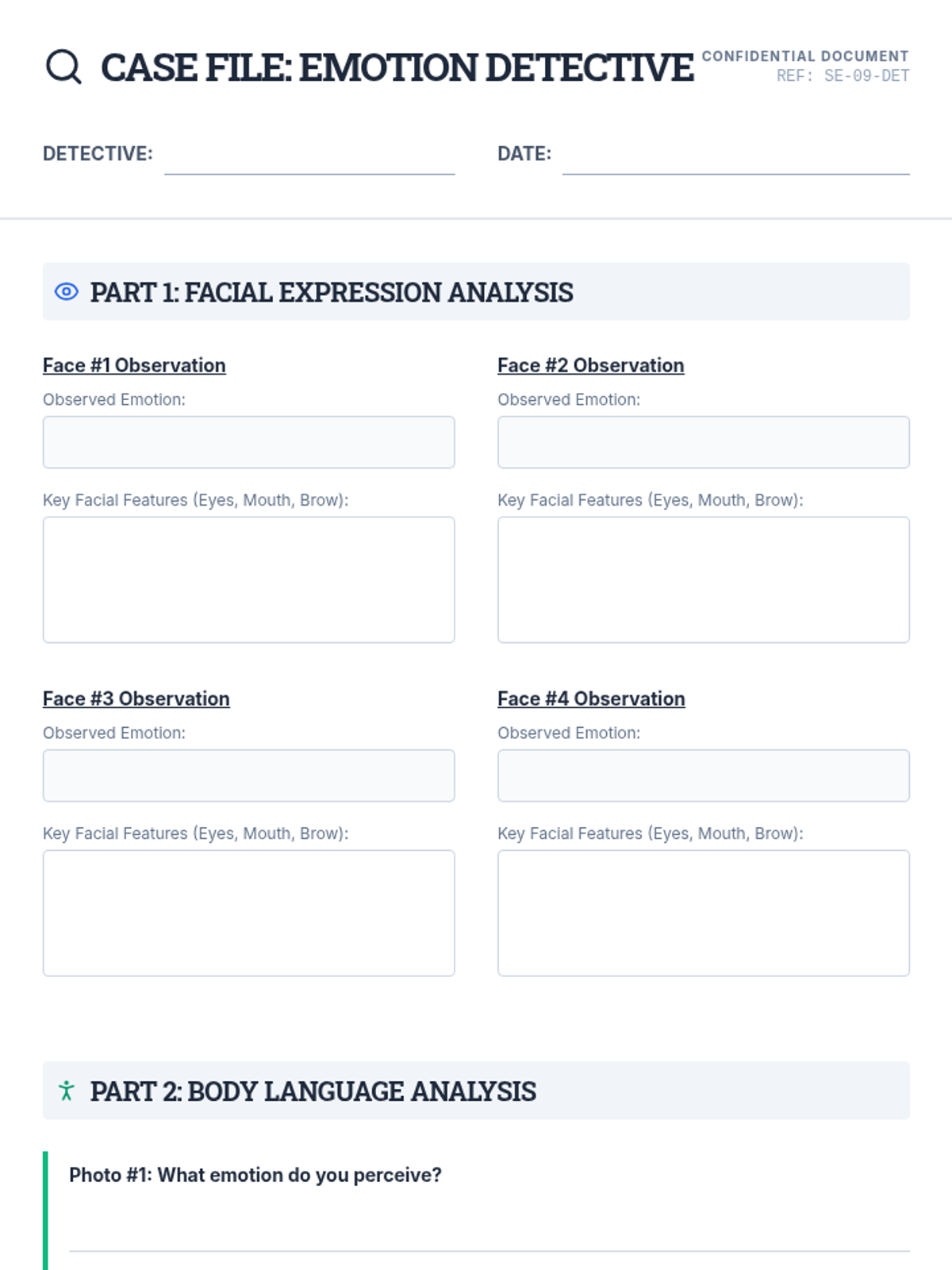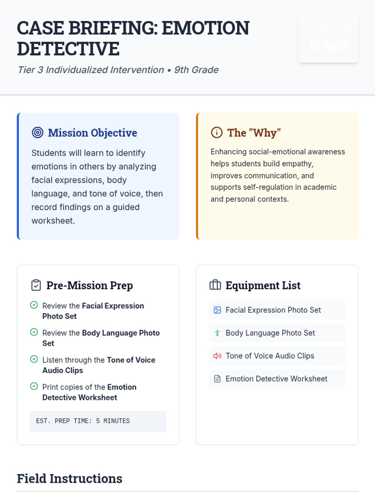 A 15-minute Tier 3 individualized lesson for 9th graders focused on identifying emotions through facial expressions, body language, and tone of voice. Students act as 'Emotion Detectives' to build social-emotional awareness and empathy.