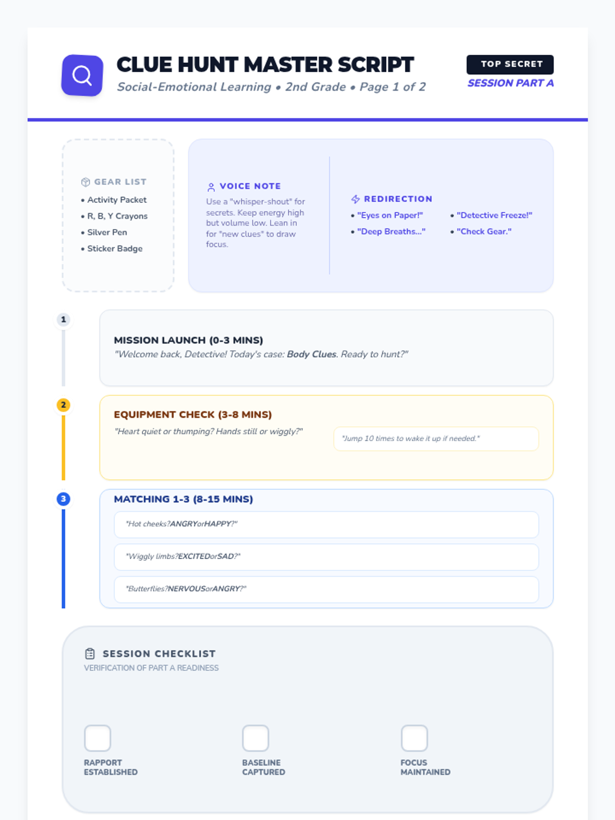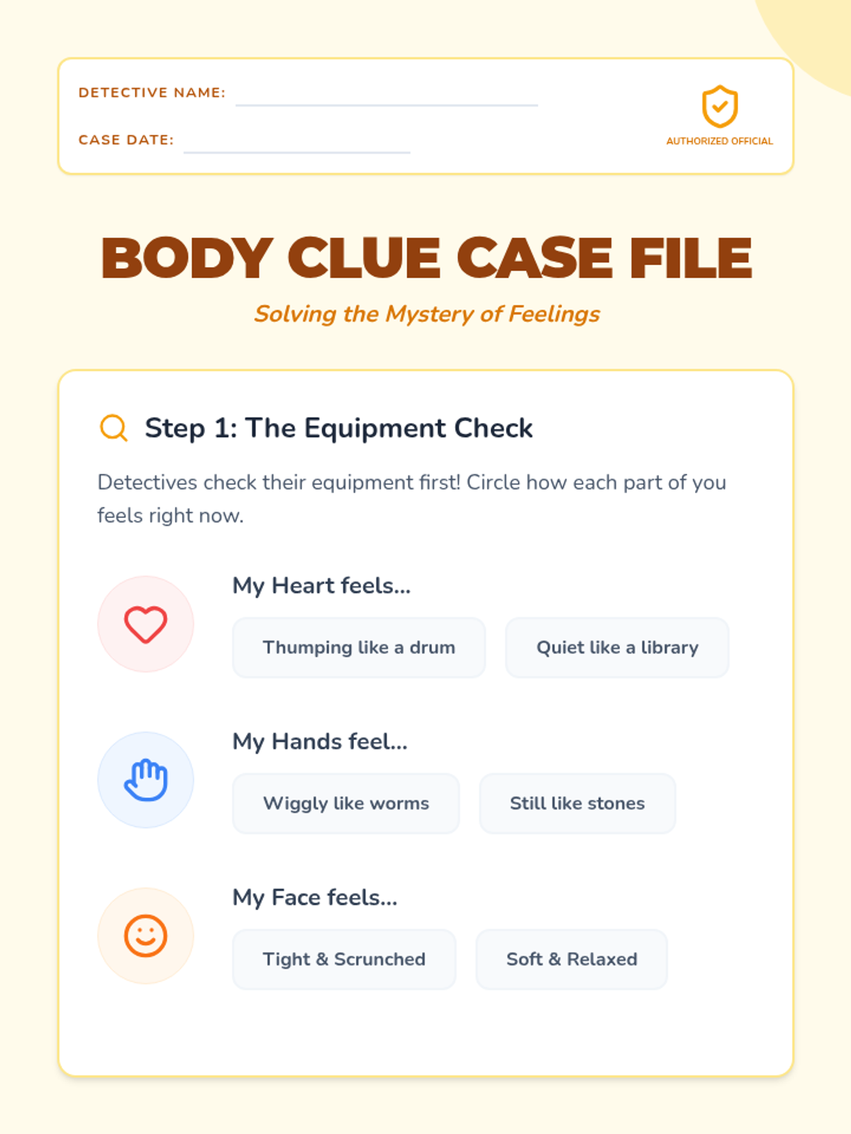 An individual social-emotional learning session for 2nd graders to connect physical sensations with emotional states through detective-themed body awareness activities.