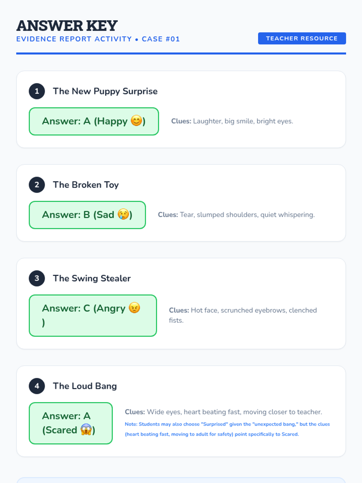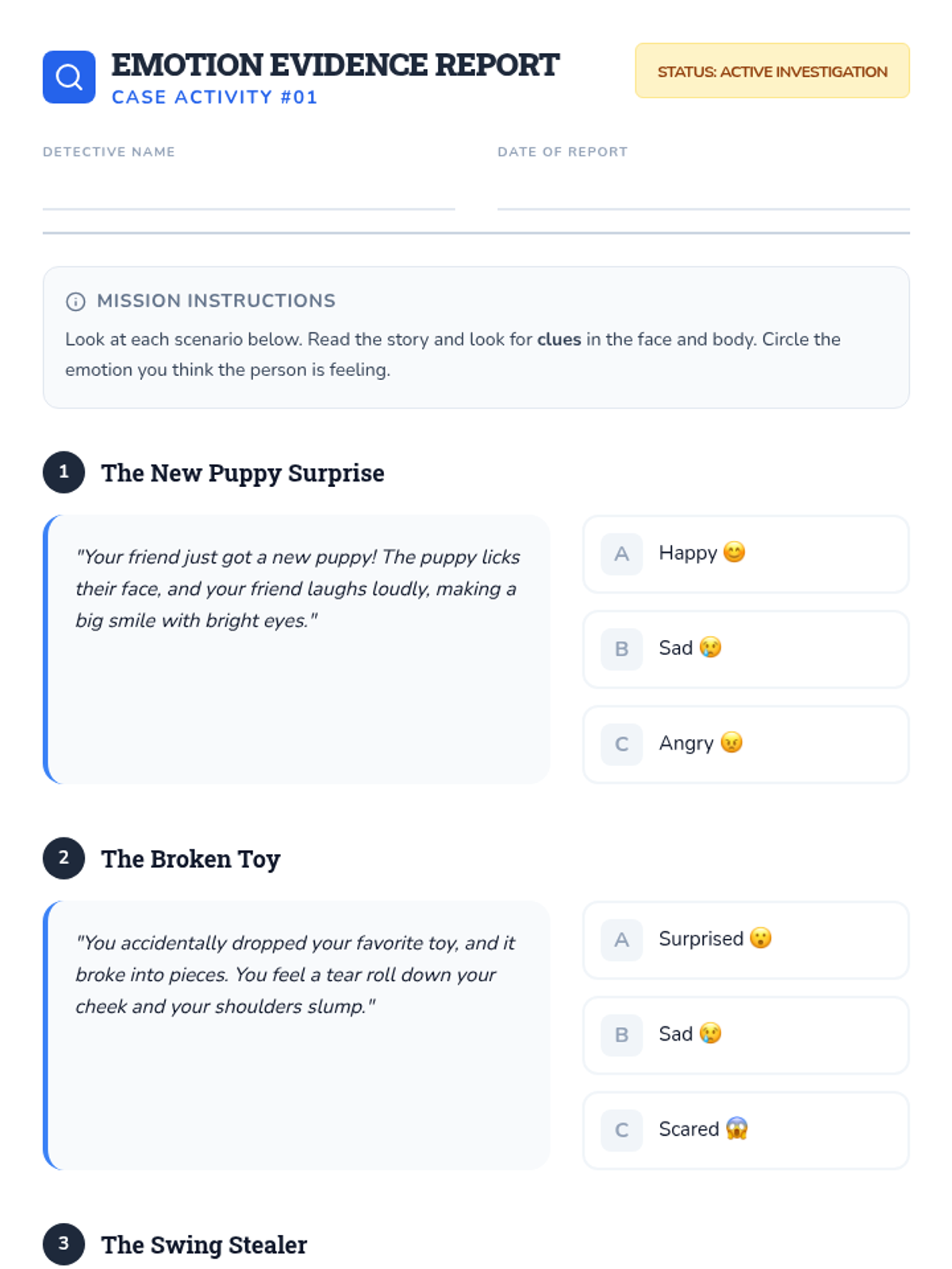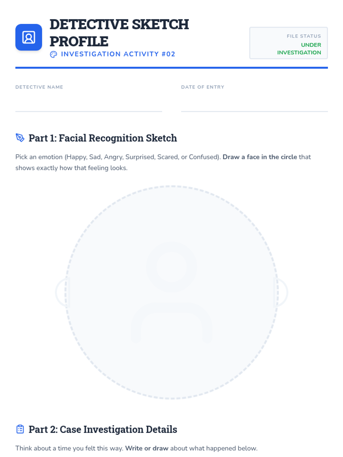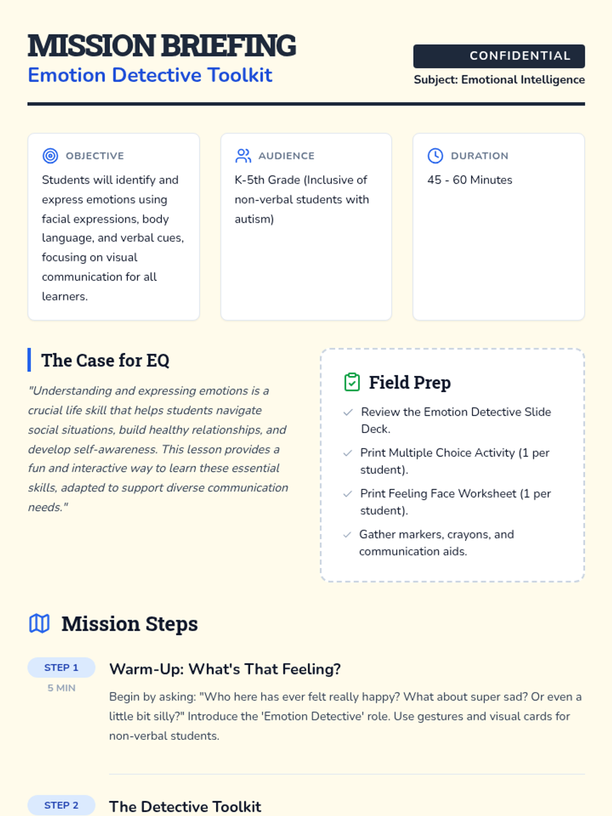 A comprehensive lesson designed for K-5 students to develop emotional intelligence by recognizing facial expressions, body language, and verbal cues through a fun 'detective' theme. Students practice identifying feelings in various scenarios and expressing their own emotions through drawing and writing.