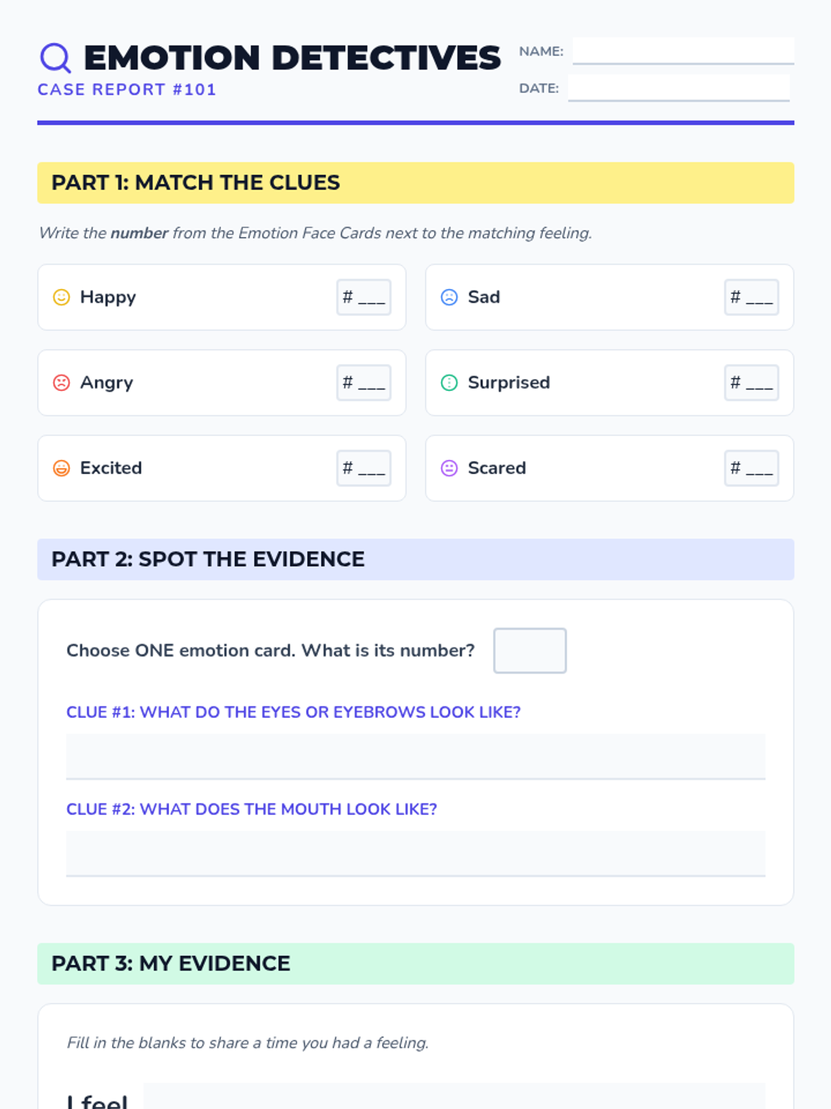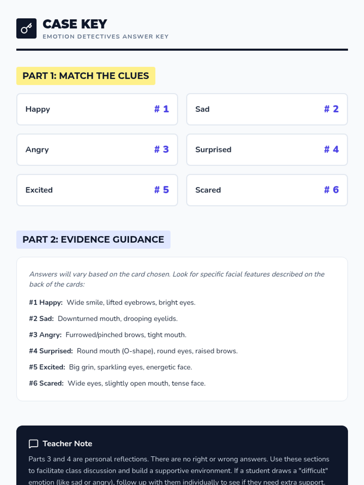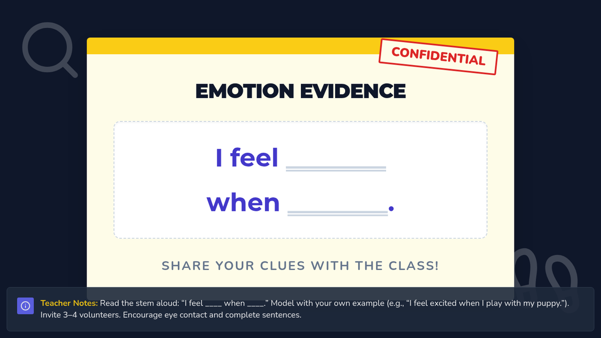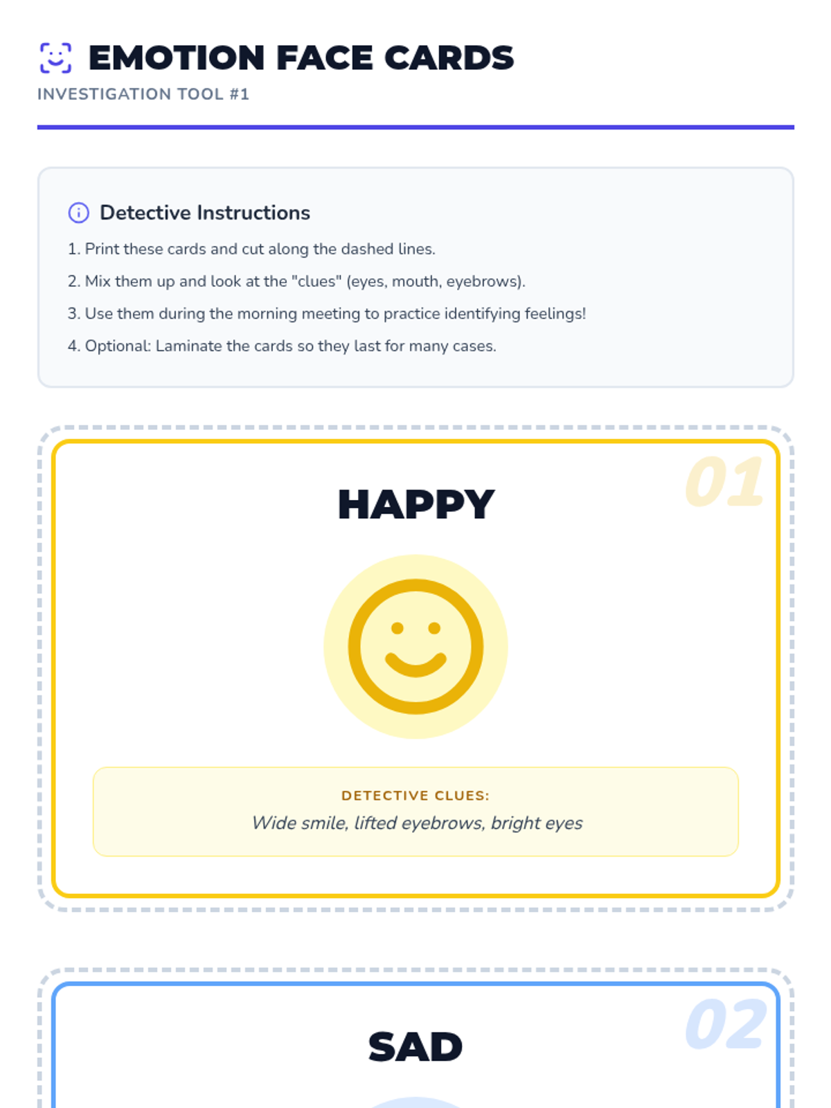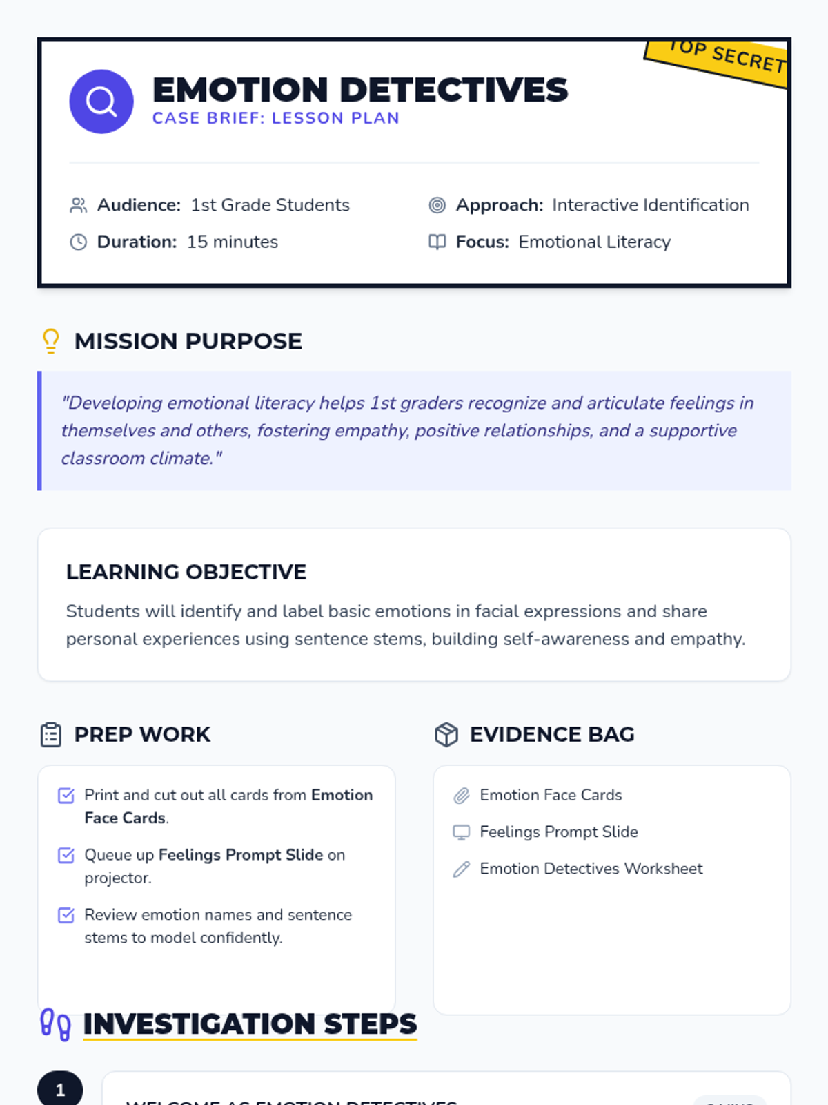 A 15-minute Tier 1 morning meeting lesson for 1st graders to build self-awareness and empathy through identifying facial expressions and sharing personal feelings.