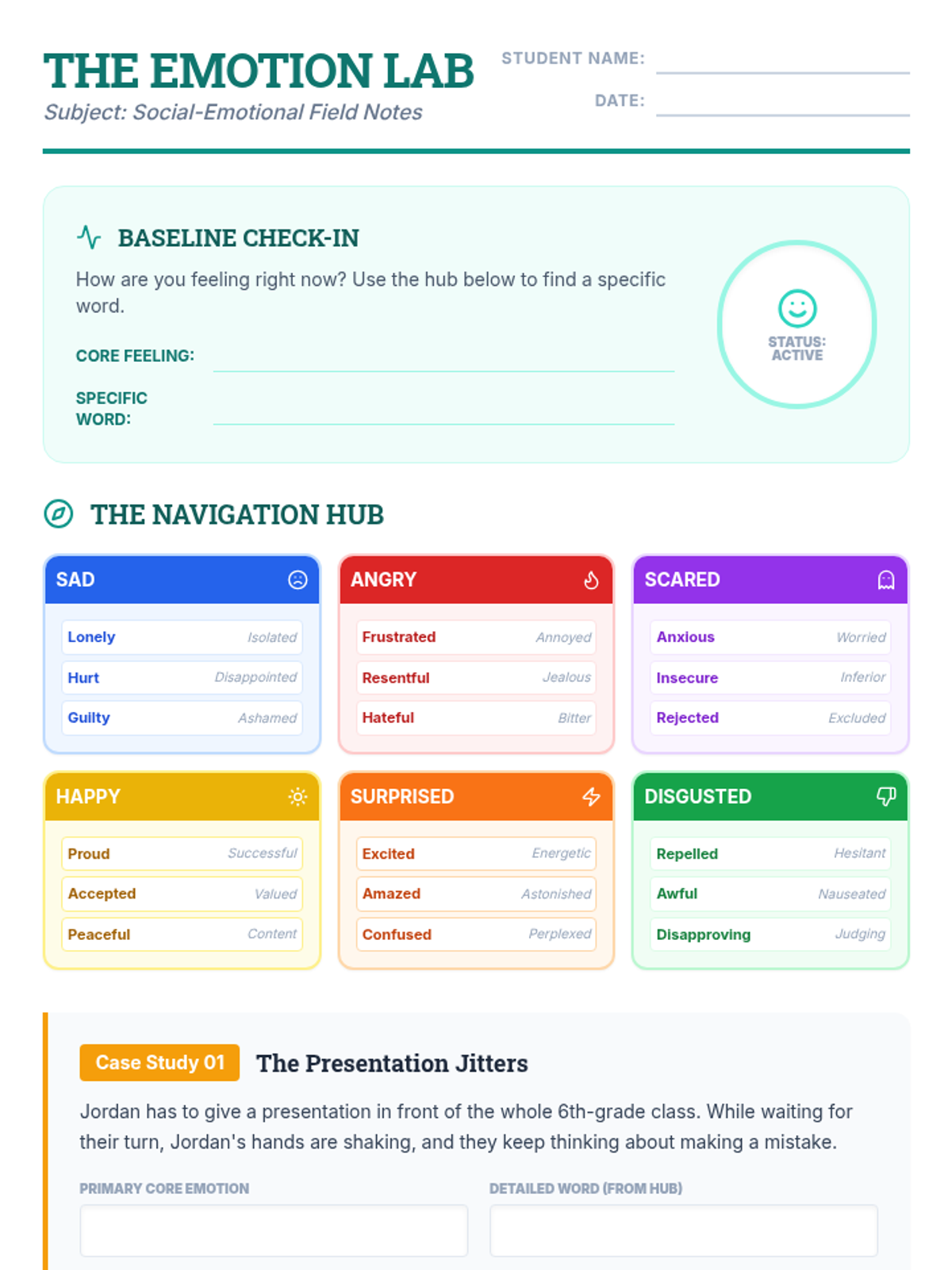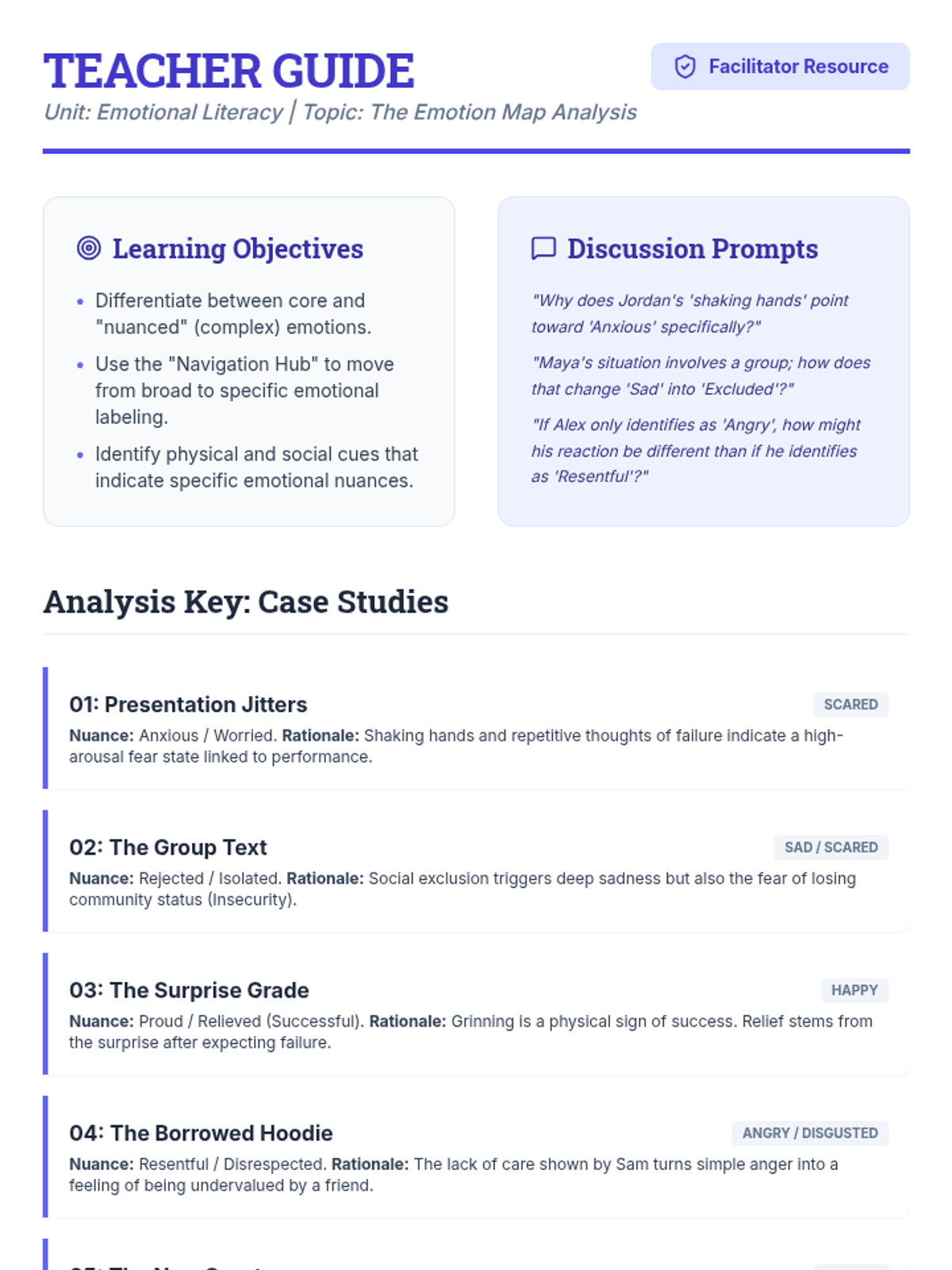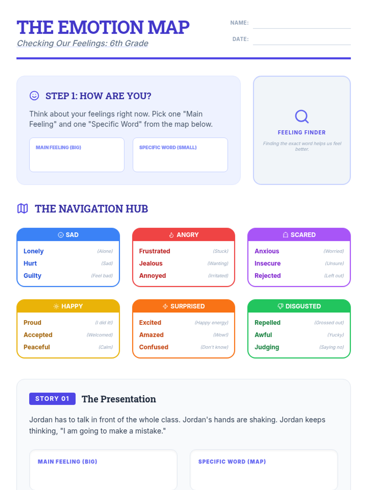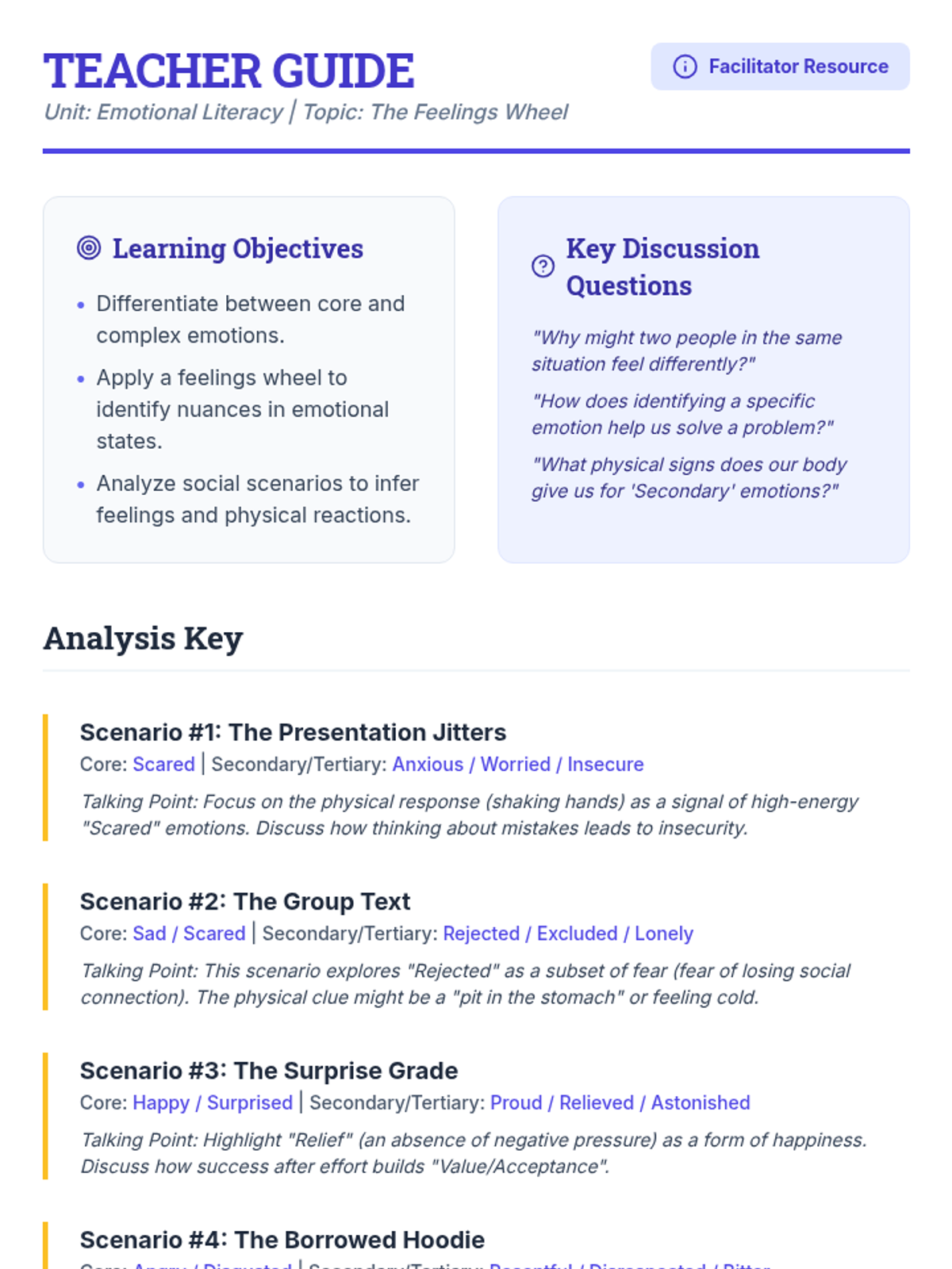 A lesson focused on identifying and analyzing complex emotions using a feelings wheel. Students will practice self-awareness and empathy through real-world scenarios designed for middle schoolers.