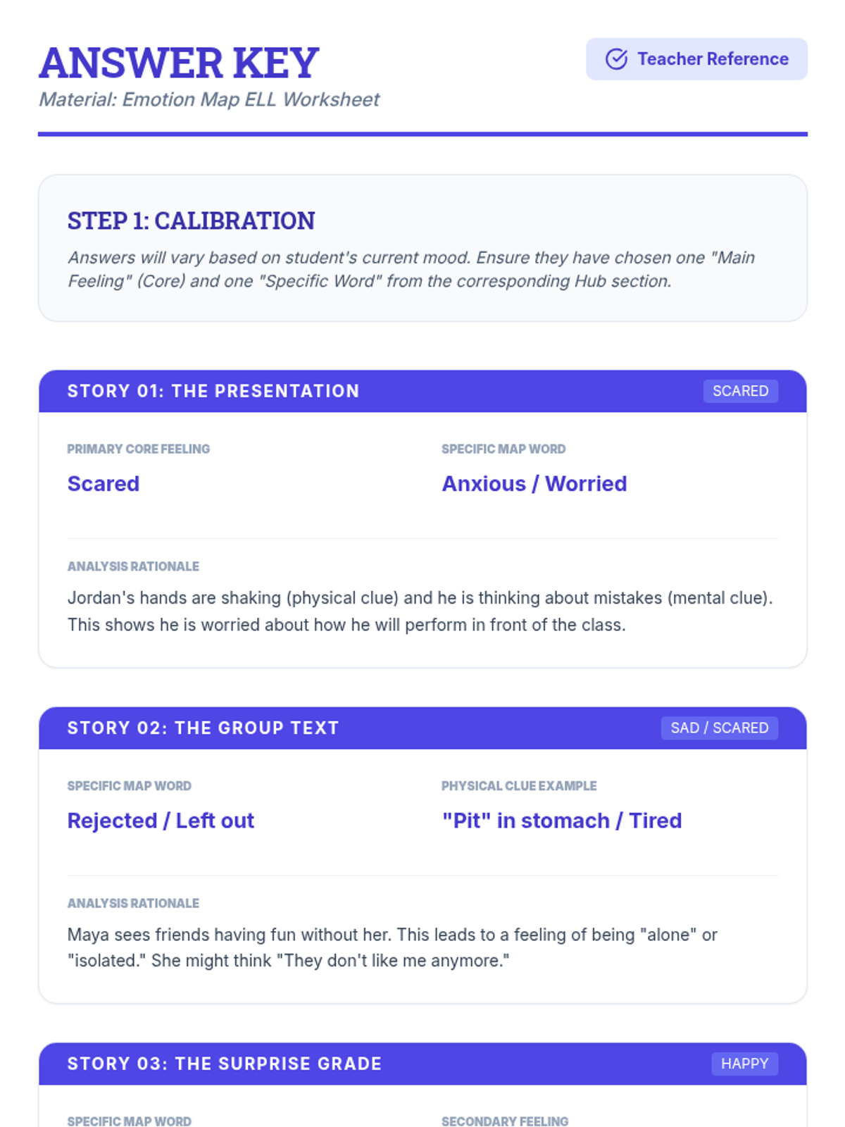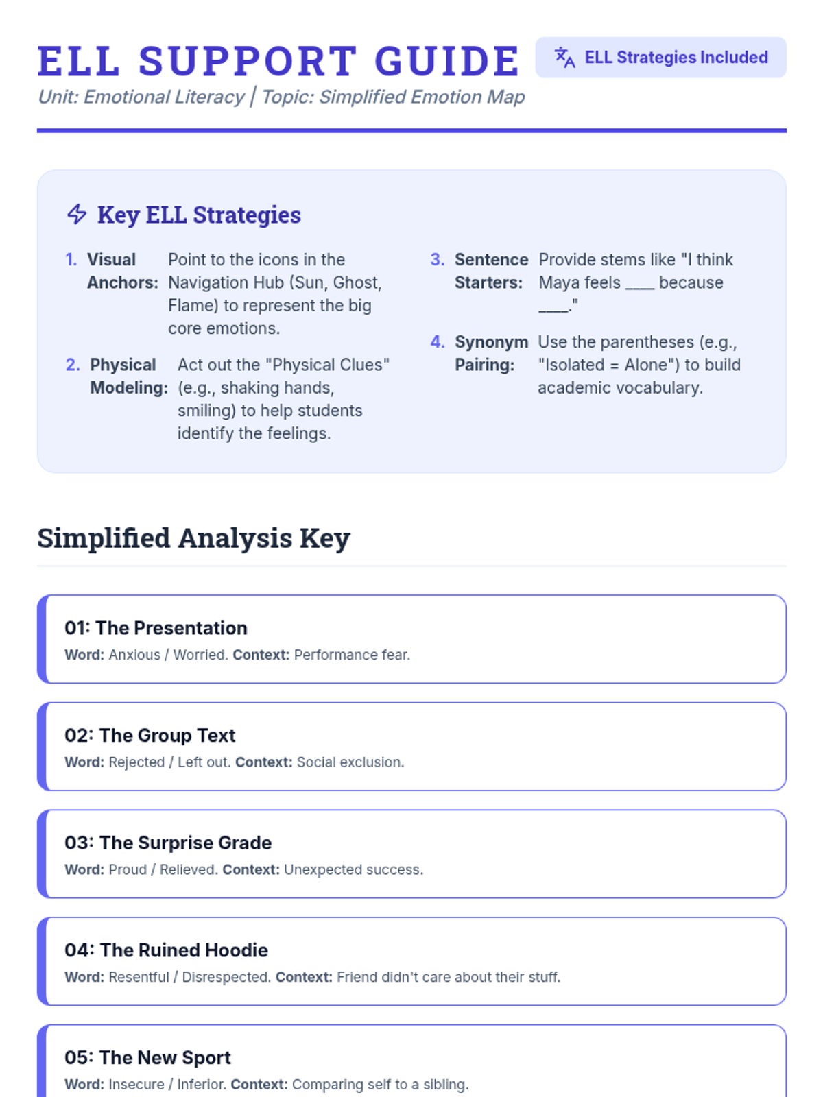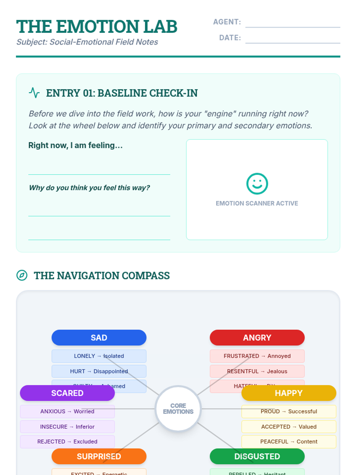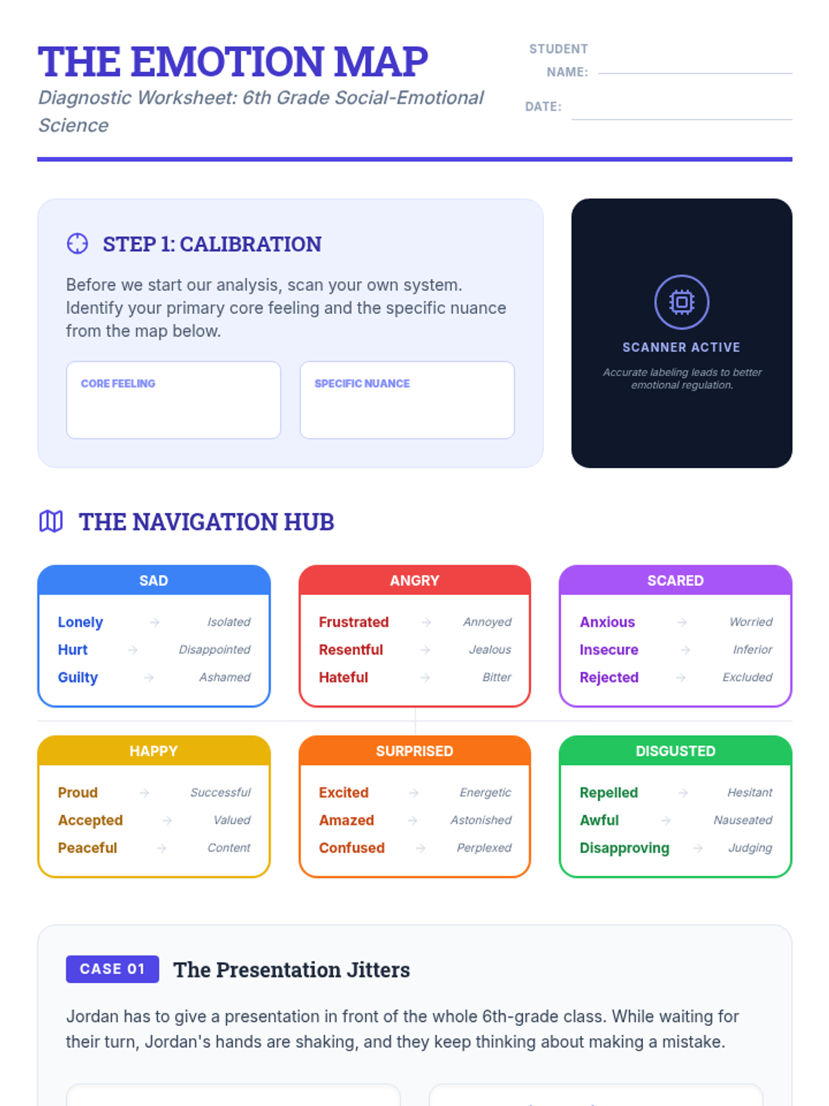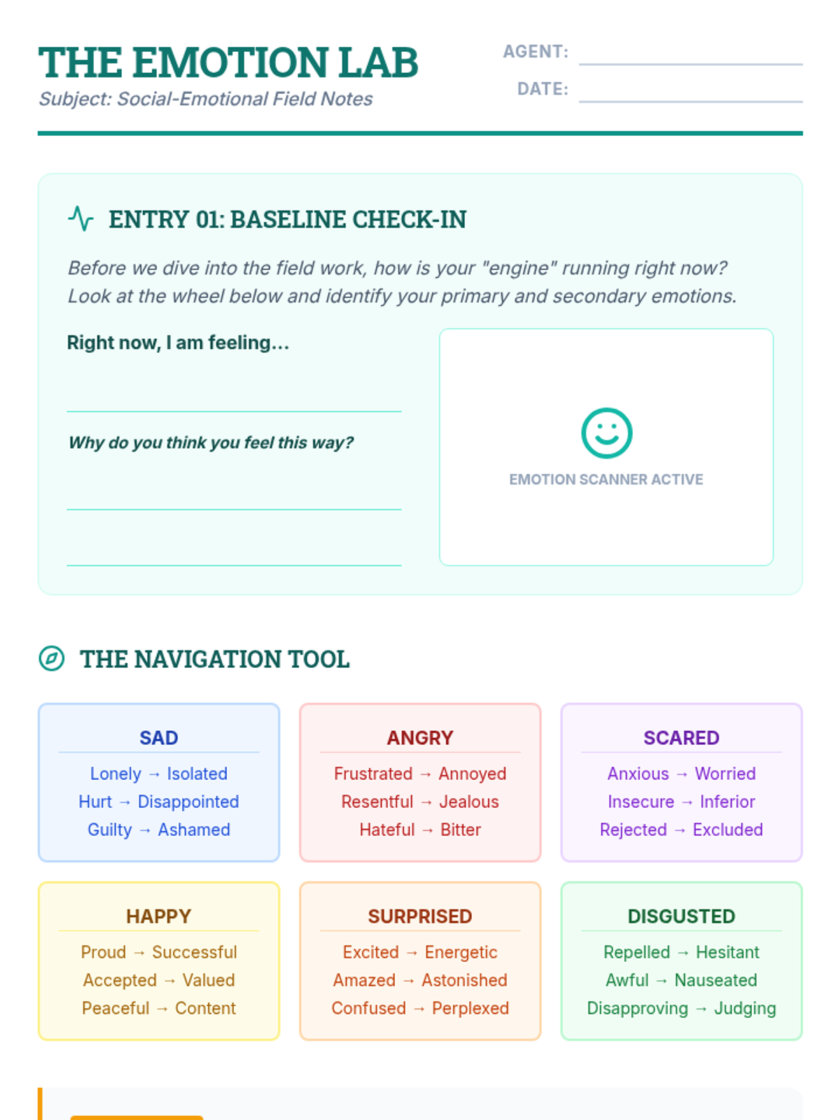 A lesson focused on identifying and analyzing complex emotions using a feelings wheel. Students will practice self-awareness and empathy through real-world scenarios designed for middle schoolers.