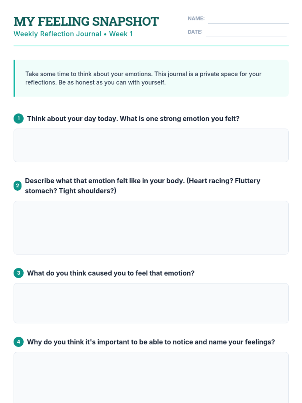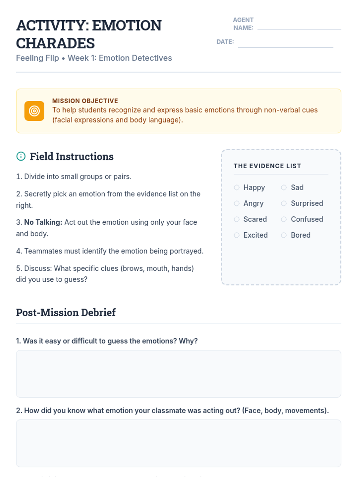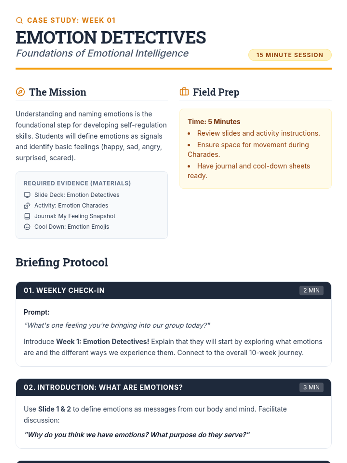 The foundational week where students define emotions as biological signals and practice identifying them in themselves and others.