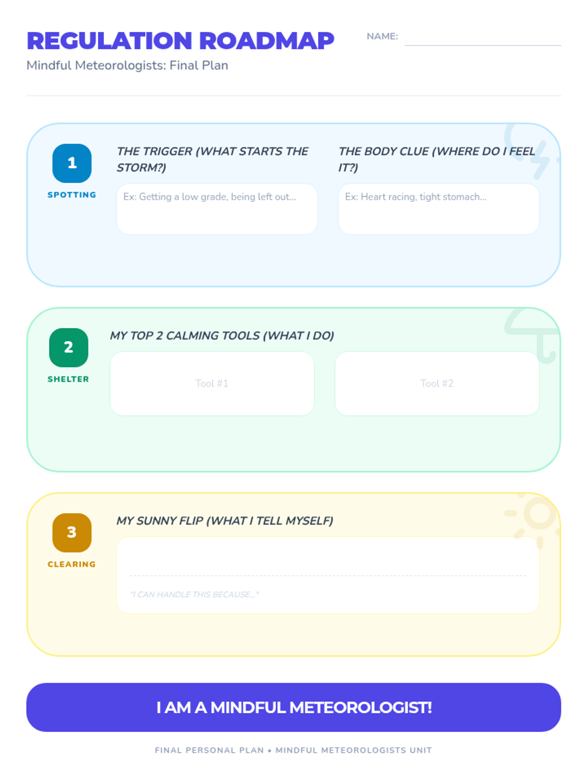 Developing a toolkit of sensory and breathing-based coping strategies to manage intense weather patterns in the mind.