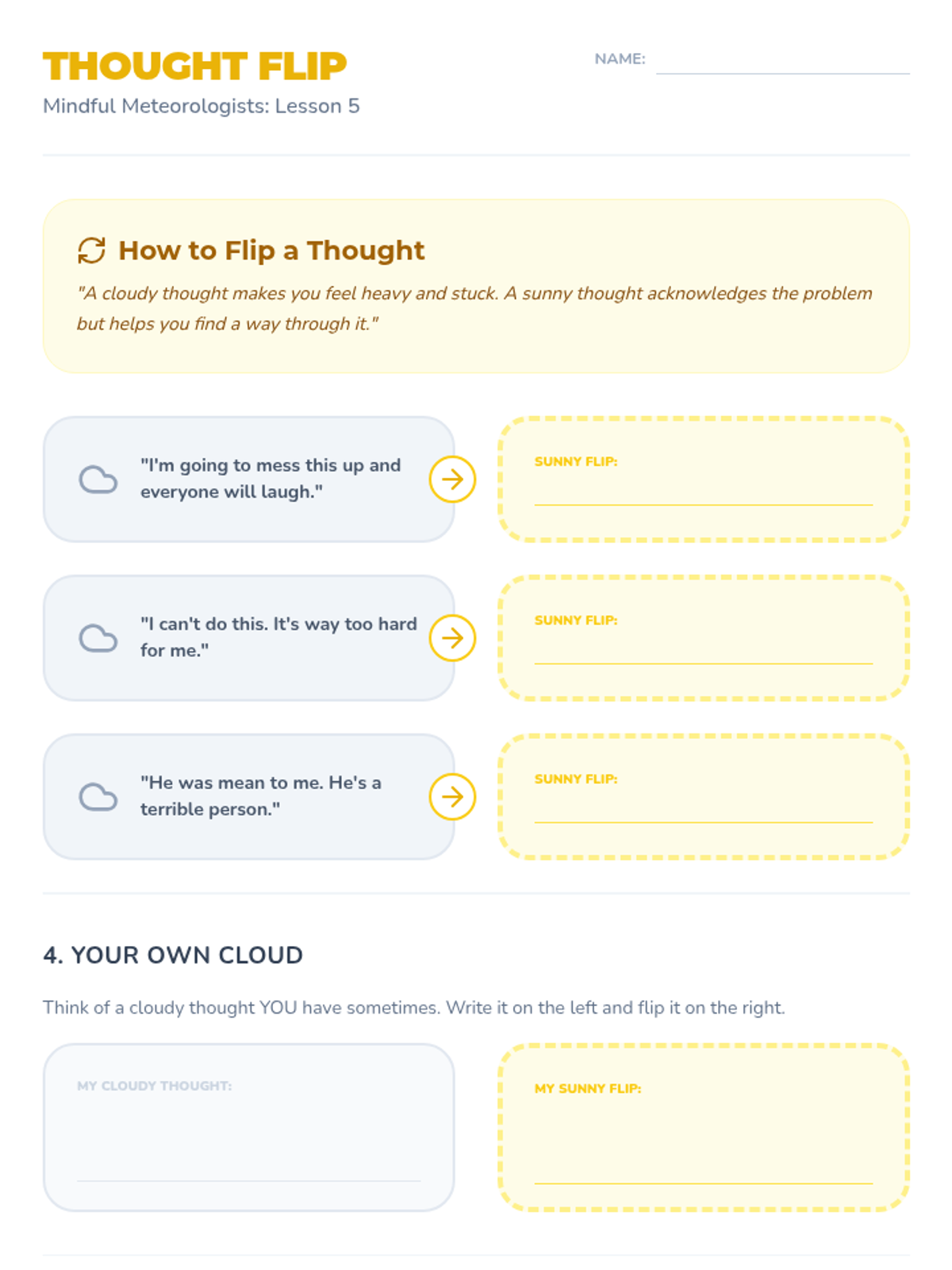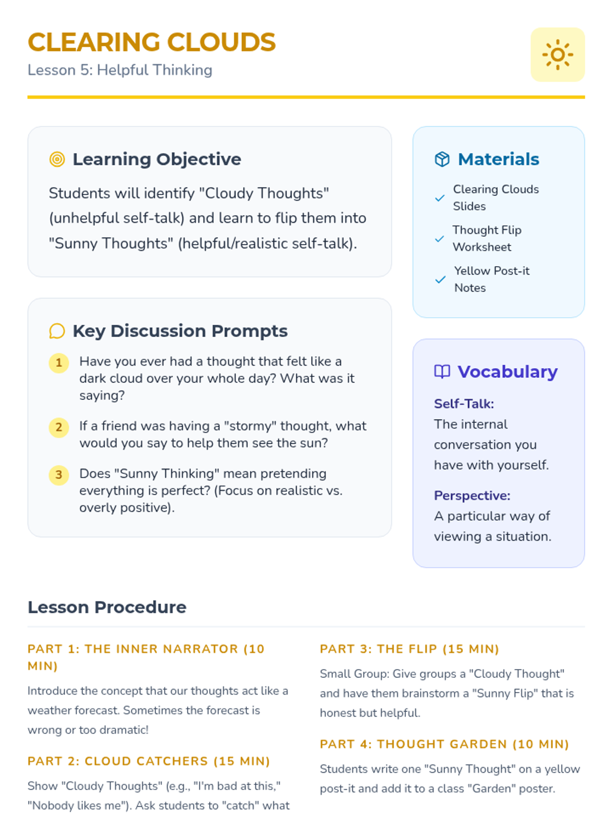 Learning how to use helpful self-talk and perspective-shifting to navigate through difficult emotional 'clouds'.