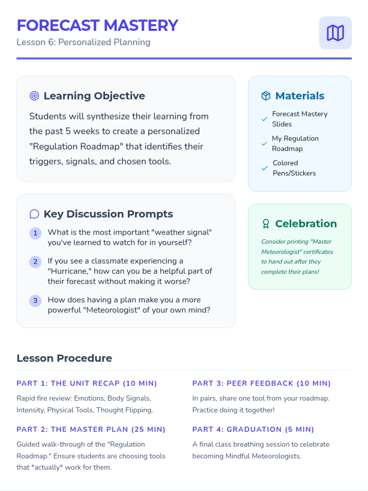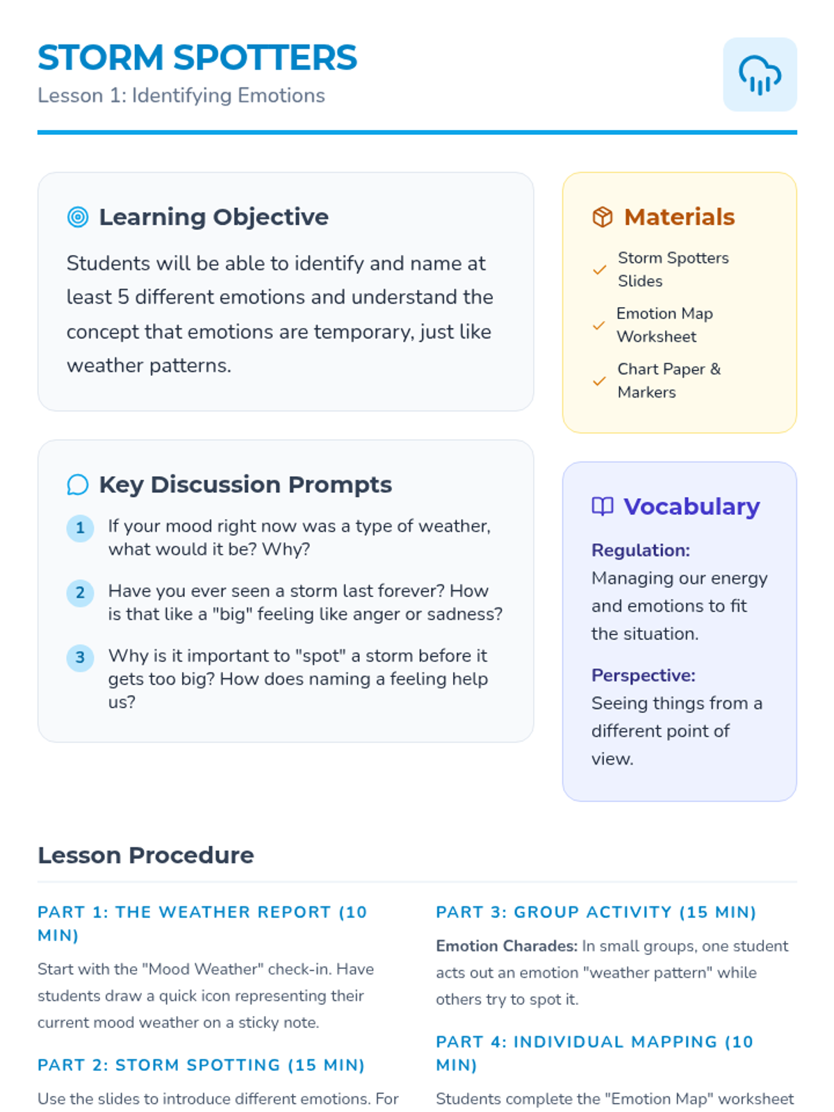 A K-2 lesson that uses weather metaphors to help students identify, express, and normalize their emotions while learning simple coping strategies.