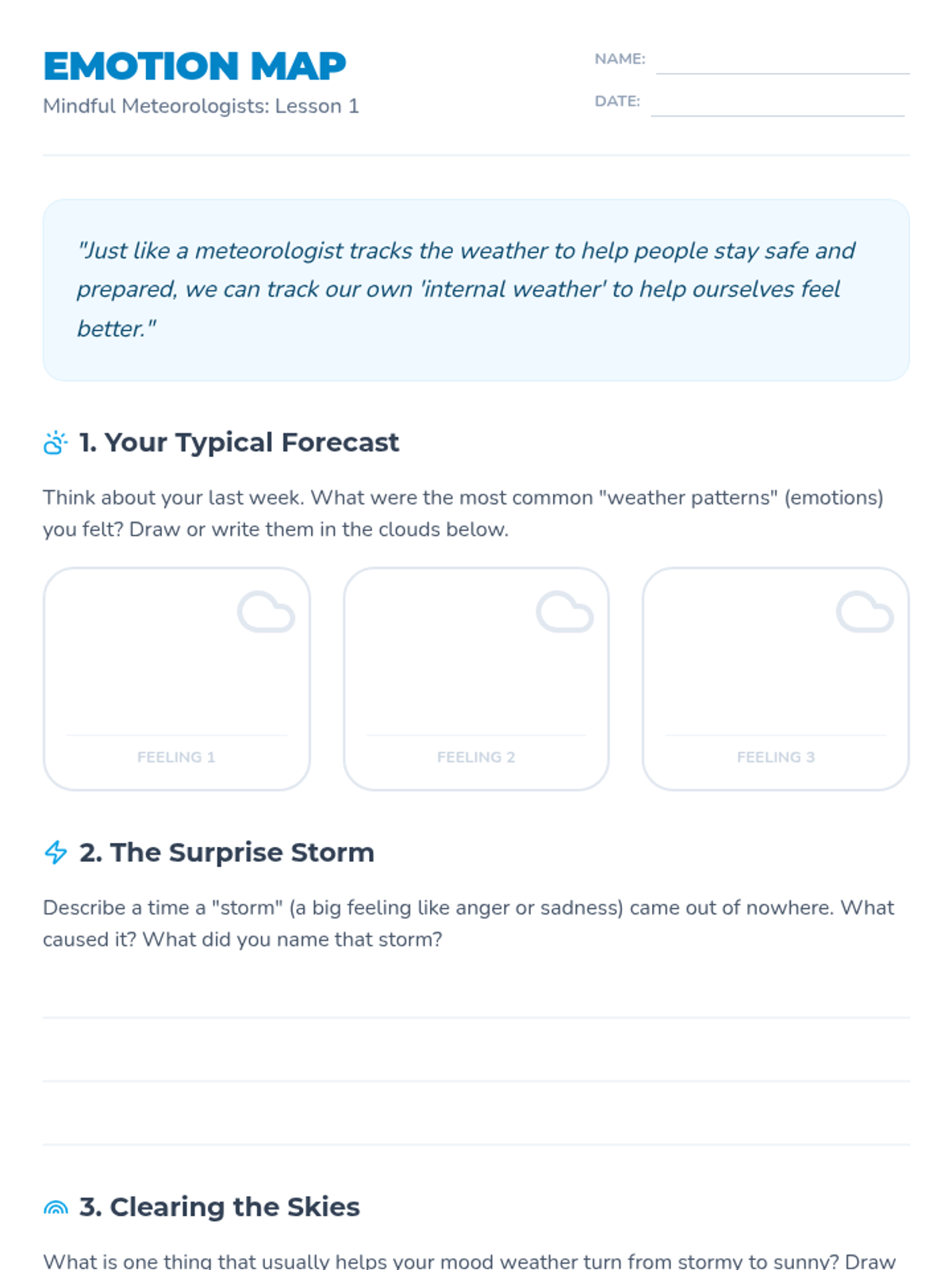 Introduction to identifying a wide range of emotions and understanding that all feelings are temporary, like weather patterns.