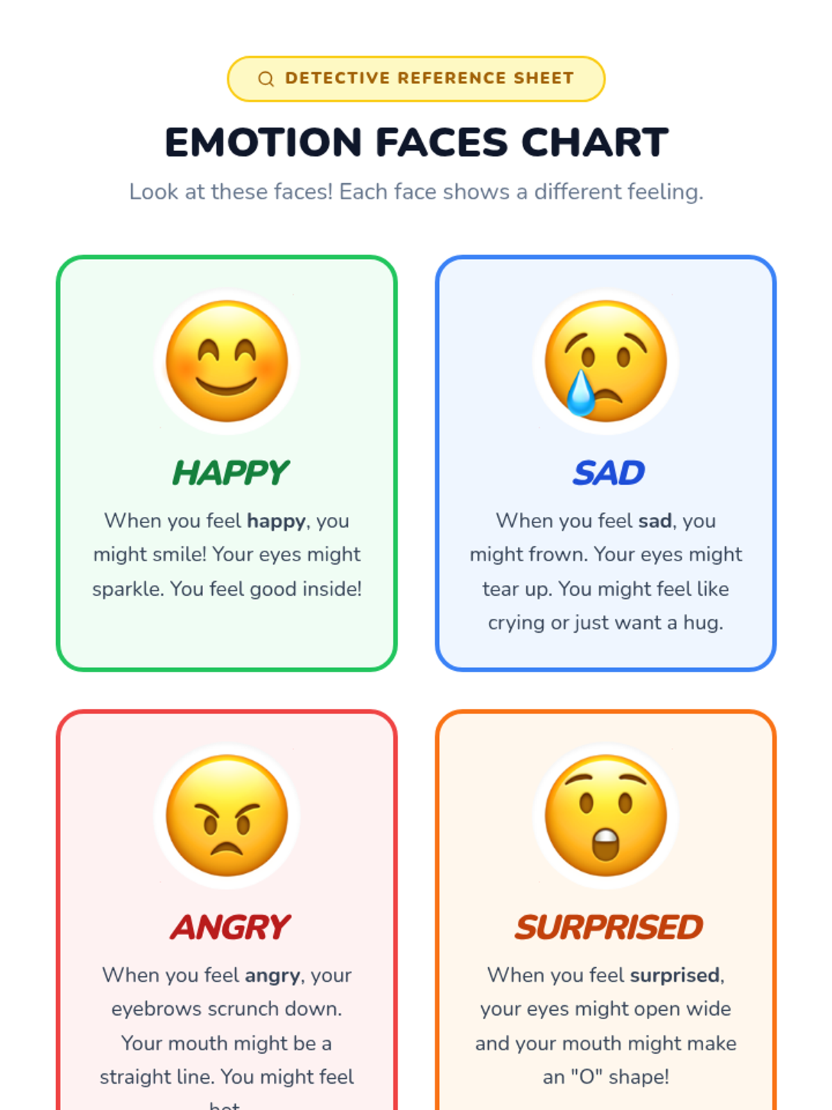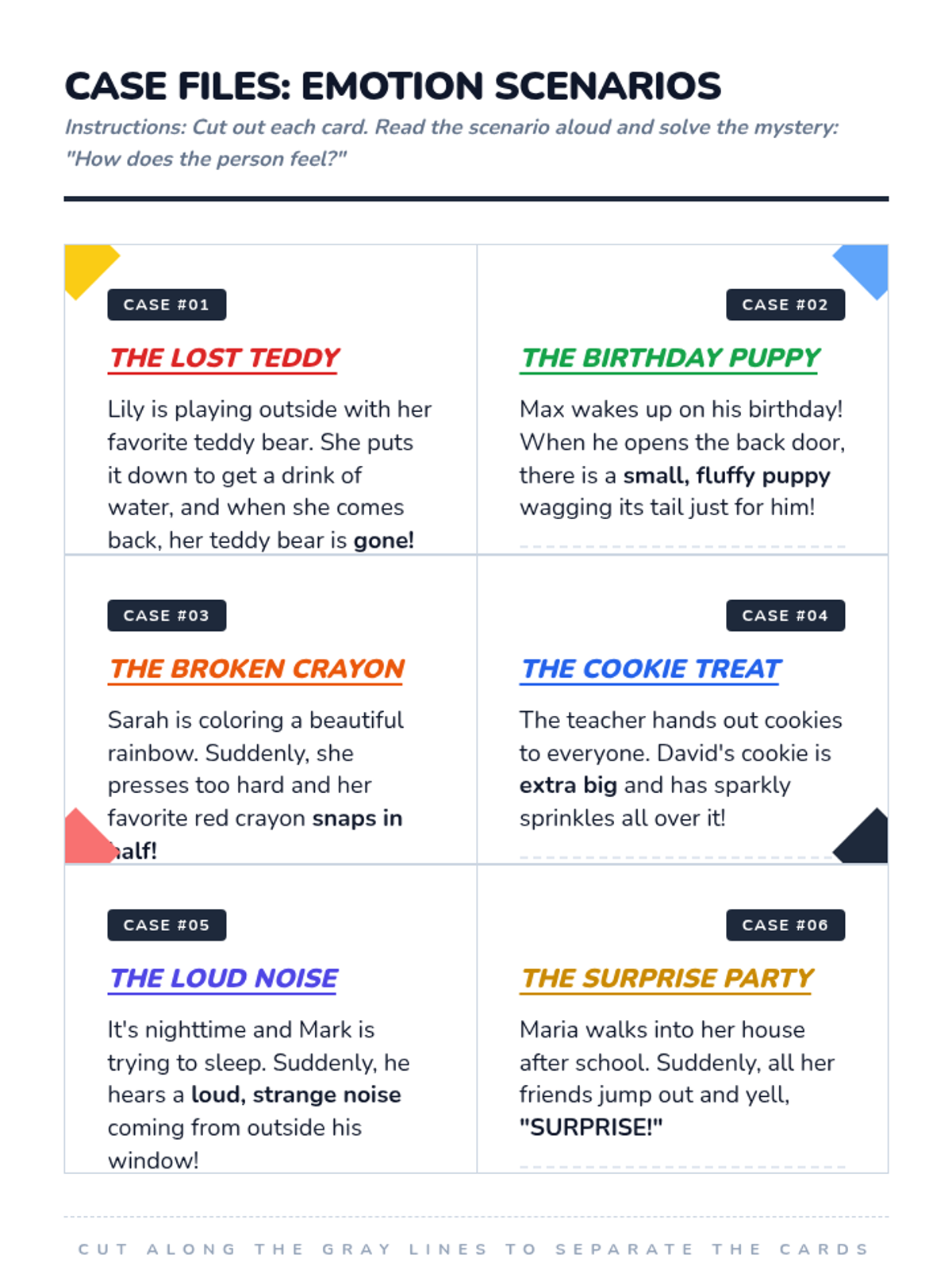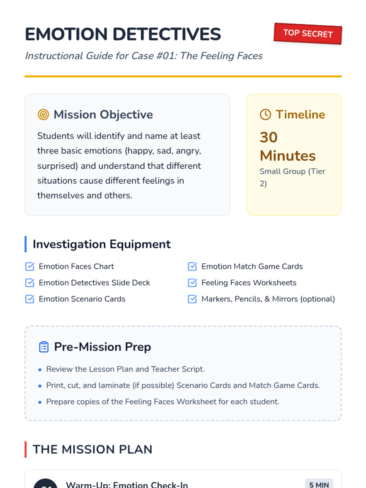 A 30-minute social-emotional learning lesson for 1st graders to identify and understand basic emotions through interactive play and discussion.