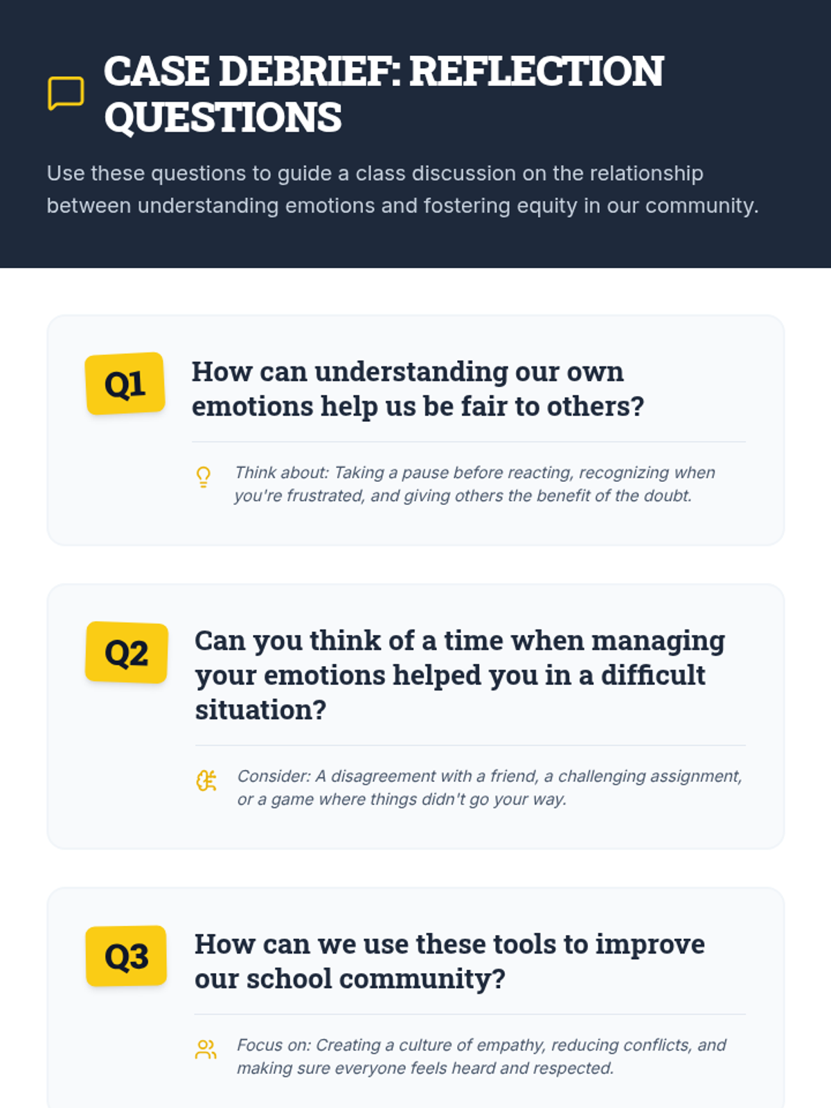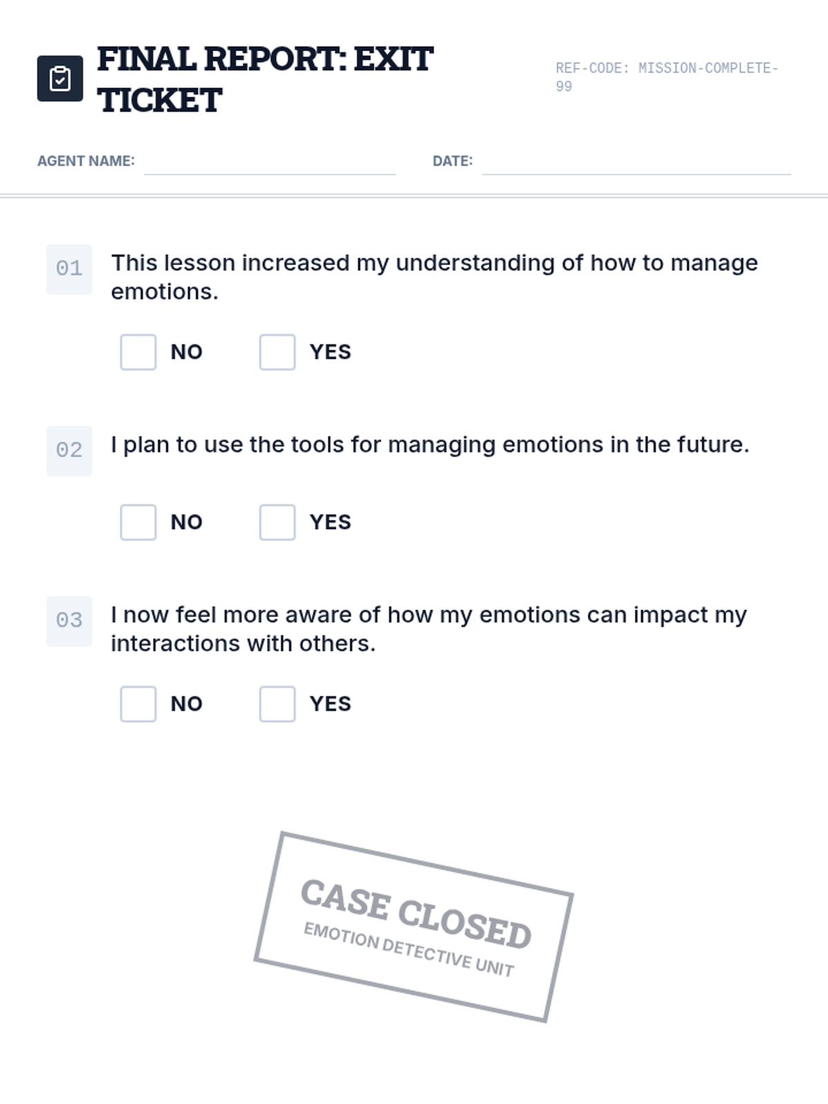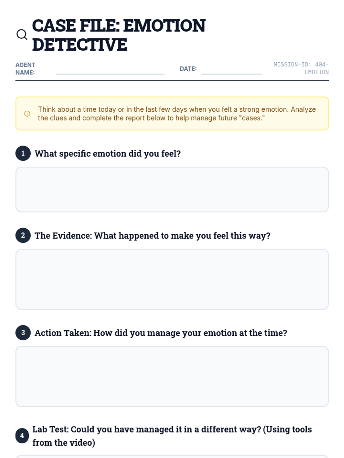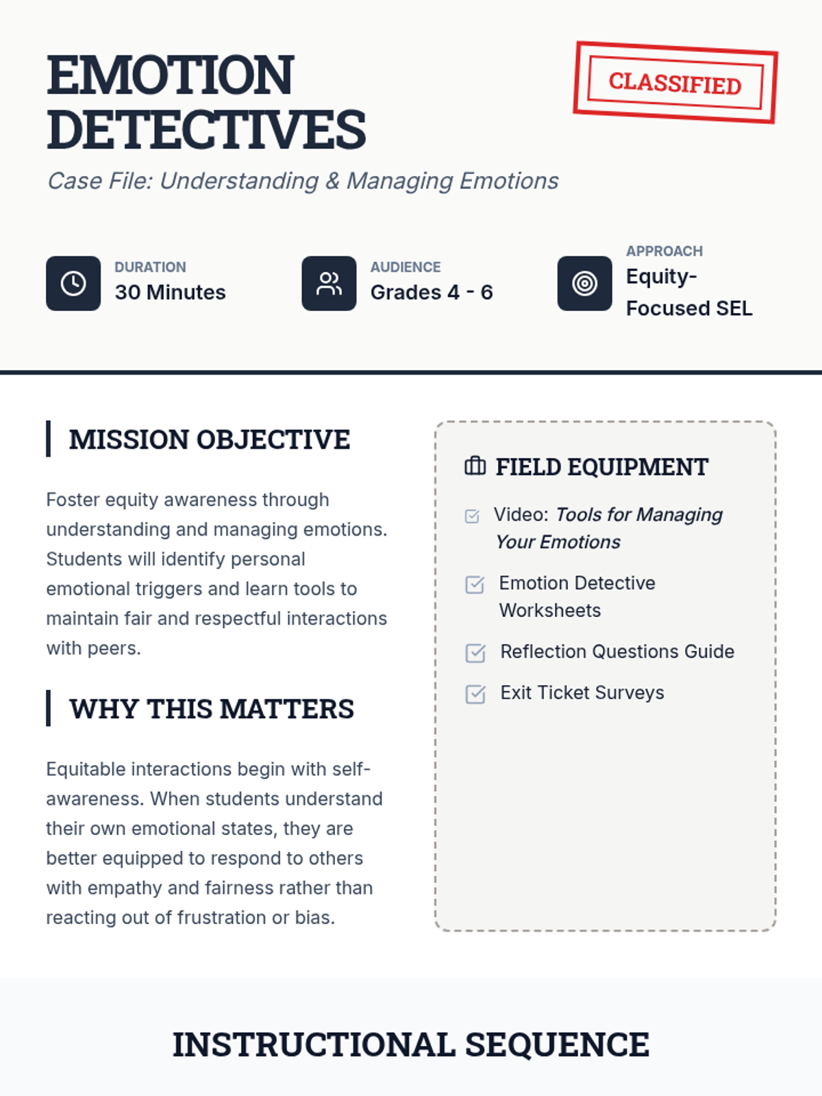 A 30-minute lesson for grades 4-6 focused on identifying and managing emotions to foster equity and fair interactions with peers. Students use a detective-themed approach to investigate their own emotional triggers and tools.