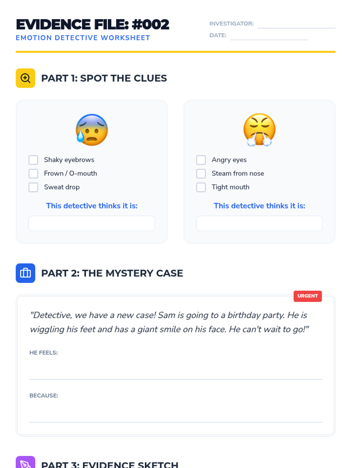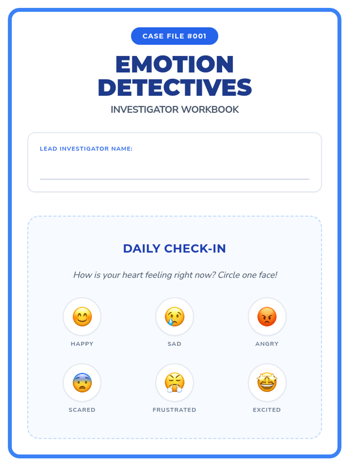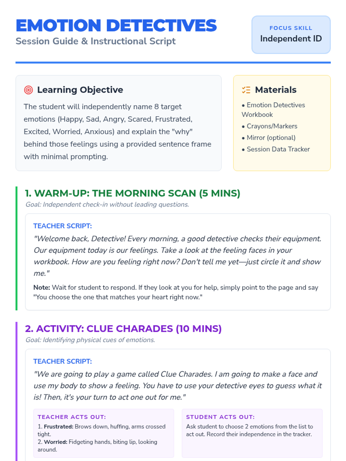 A specialized individual session for kindergarten students to build independence in identifying and labeling complex emotions using a 'Detective' theme. The lesson includes a warm-up check-in, emotion charades, scenario-based identification, and a calming strategy.
