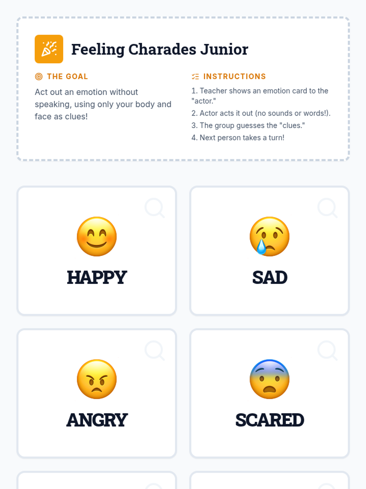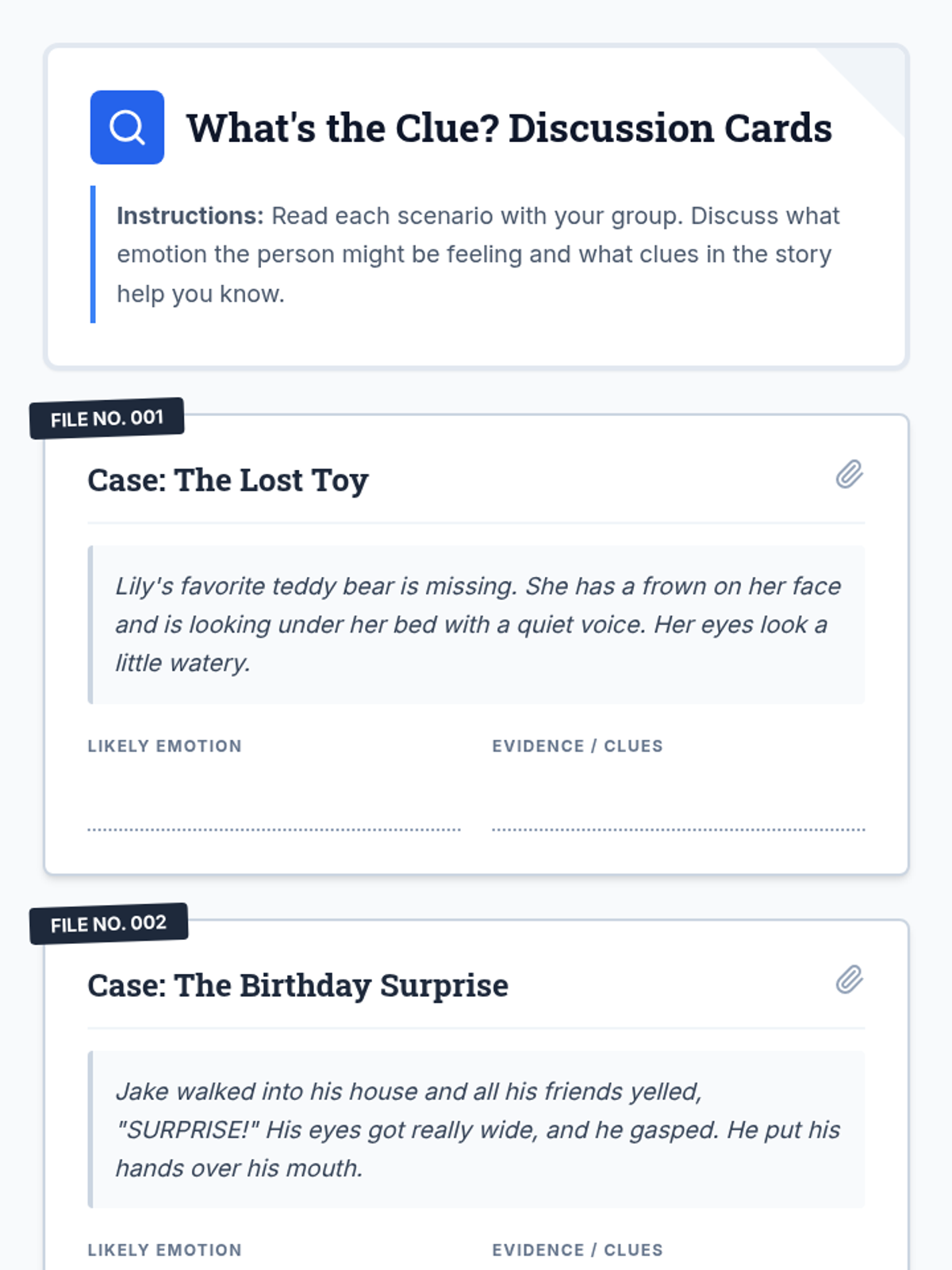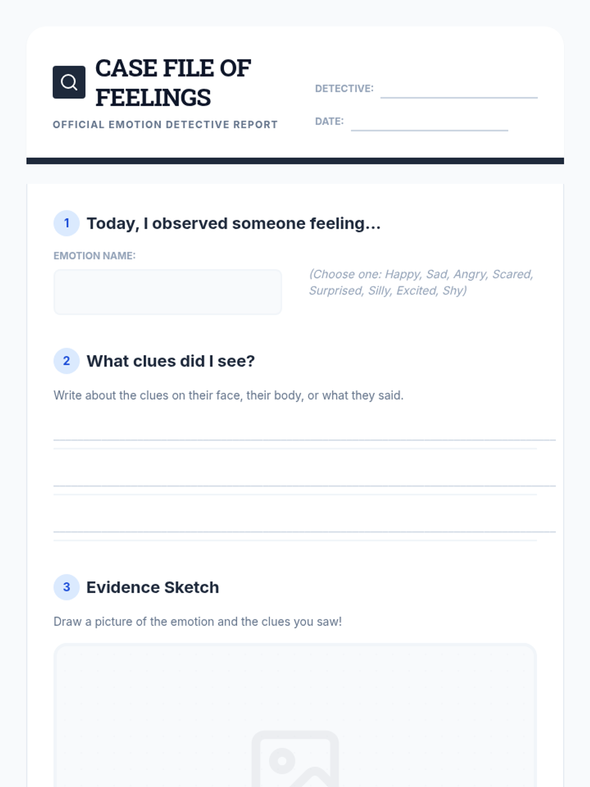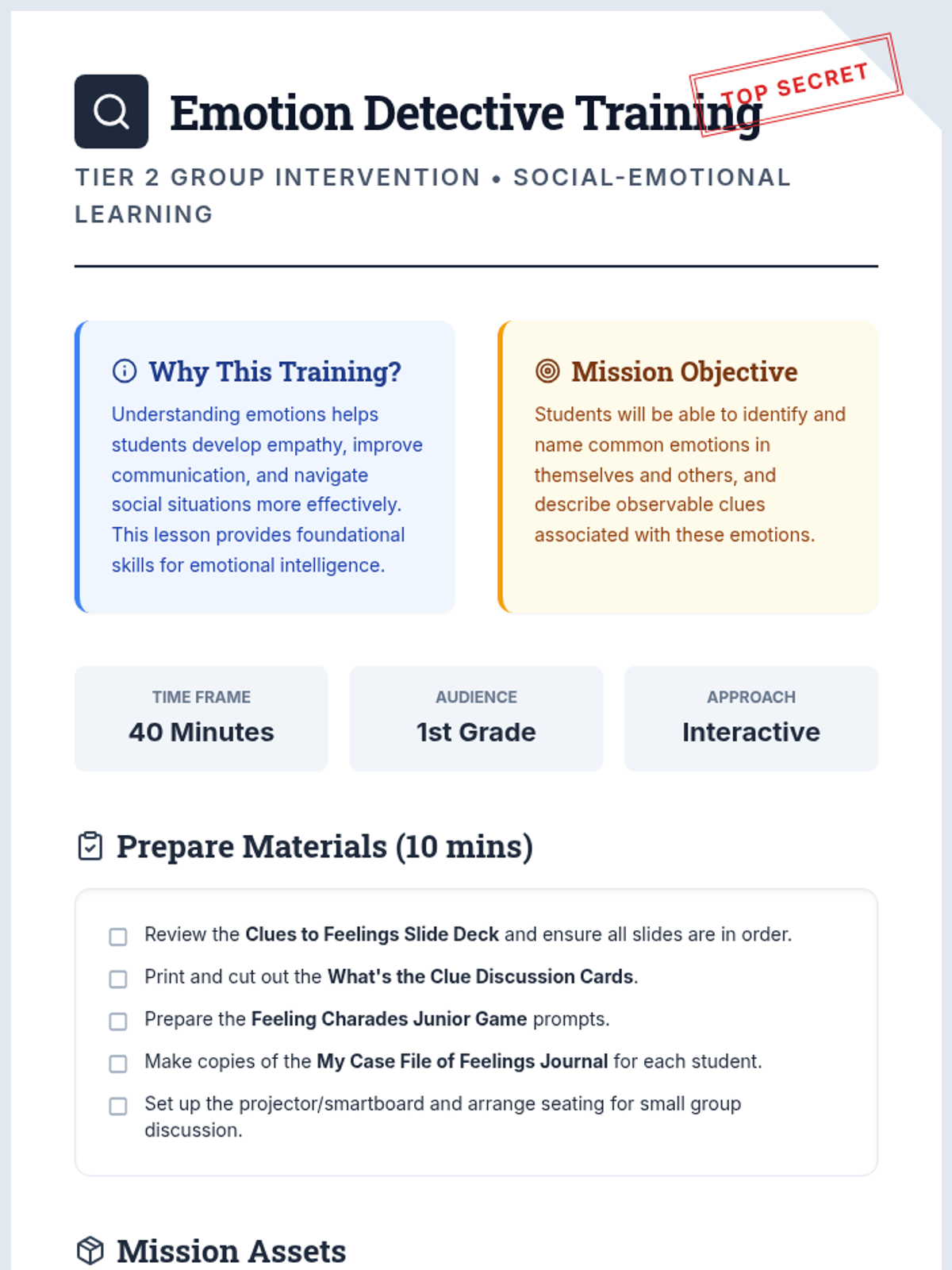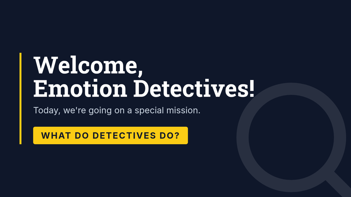 A small group social-emotional learning lesson for 1st graders to become 'emotion detectives,' identifying feelings through physical and verbal clues. Students practice empathy and social cue recognition through interactive slides, discussion cards, and a charades game.