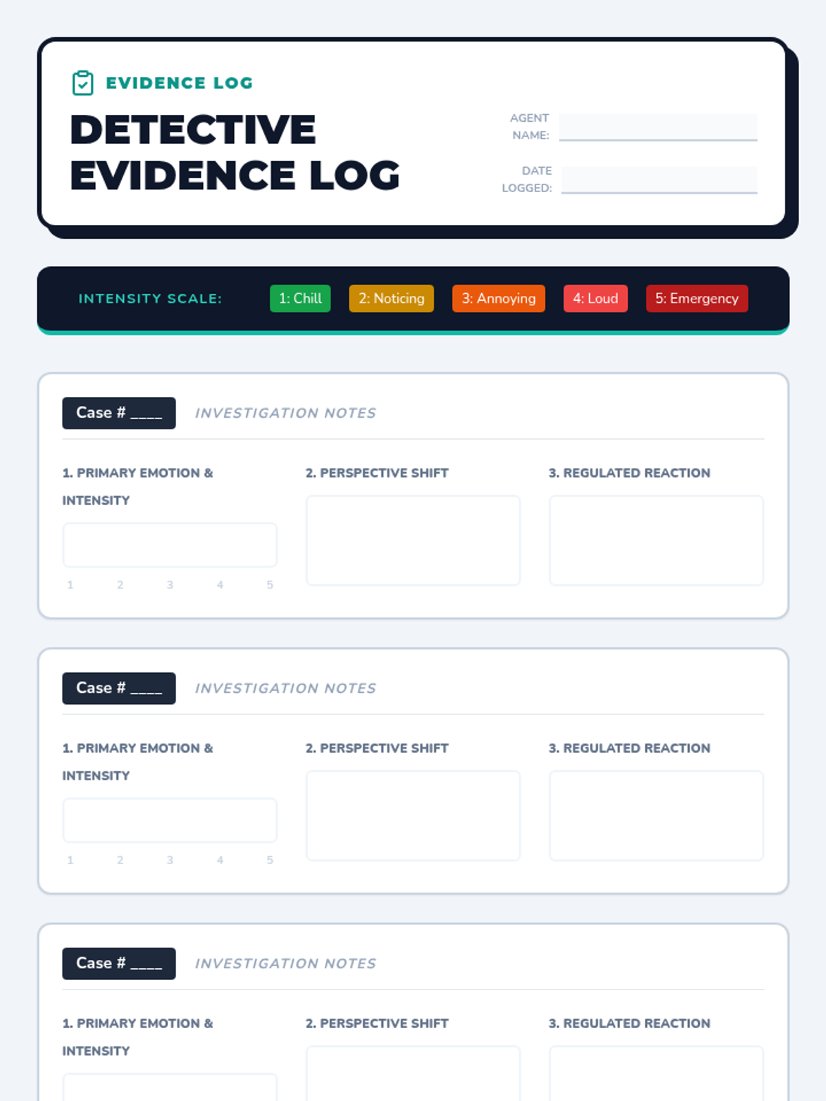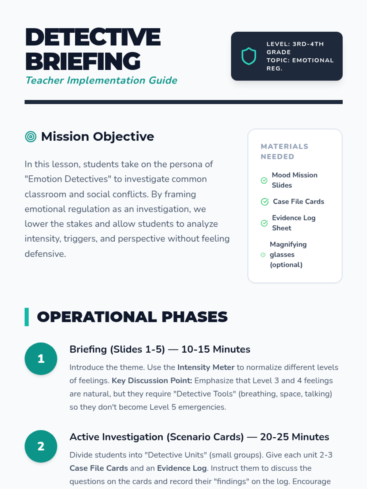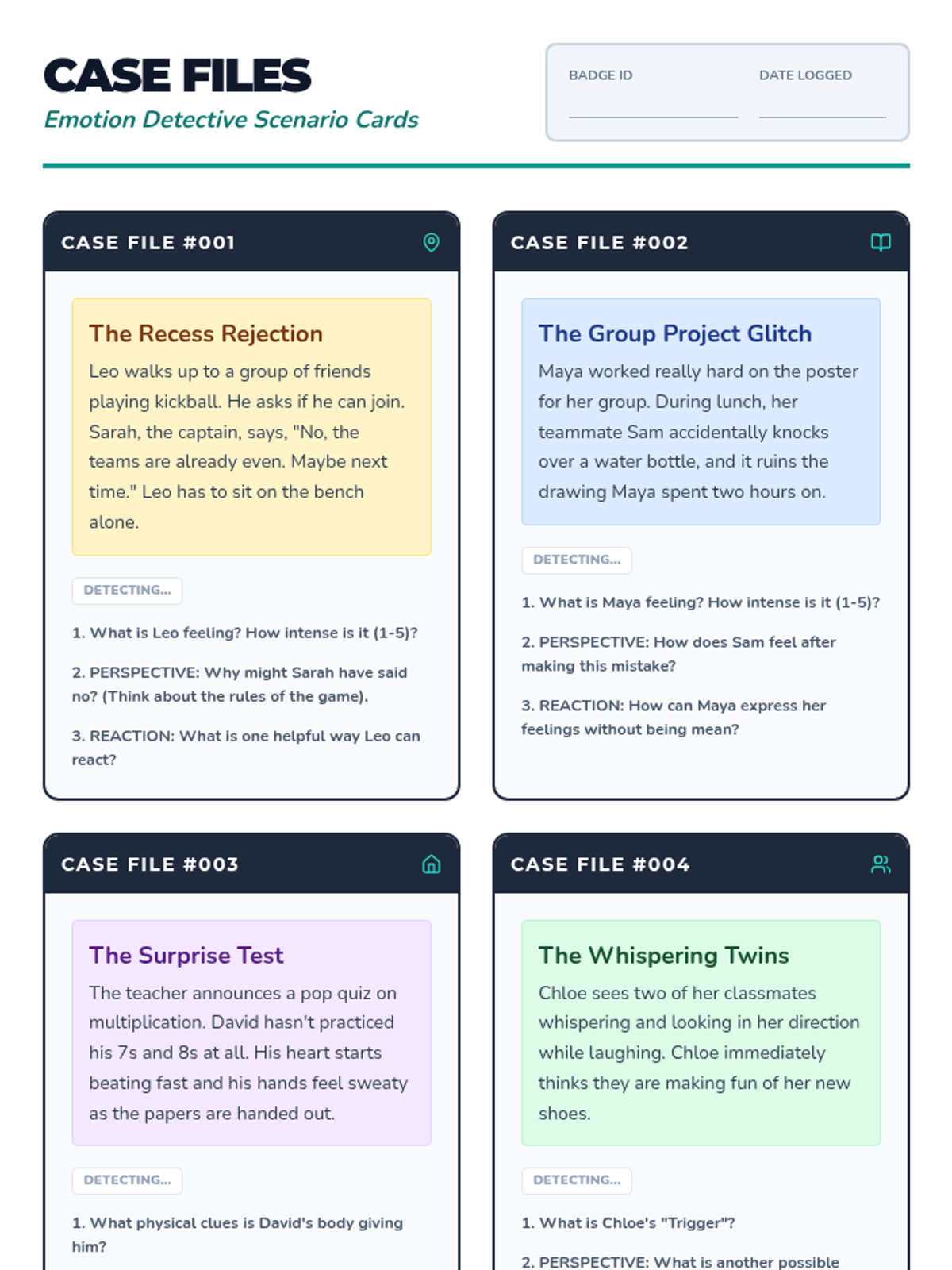 A lesson where students become 'Emotion Detectives' to investigate triggers, intensity, and empathy through real-world scenarios.