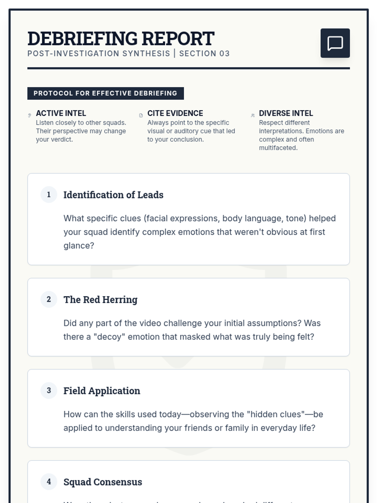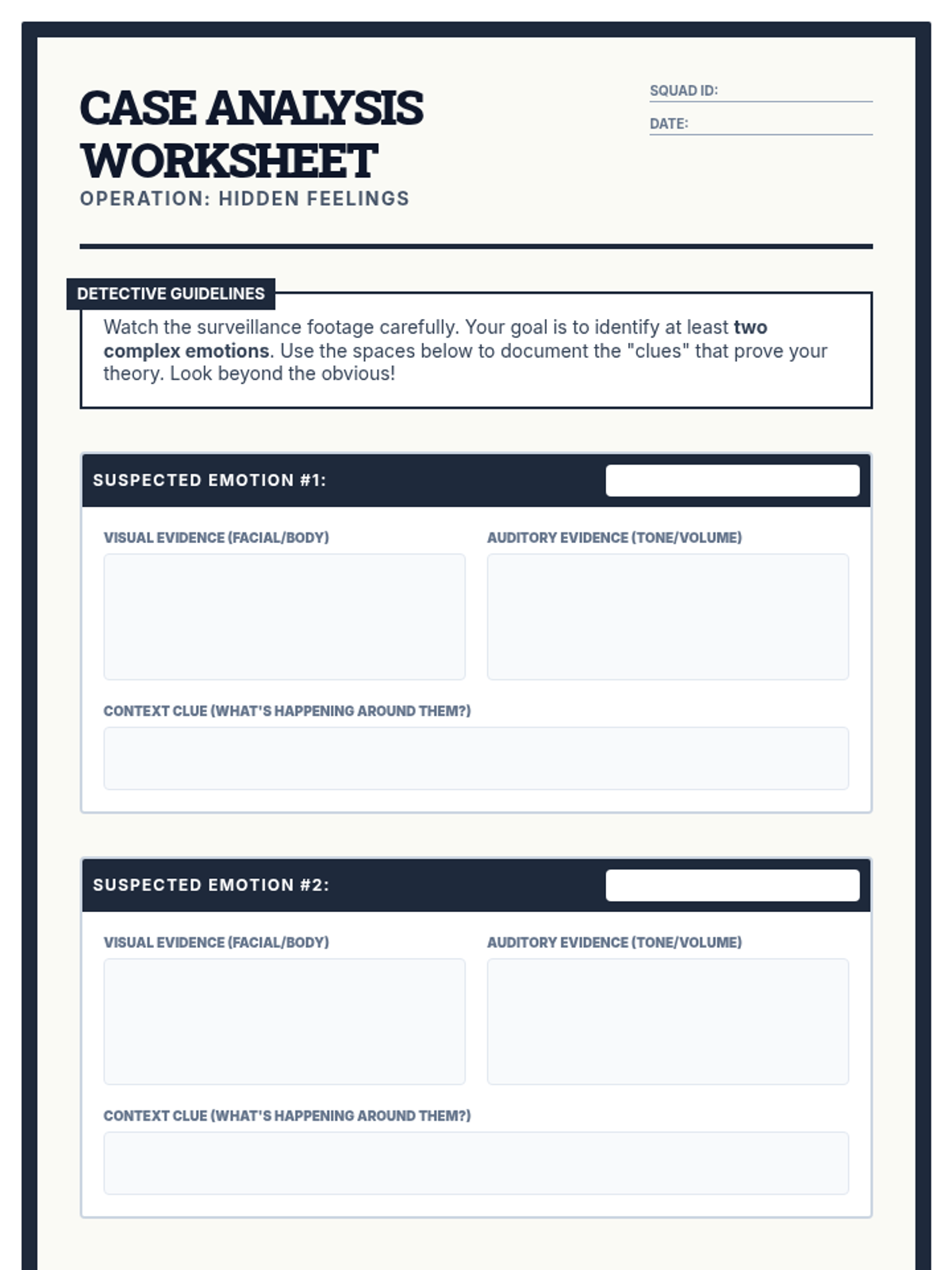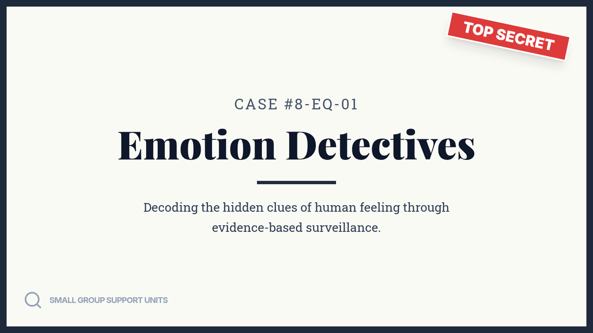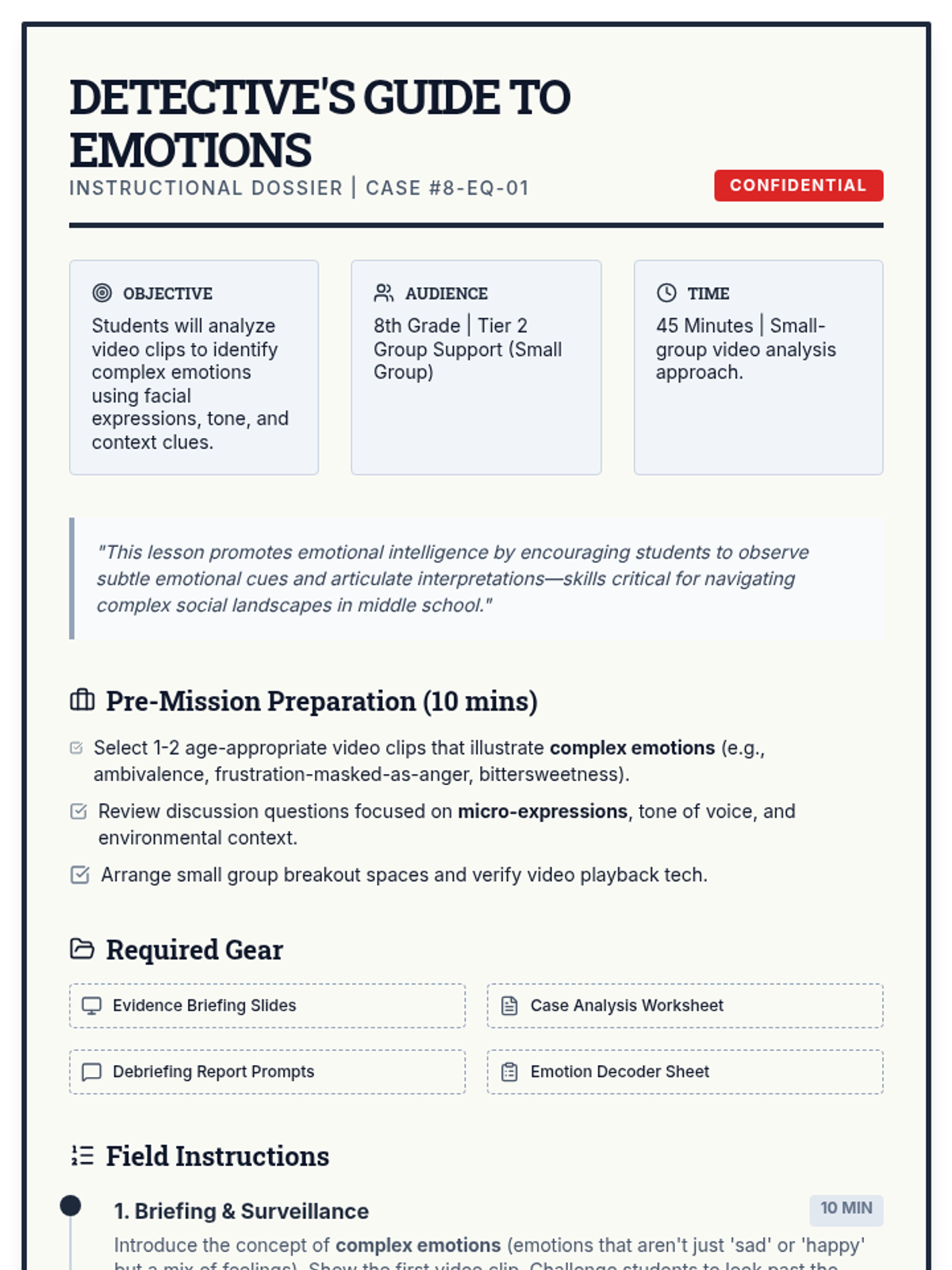 An 8th-grade Tier 2 small group session where students act as detectives to identify and analyze complex emotions in video clips to build emotional intelligence and empathy.