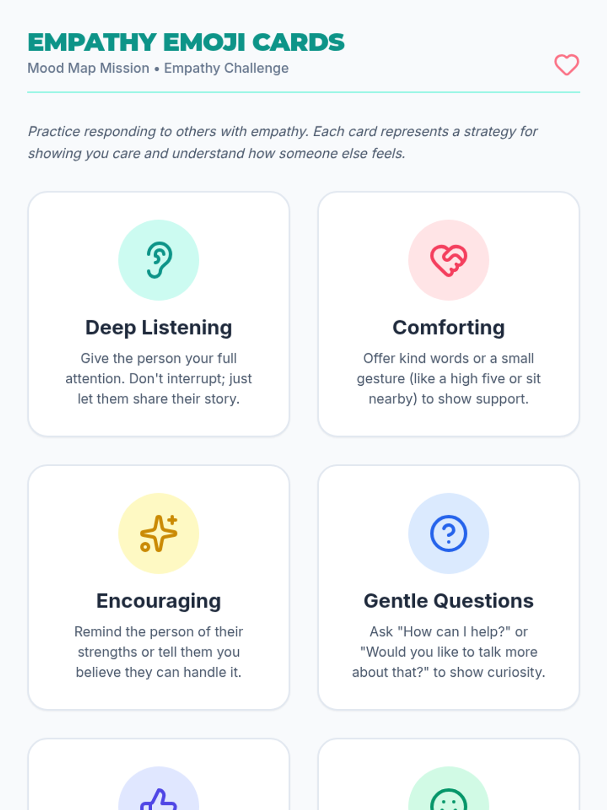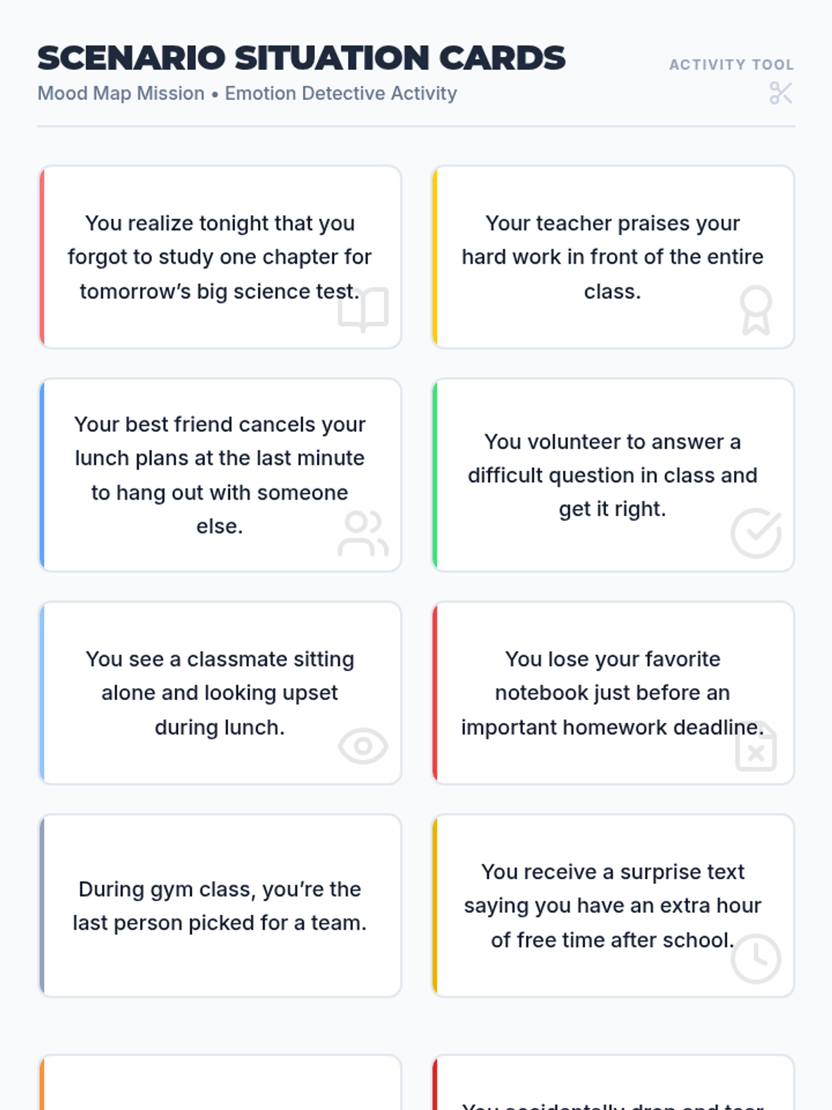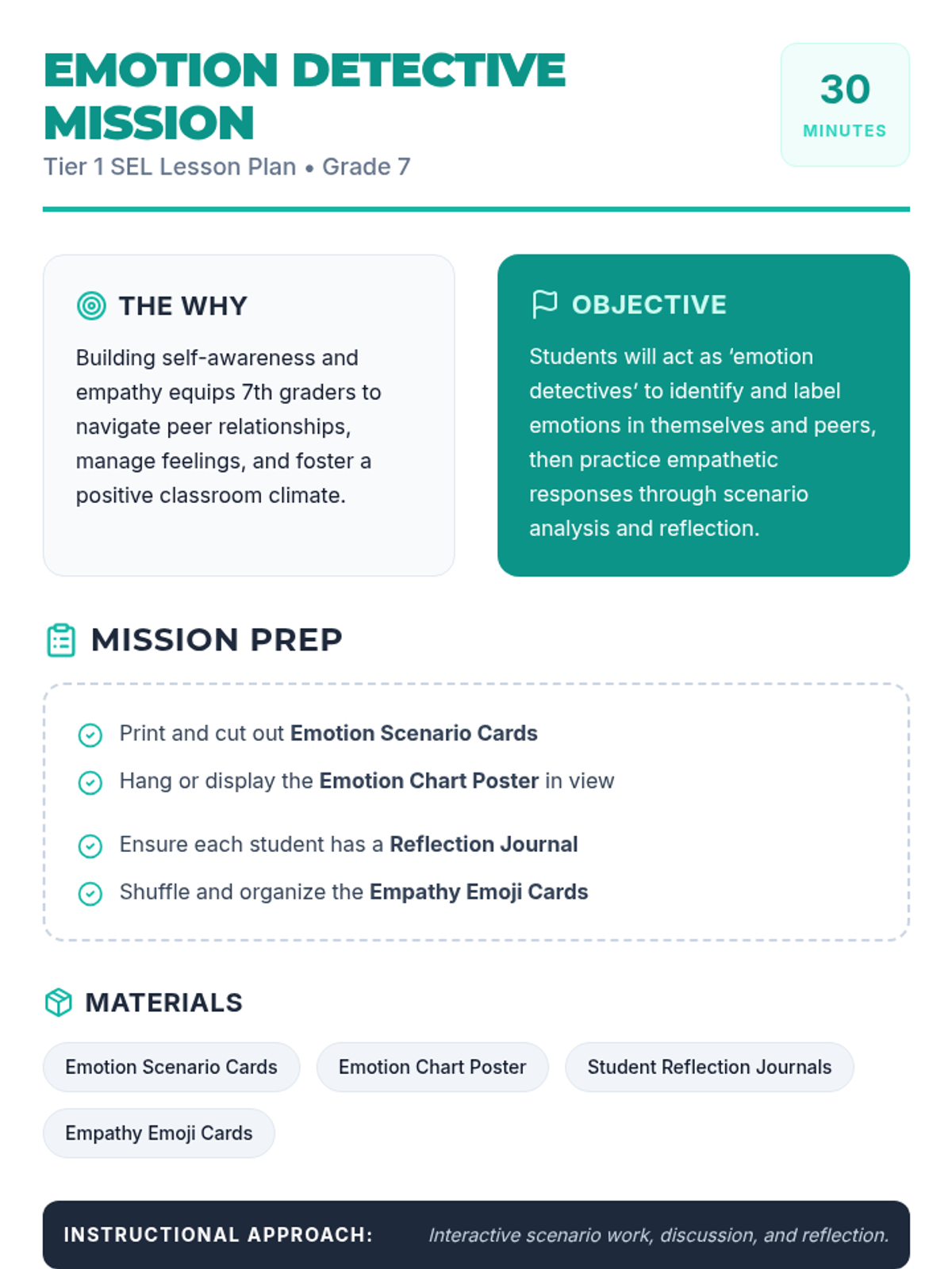 Students act as 'emotion detectives' to identify and label emotions in themselves and peers, practicing empathetic responses through interactive scenario analysis and charades.