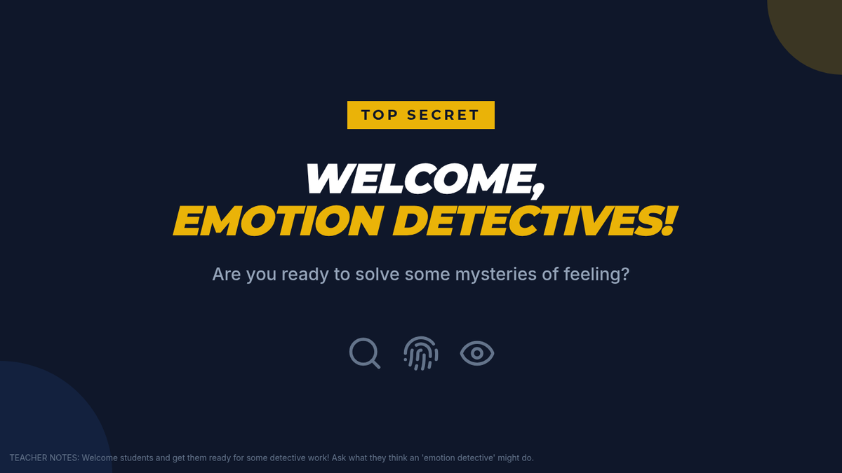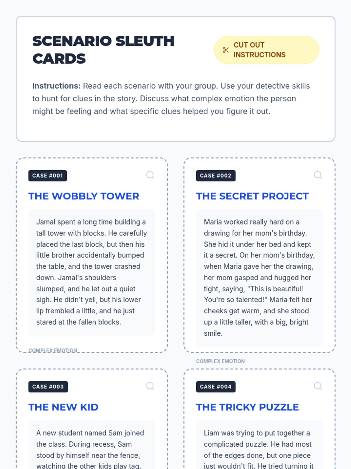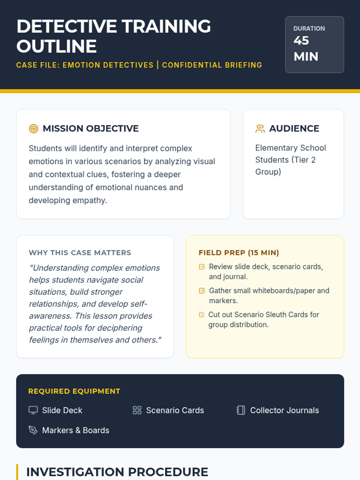 A 45-minute lesson where elementary students become 'emotion detectives,' using visual and situational clues to identify complex feelings like frustration, pride, and anxiety. Students practice empathy and social-emotional awareness through group activities and individual reflection.