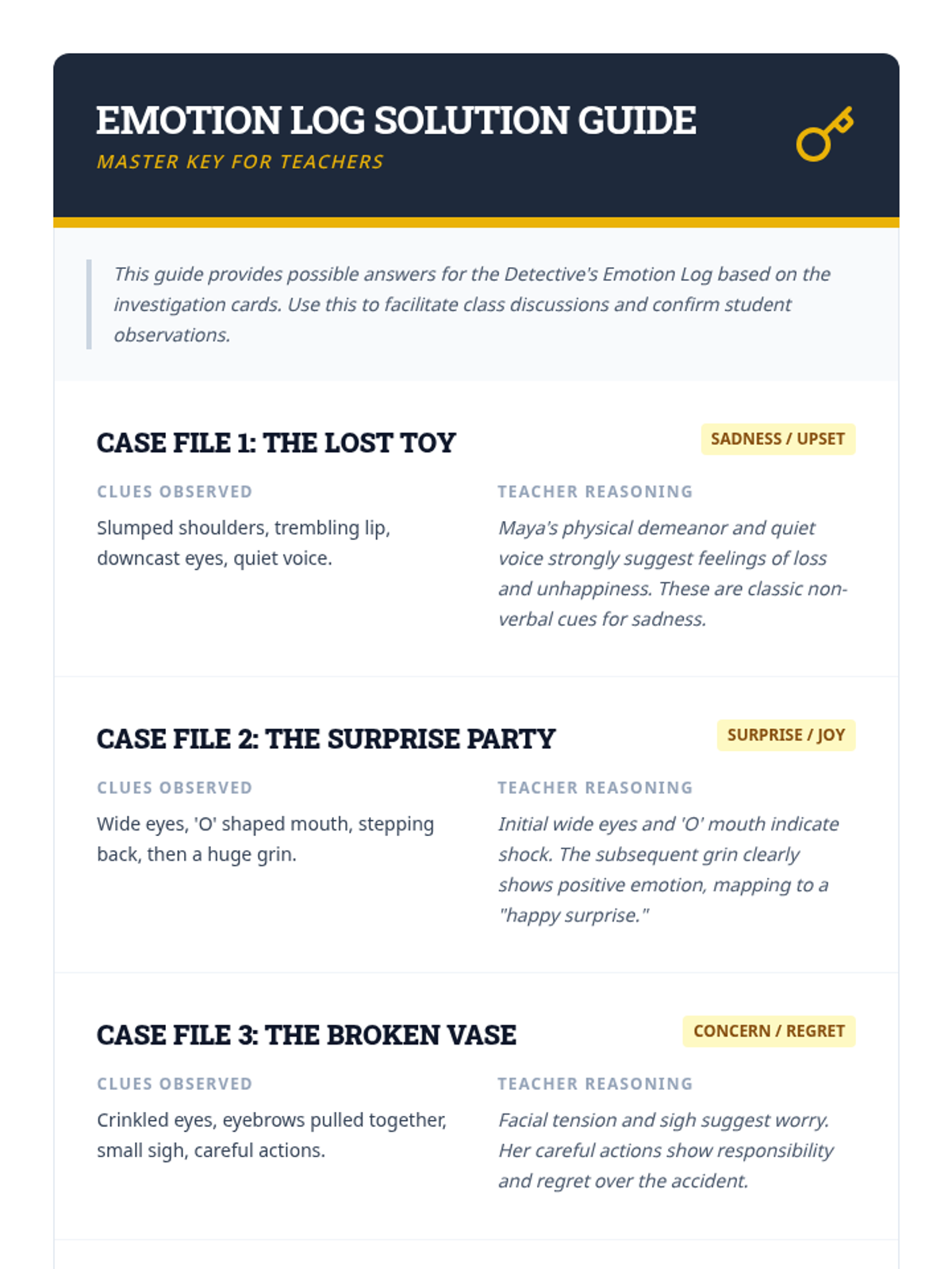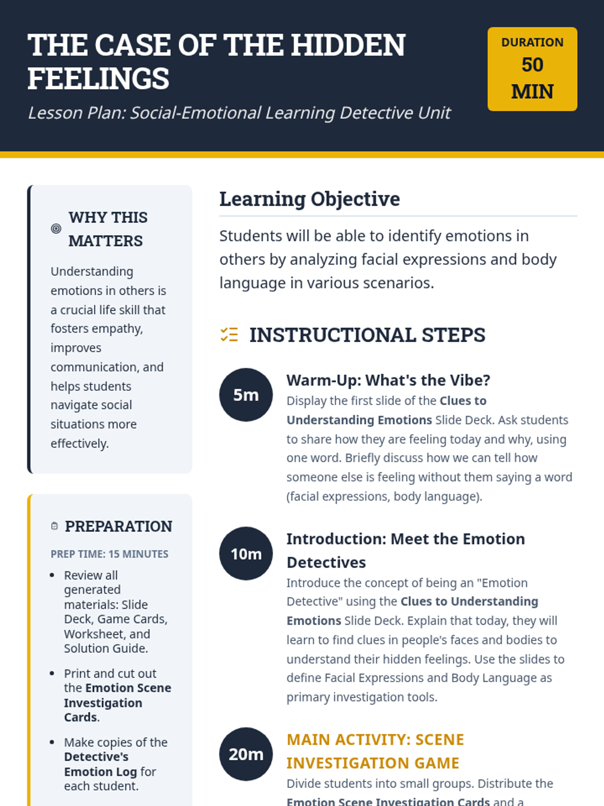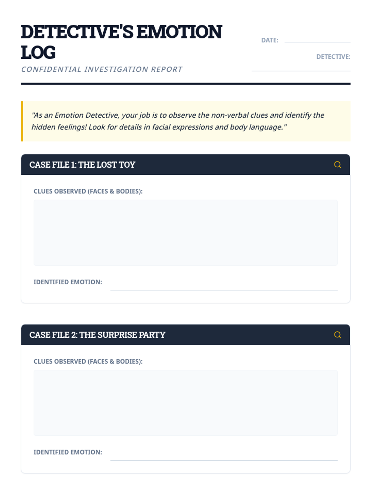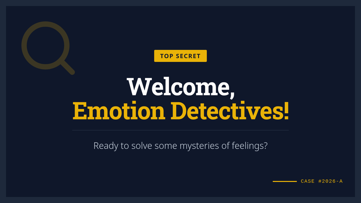 A detective-themed small group lesson focused on identifying emotions through facial expressions and body language clues. Students analyze scenarios and non-verbal cues to build empathy and social awareness.