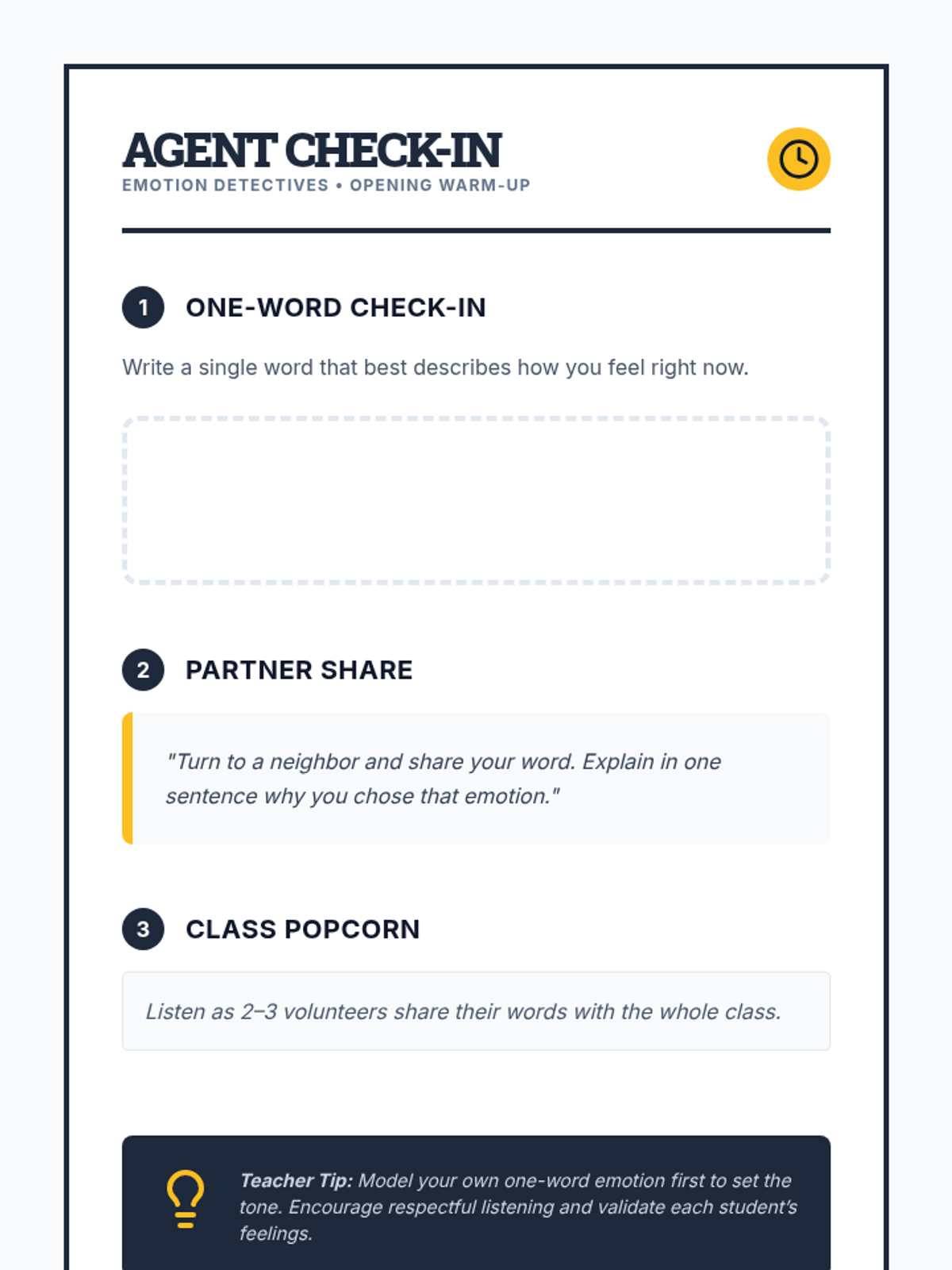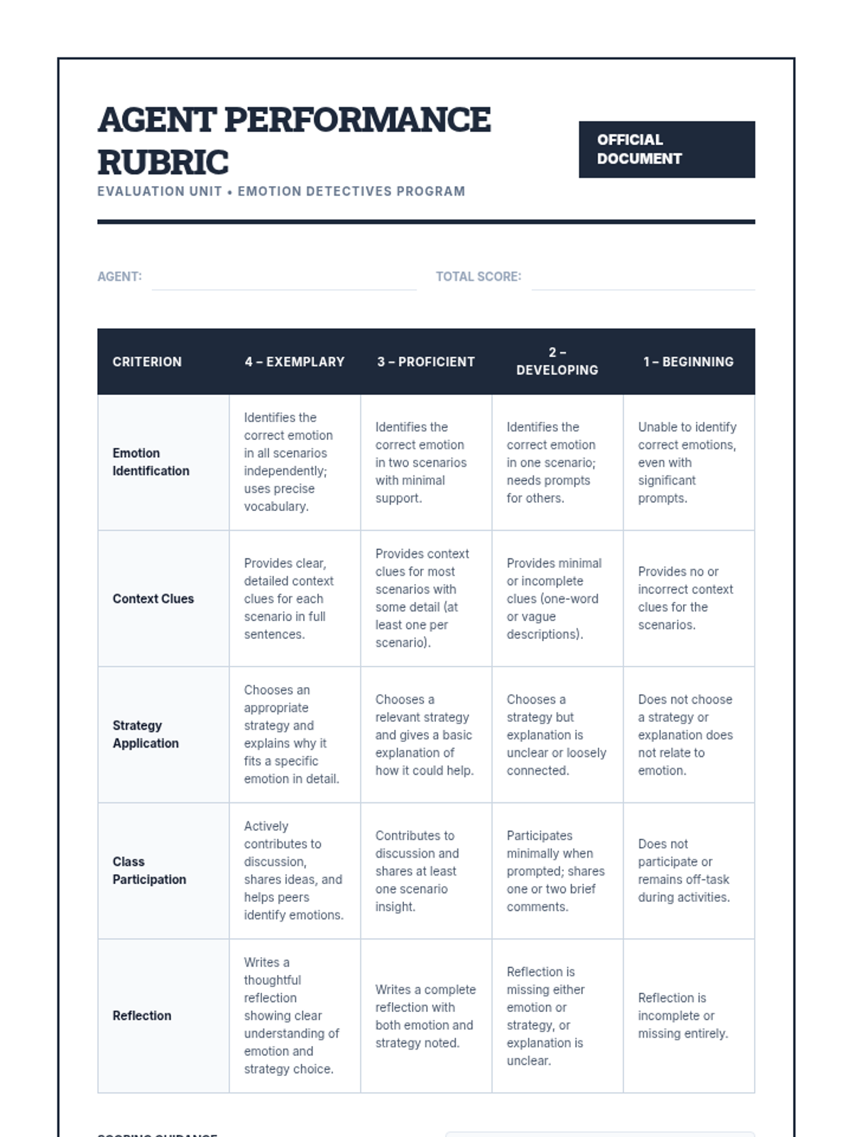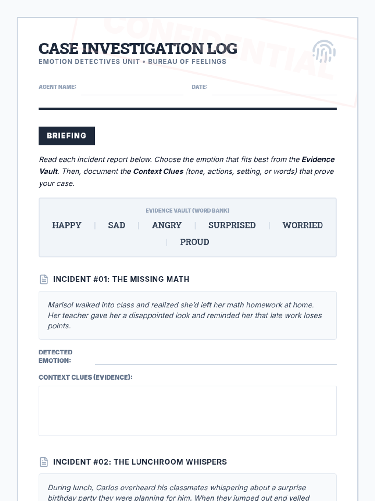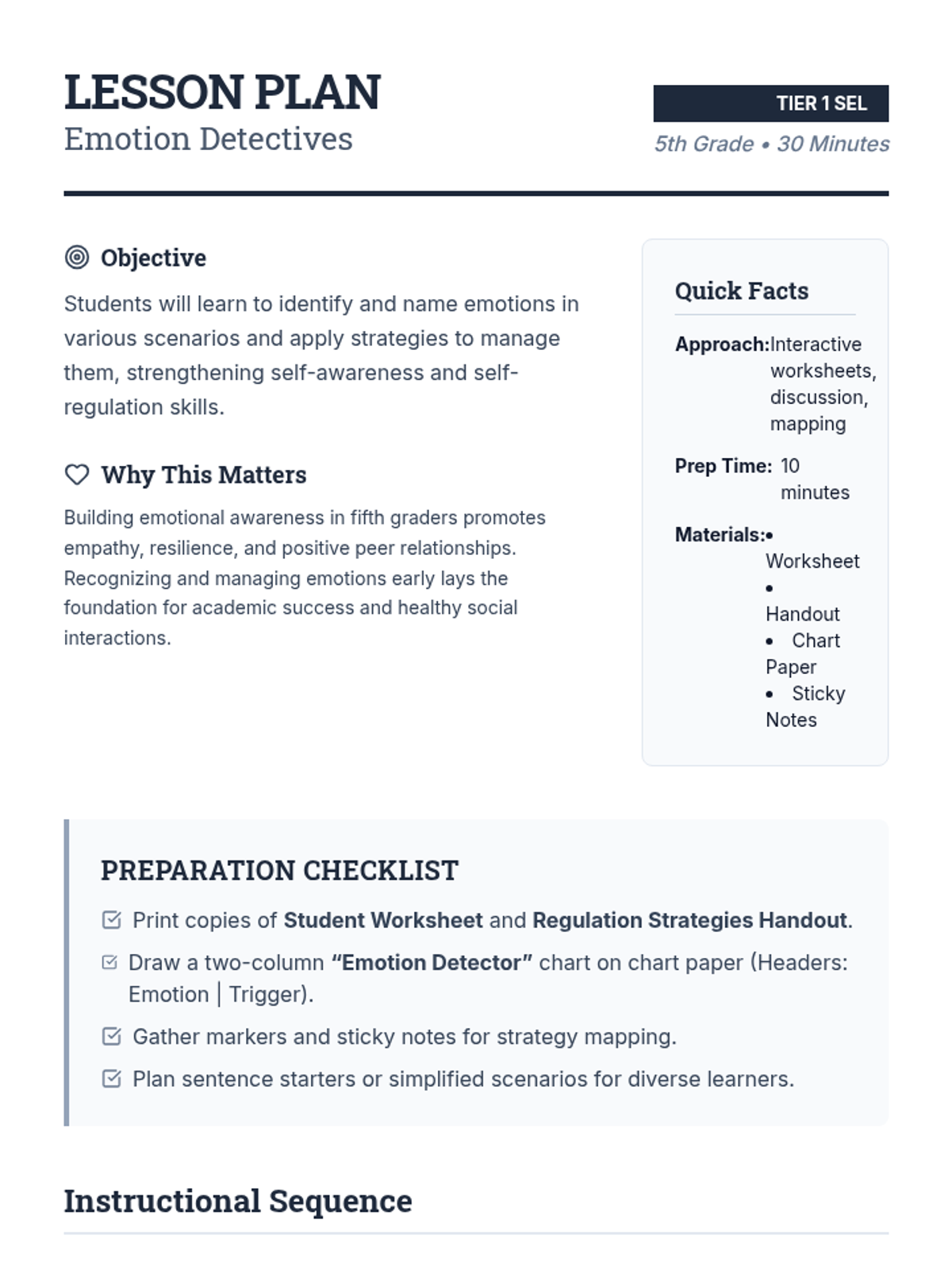 A 30-minute Tier 1 SEL lesson for 5th graders focused on identifying emotions through context clues and learning regulation strategies. Students become 'Emotion Detectives' to build self-awareness and empathy.