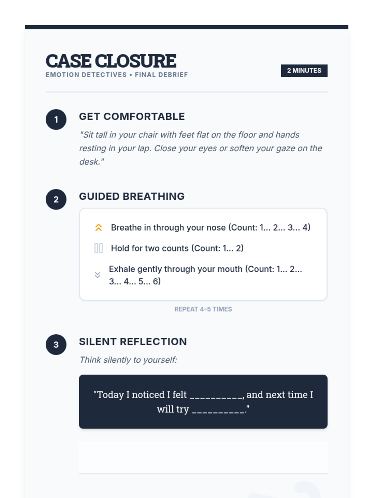 A 30-minute professional development session for preschool and K-8 staff focusing on restorative circles, affective statements, and re-entry reflection tools.
