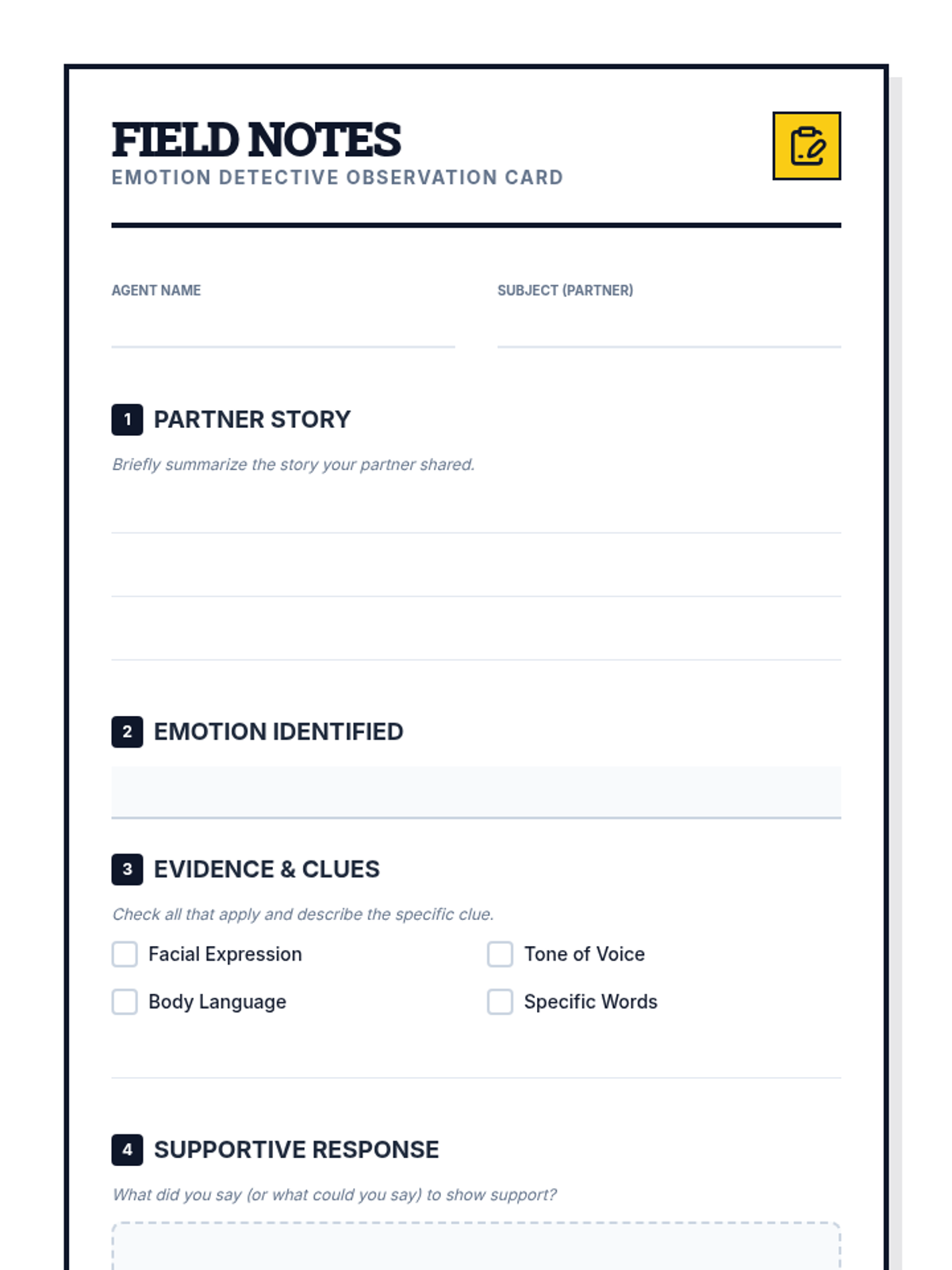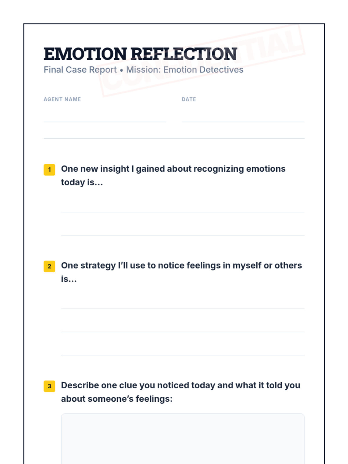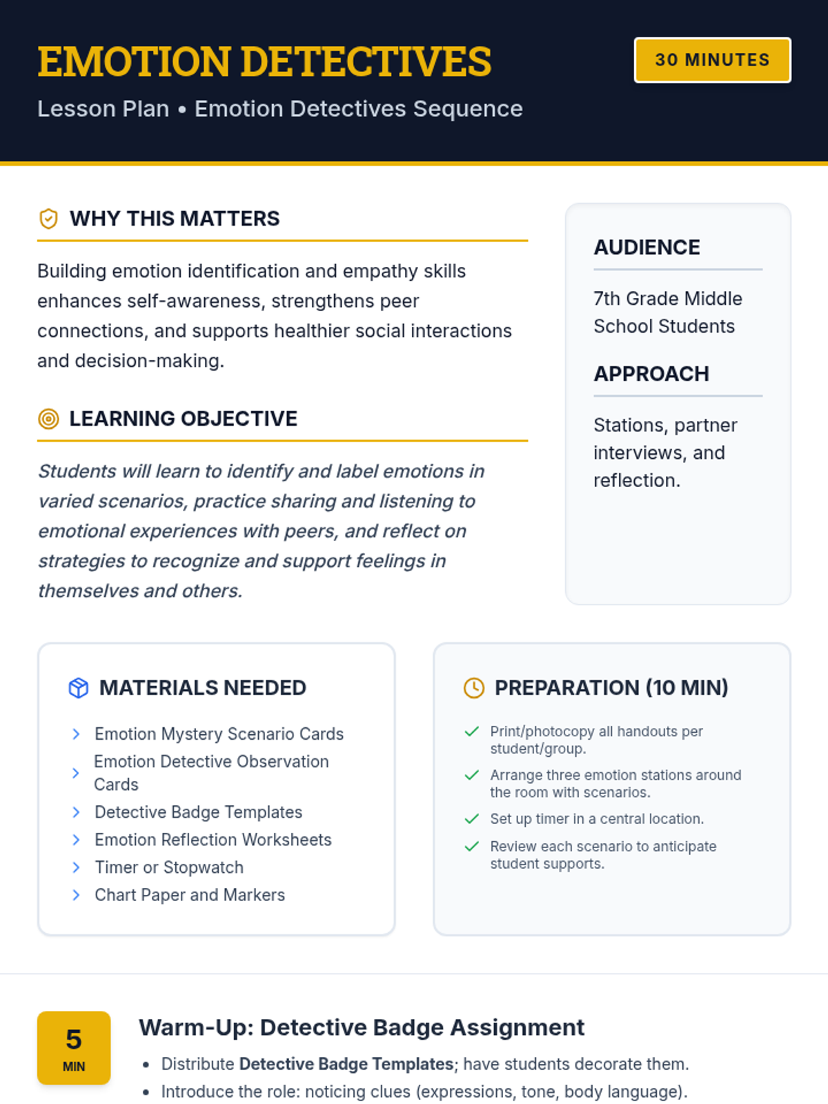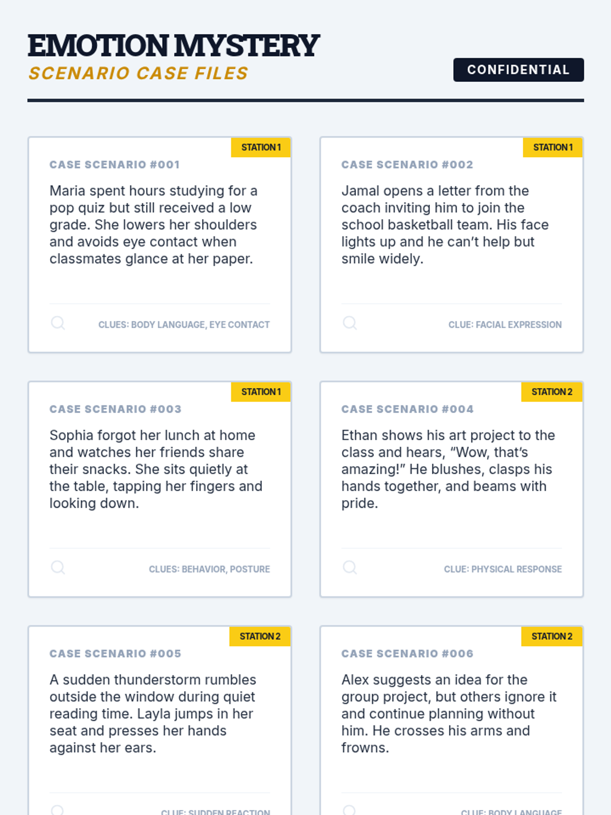 Students refine their emotion-identification skills by rotating through 'mystery stations' to find clues in facial expressions and body language, followed by partner interviews.