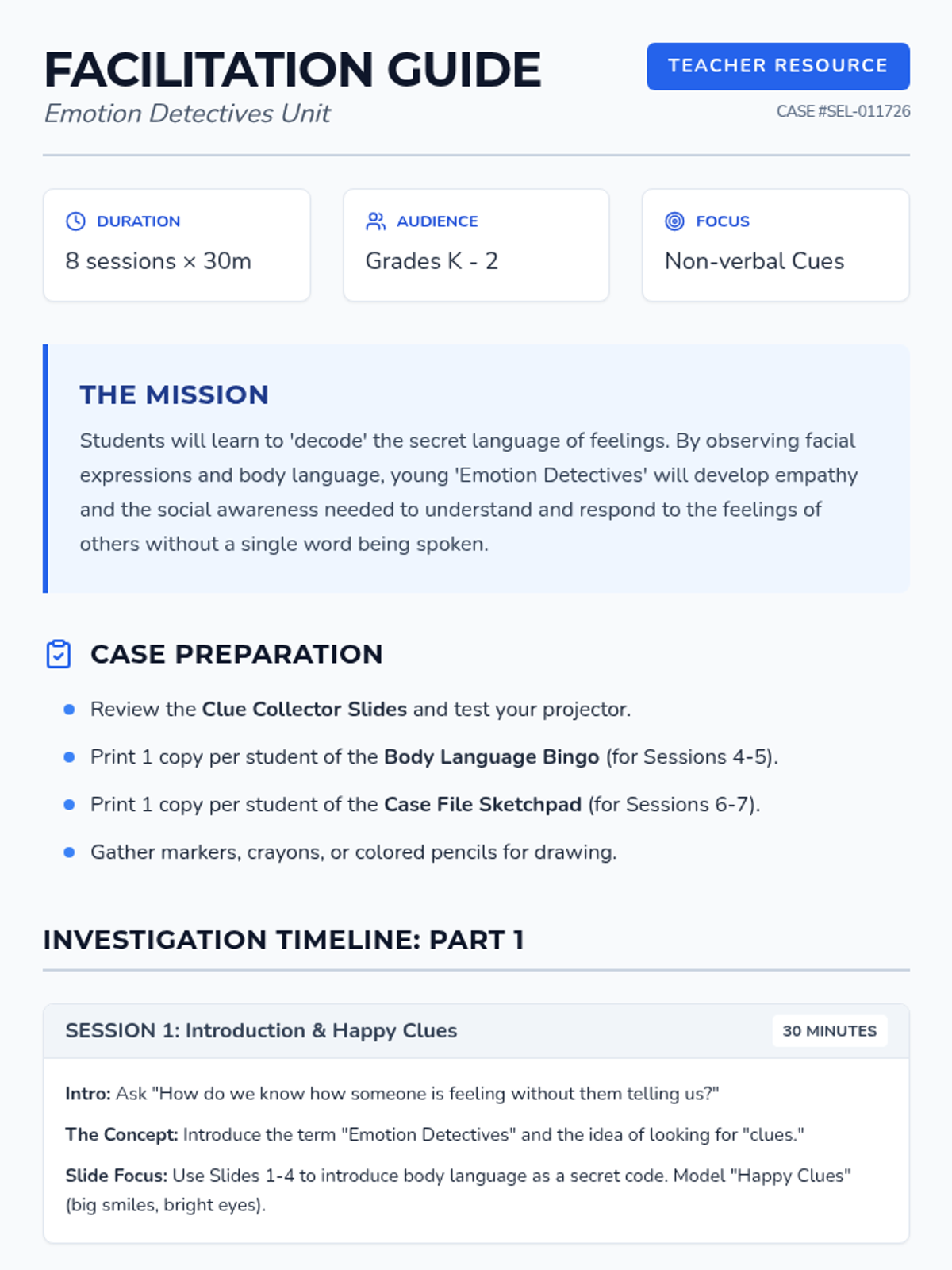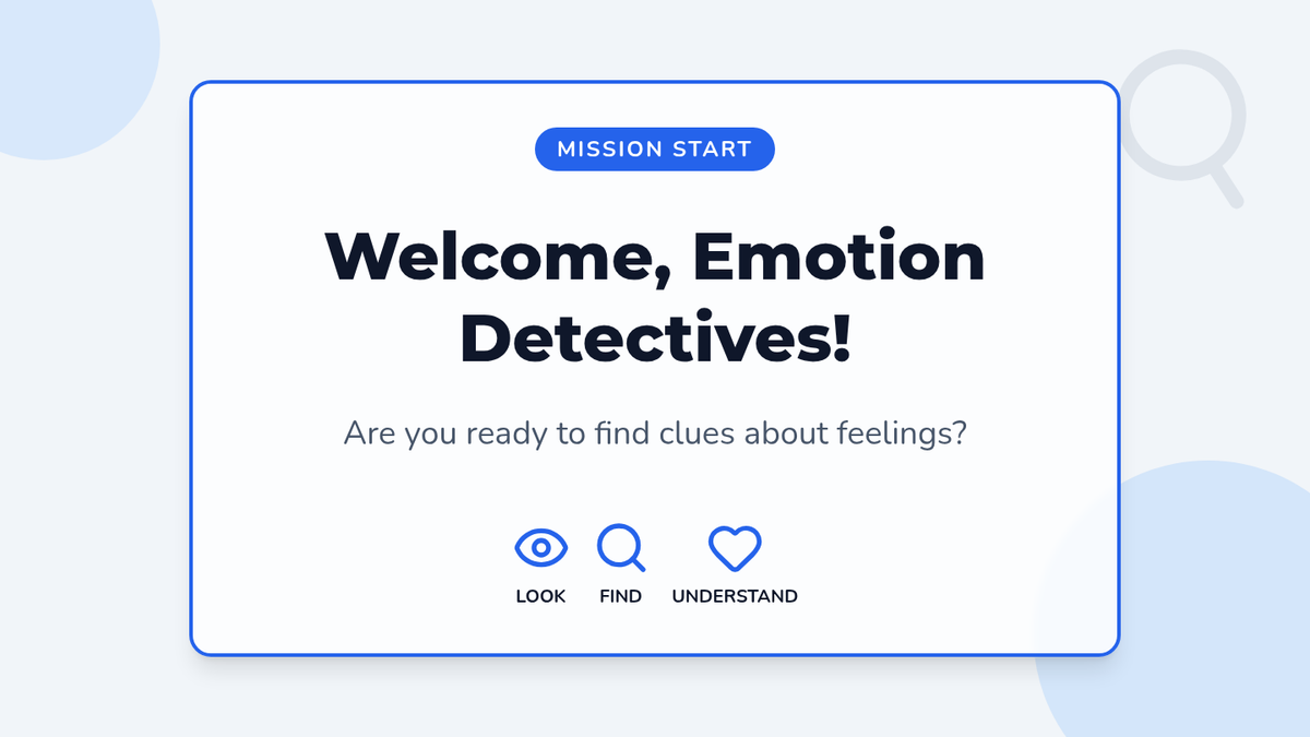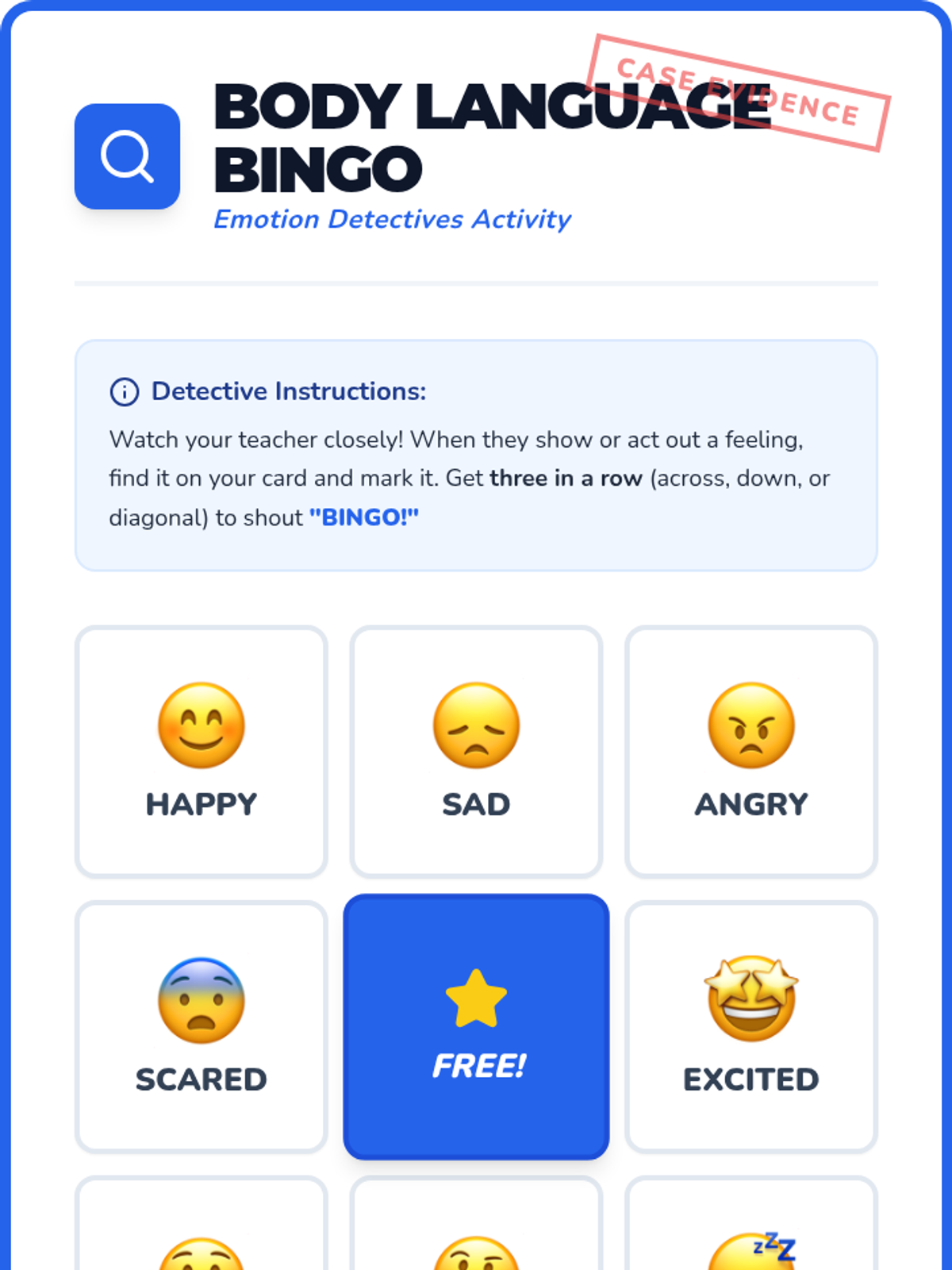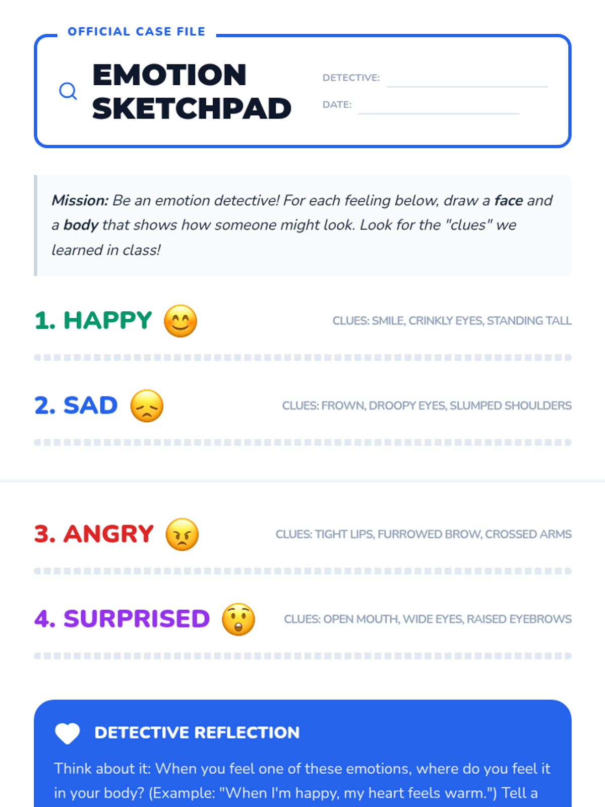 Students become Emotion Detectives to identify and name core emotions by looking for facial and body clues. This K-3 lesson focuses on happy, sad, angry, scared, surprised, and disgusted.