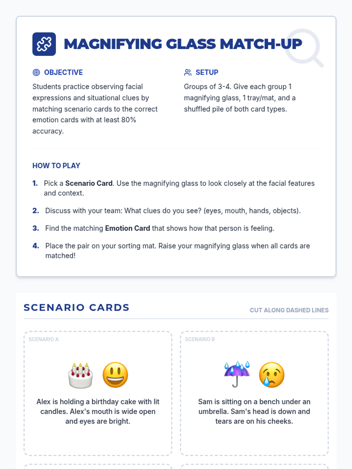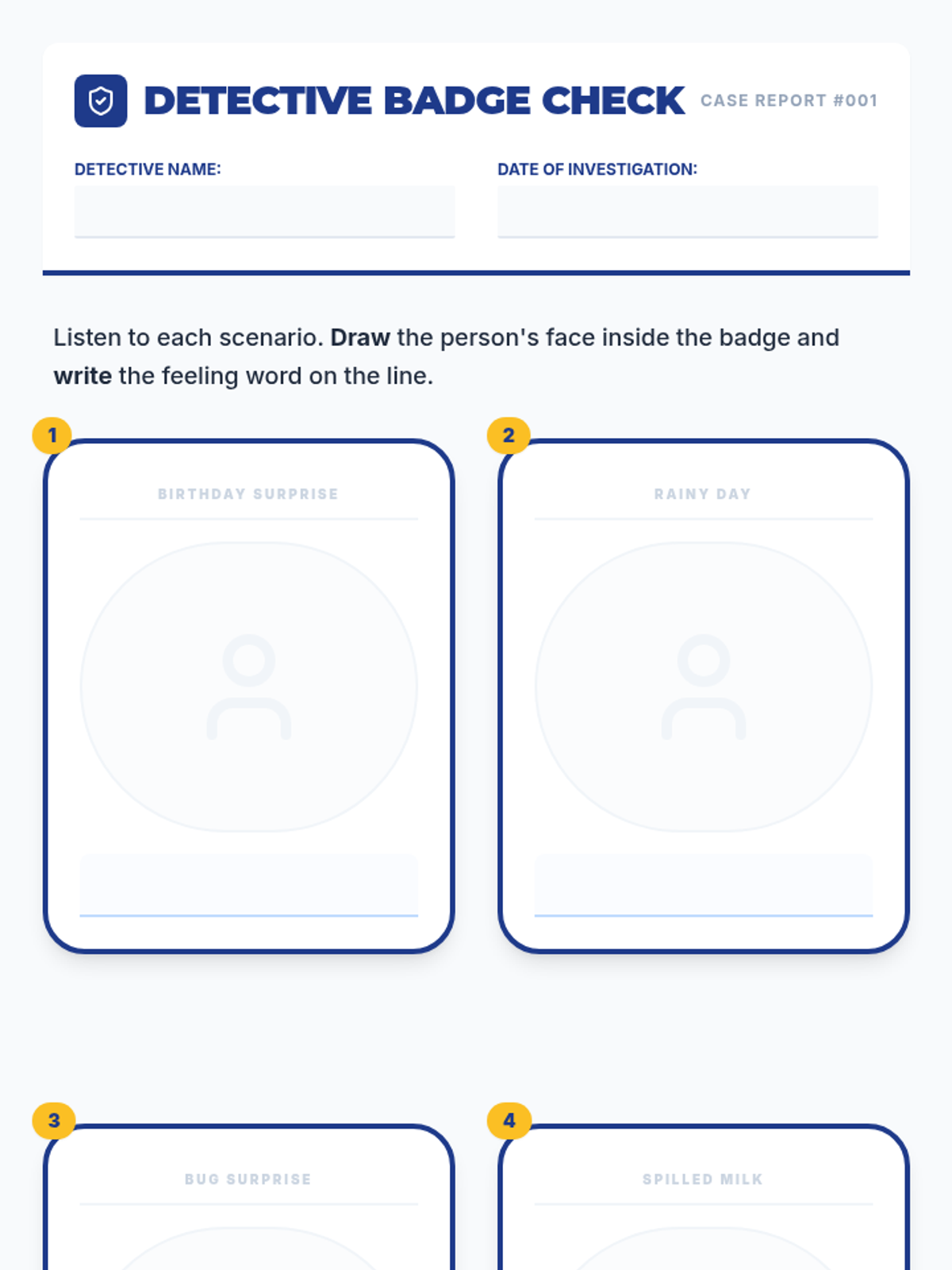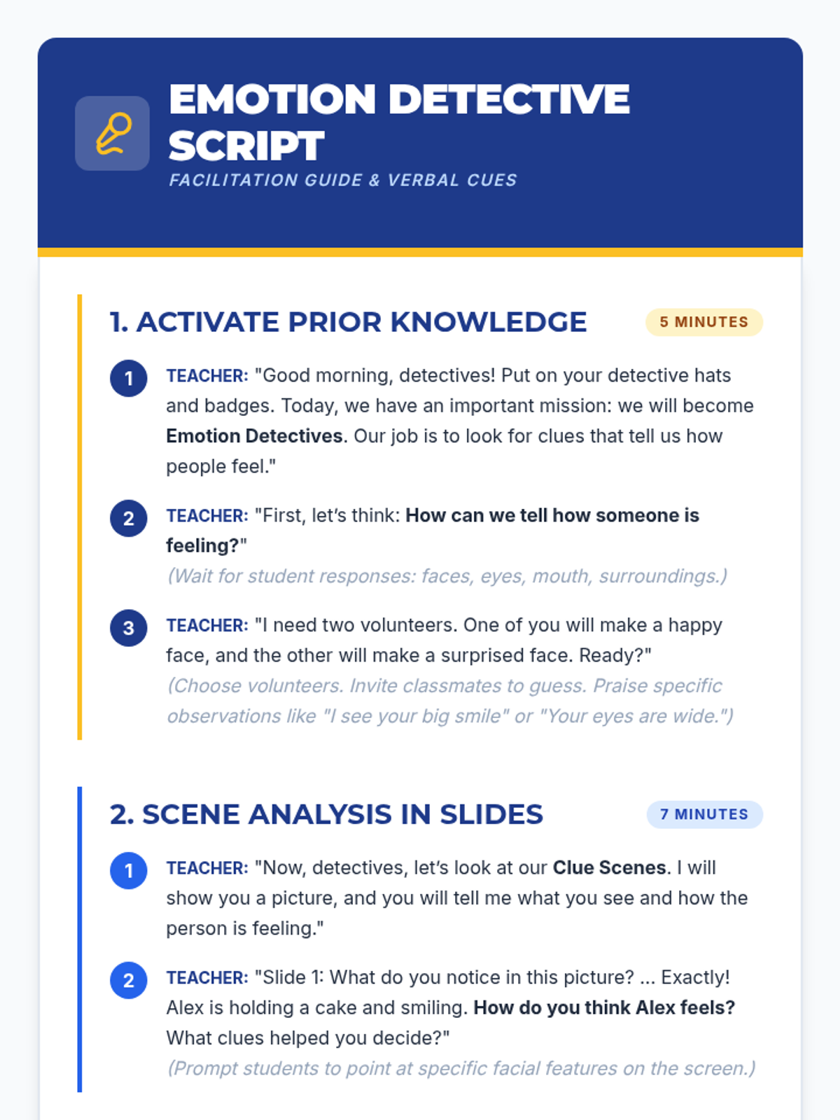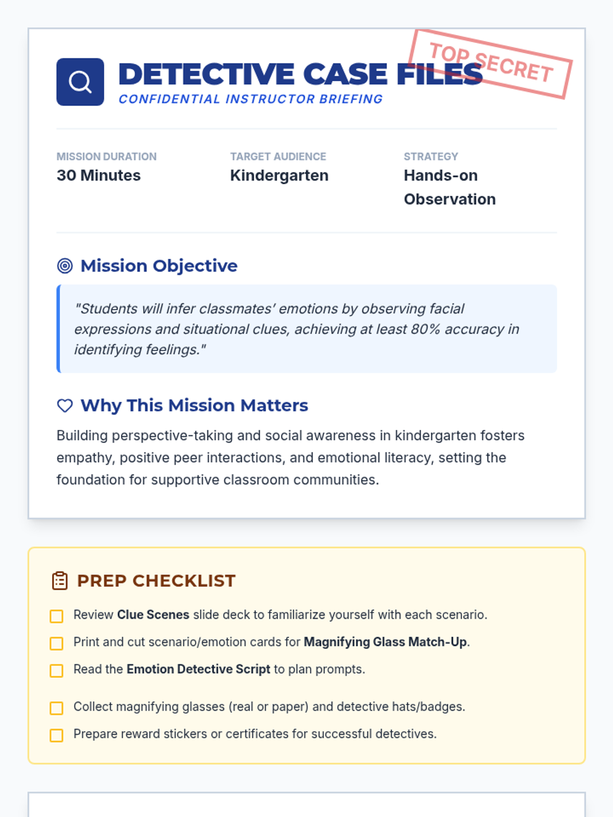 A 30-minute kindergarten lesson where students become 'Emotion Detectives' to infer classmates' feelings using facial expressions and situational clues.