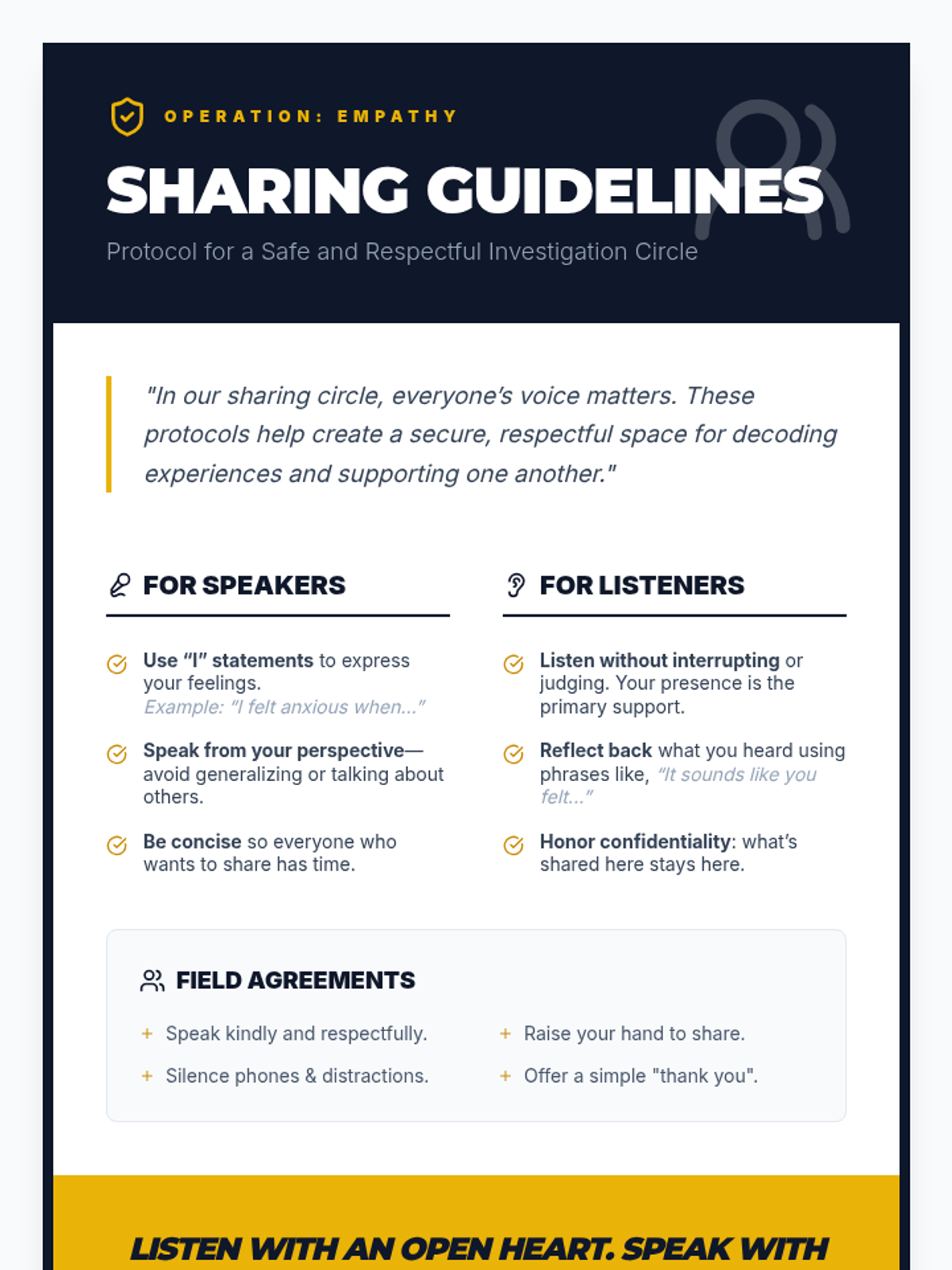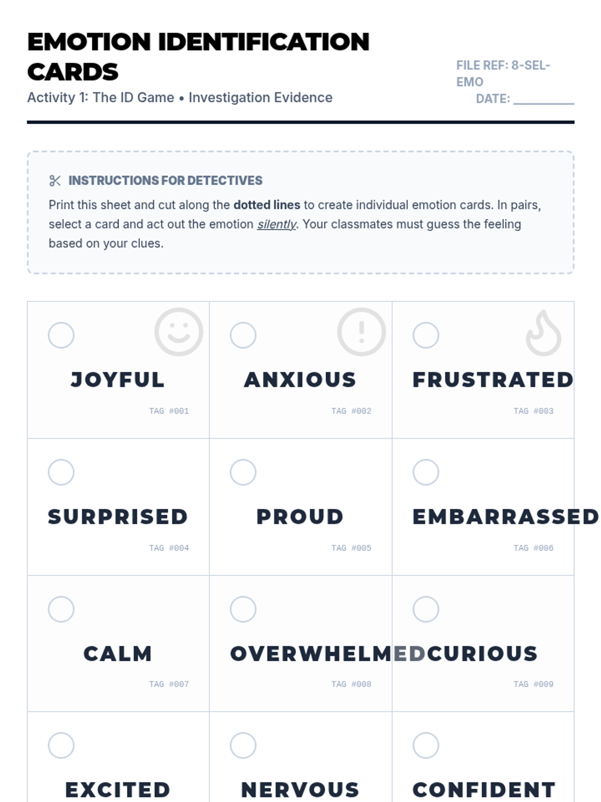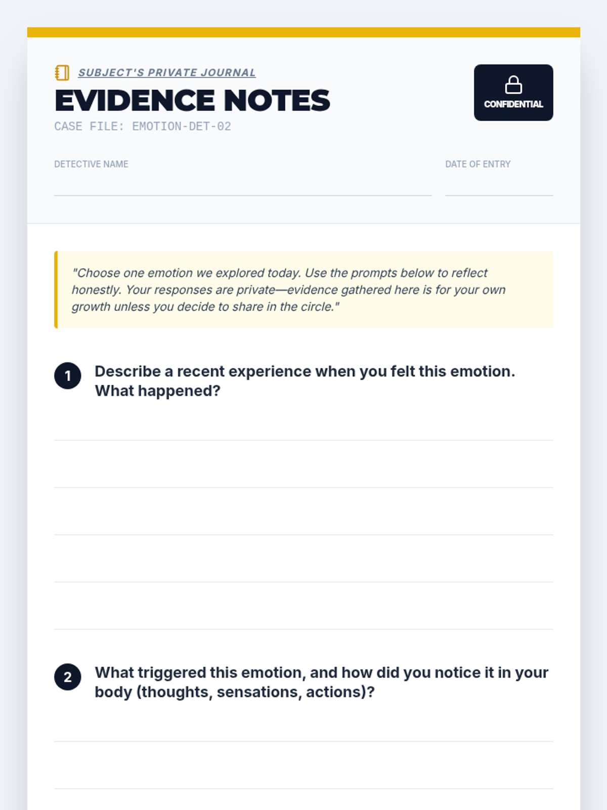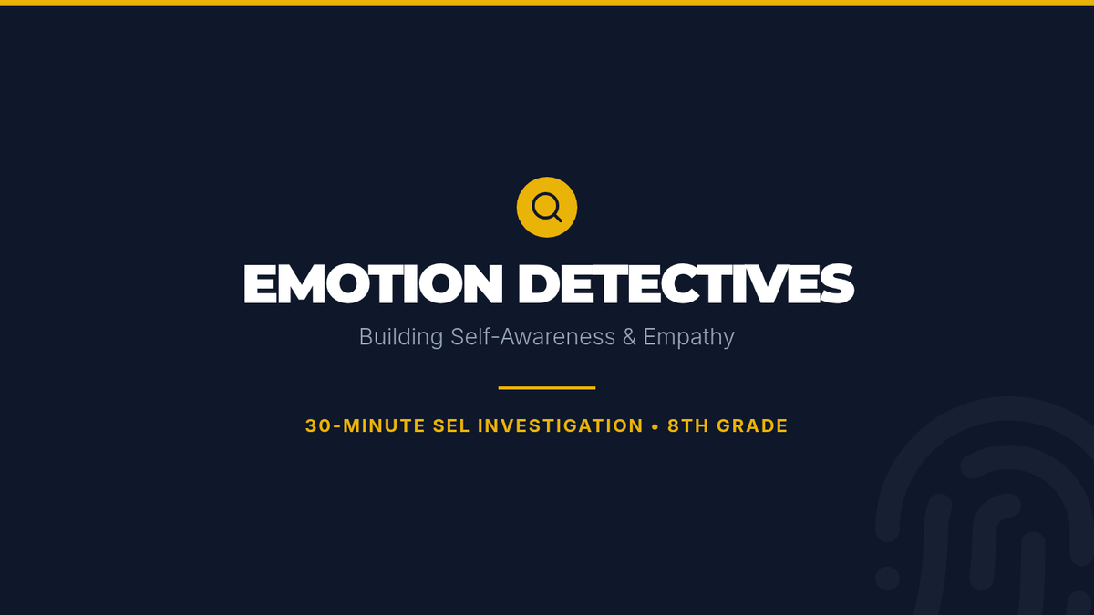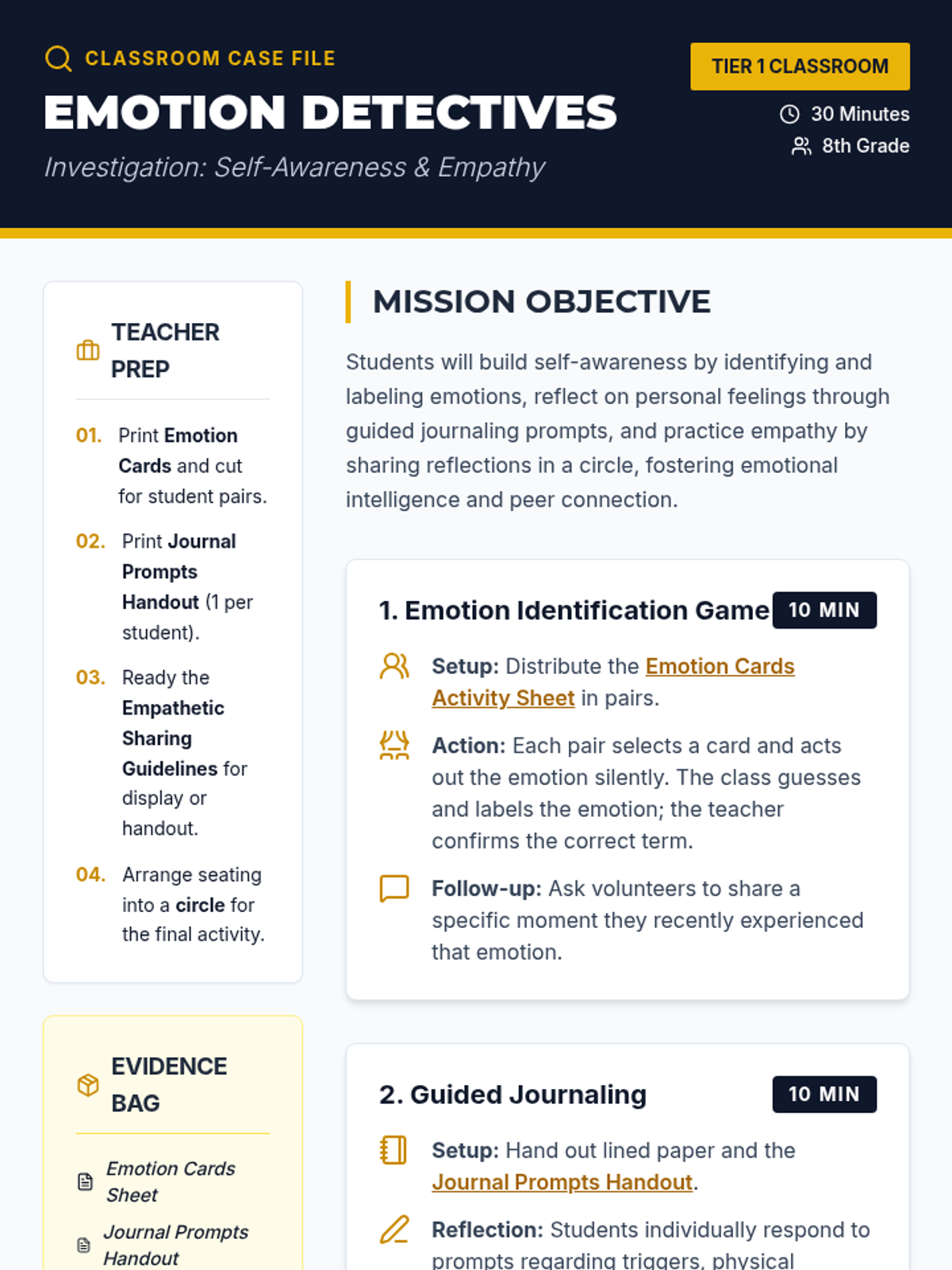 An 8th-grade SEL lesson focused on identifying emotions, self-reflection through journaling, and practicing empathy in a community circle. Students take on the role of 'detectives' to decode their own and others' emotional states.