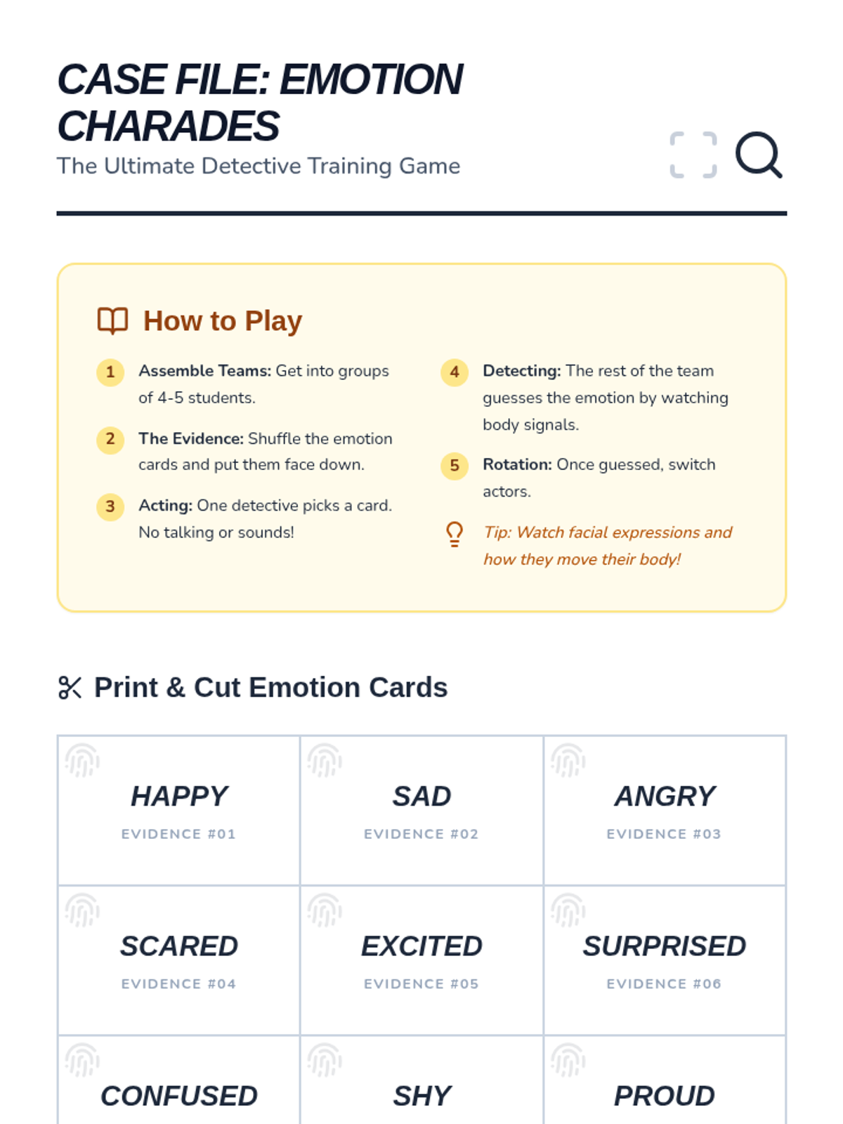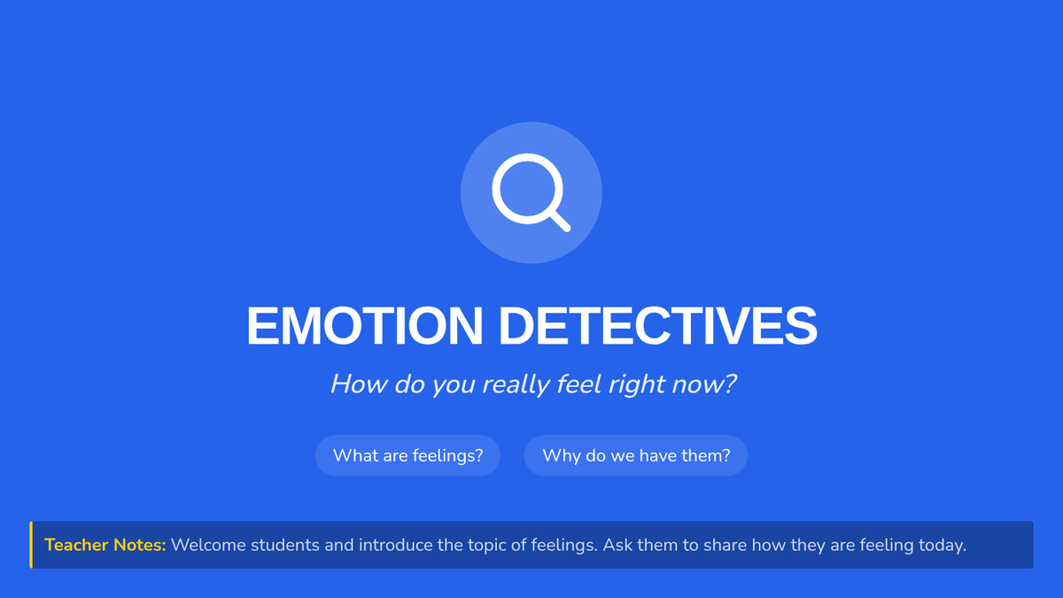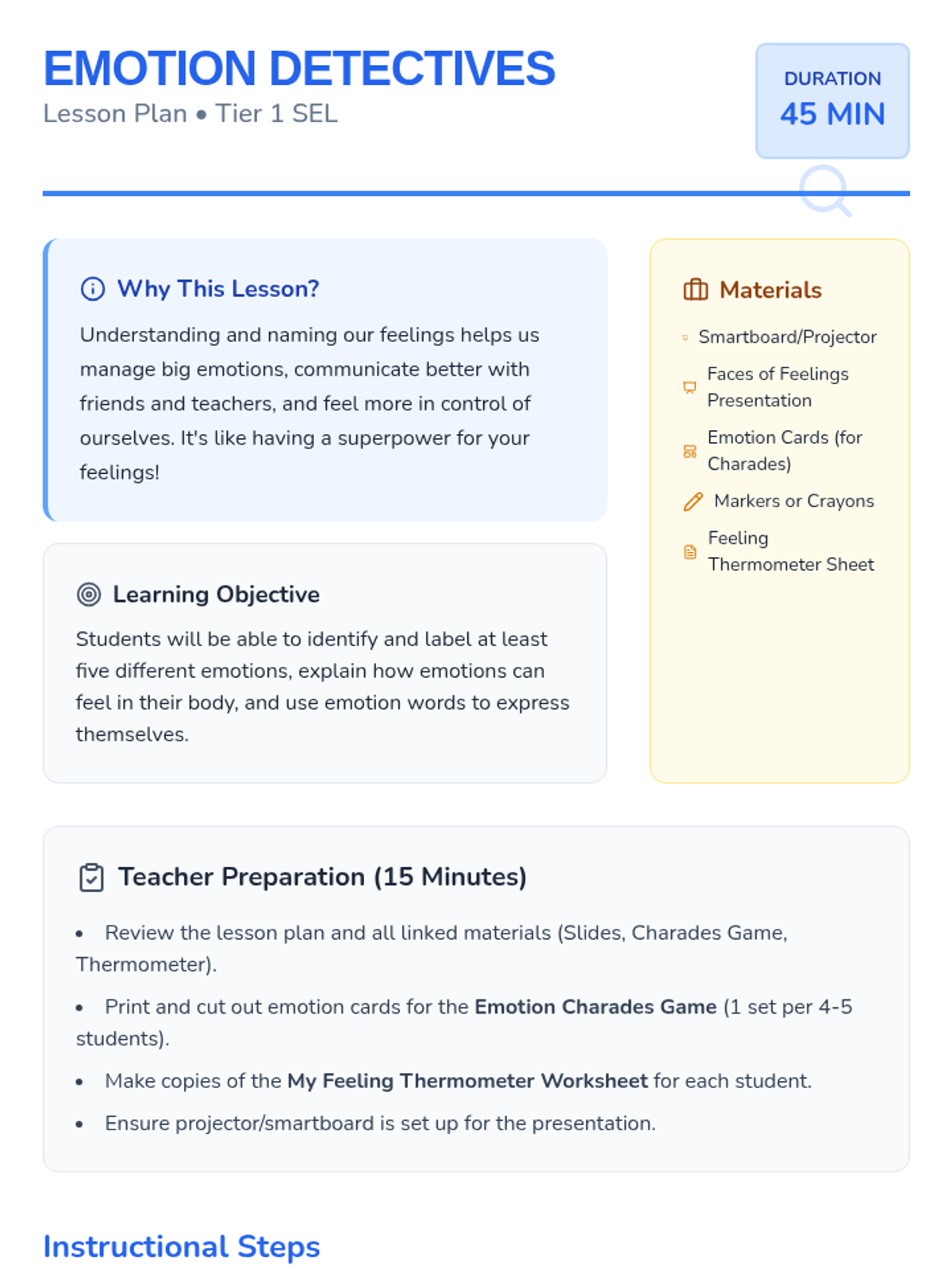 A 45-minute social-emotional learning lesson for 3rd grade students to identify, label, and measure the intensity of their emotions using the 'Emotion Detective' framework.
