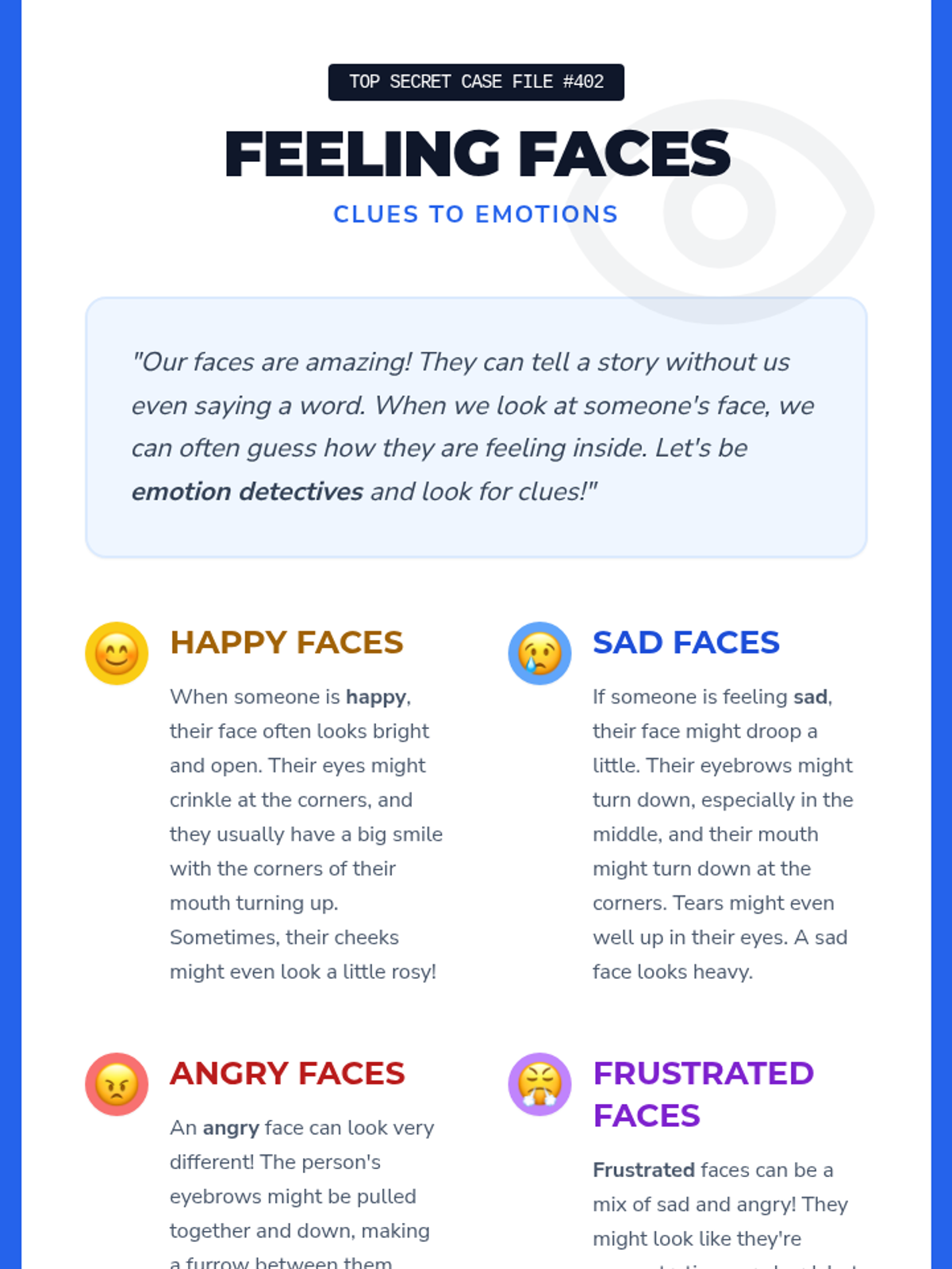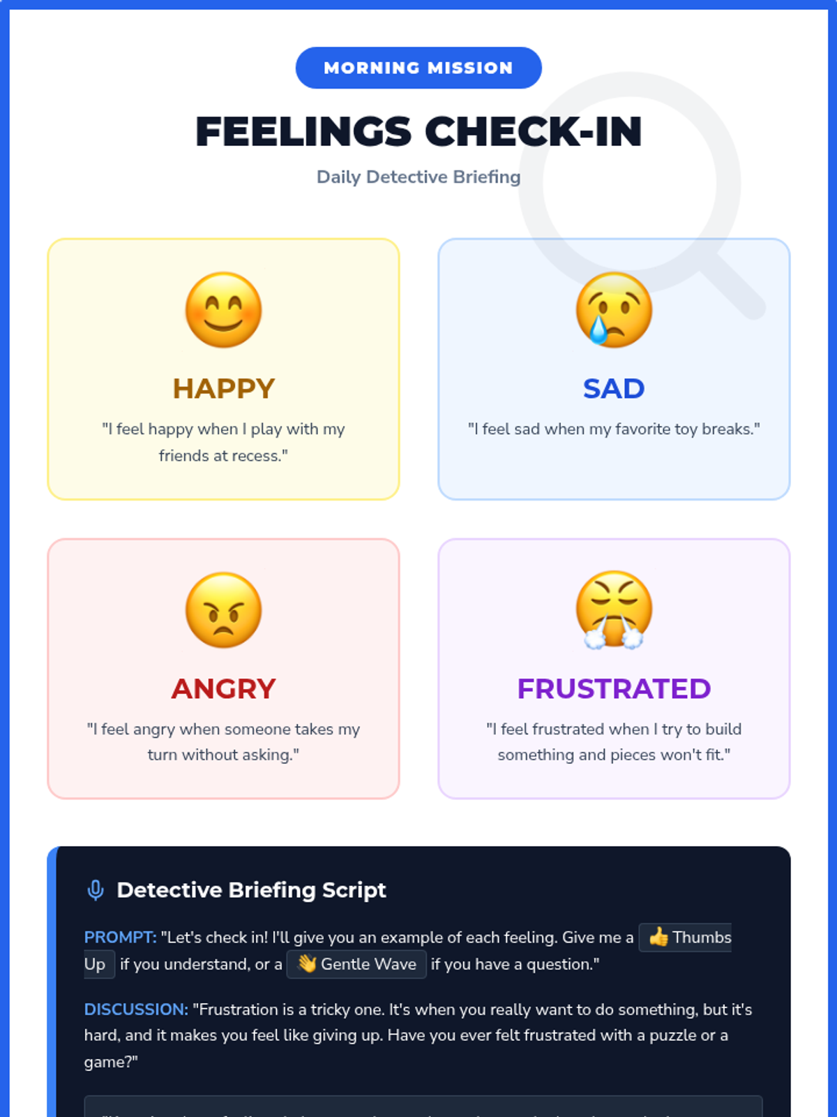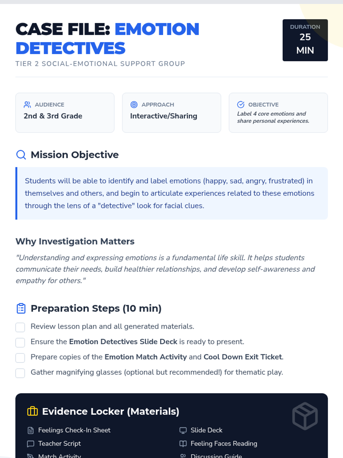 A single-session Tier 2 group lesson for 2nd and 3rd graders focused on identifying and labeling emotions like happy, sad, angry, and frustrated through interactive 'detective' activities.
