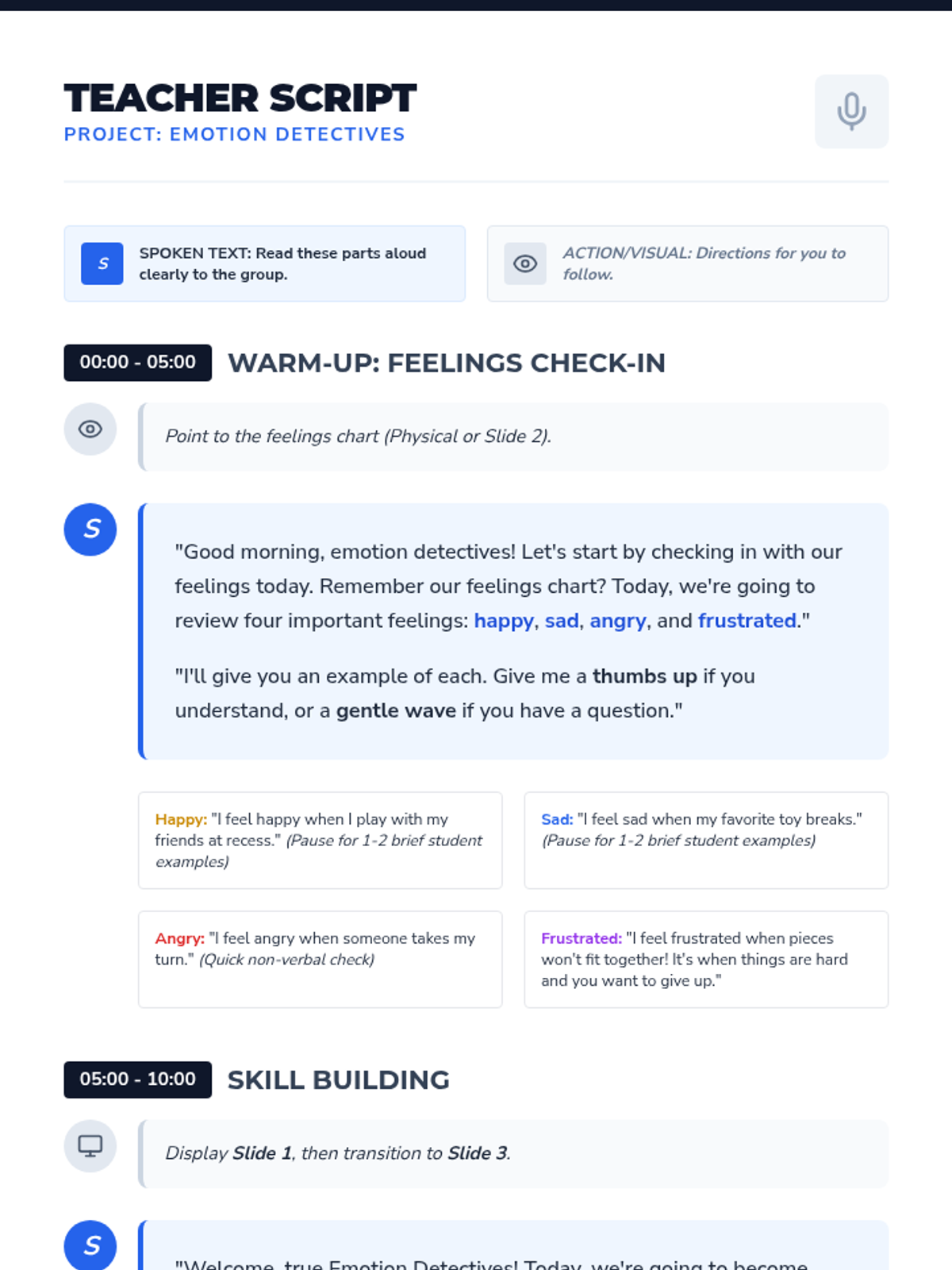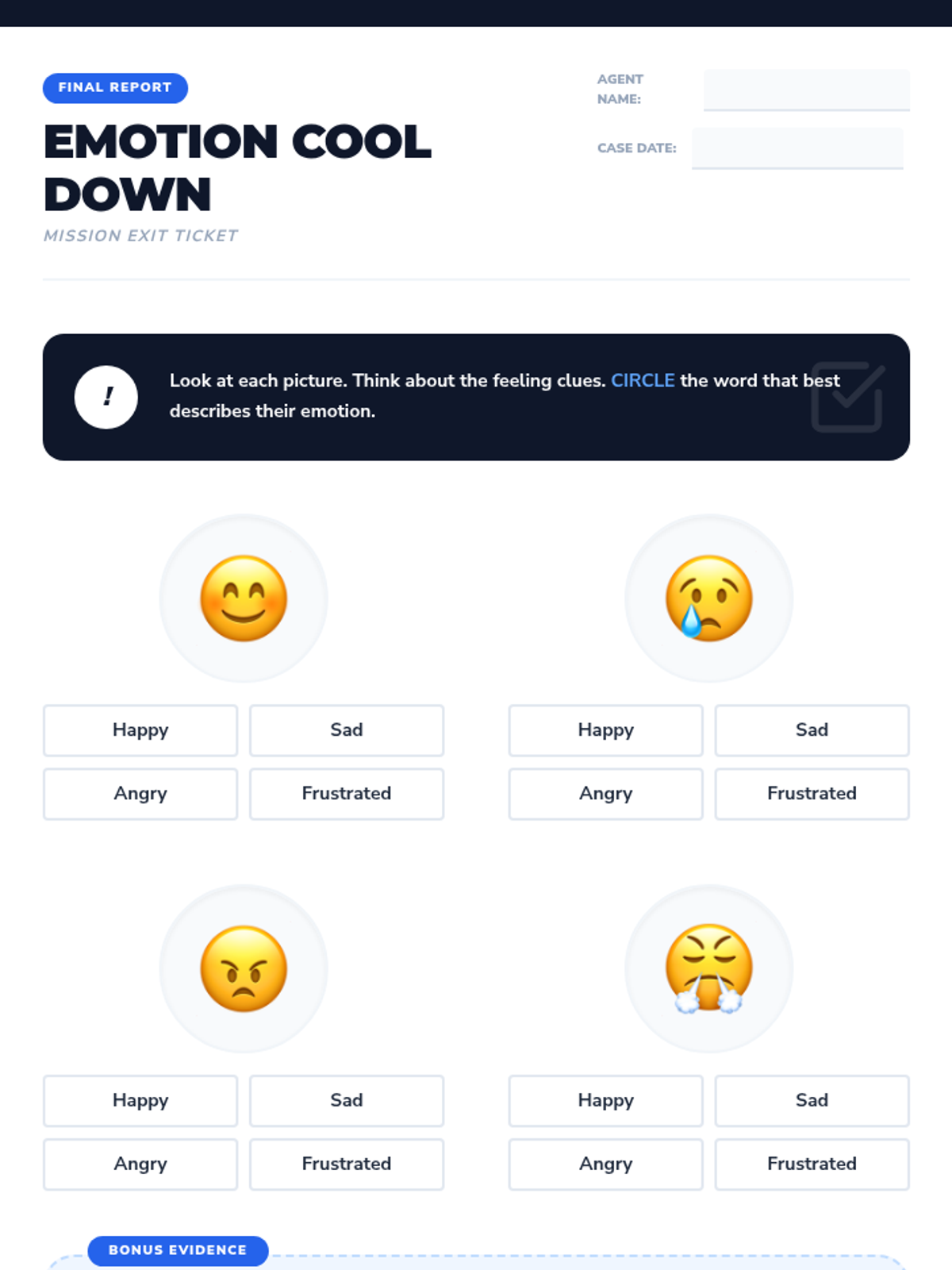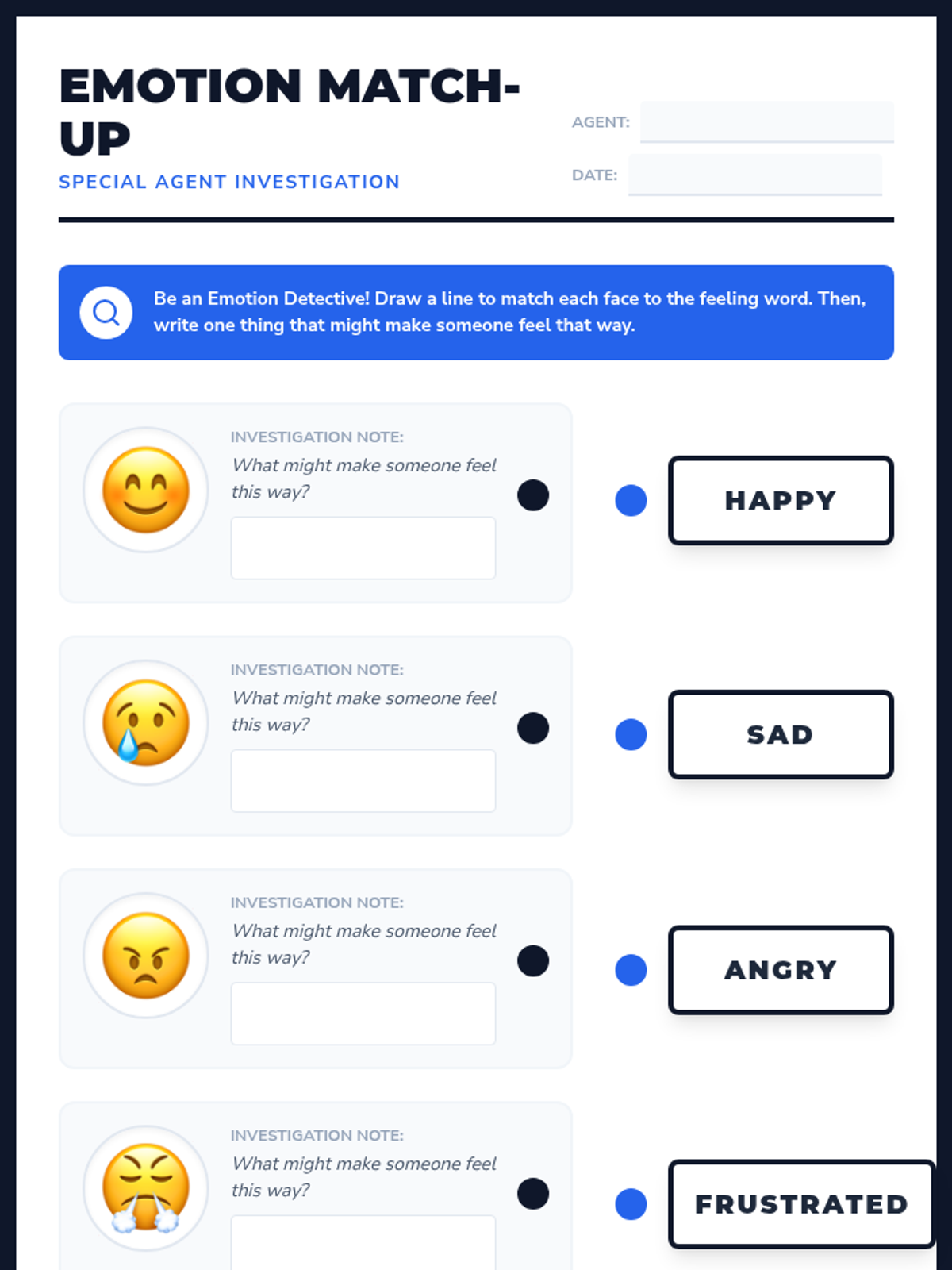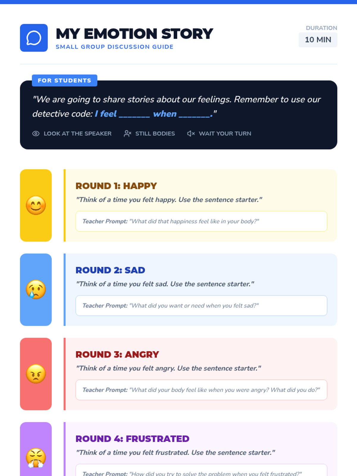 A single-session Tier 2 group lesson for 2nd and 3rd graders focused on identifying and labeling emotions like happy, sad, angry, and frustrated through interactive 'detective' activities.