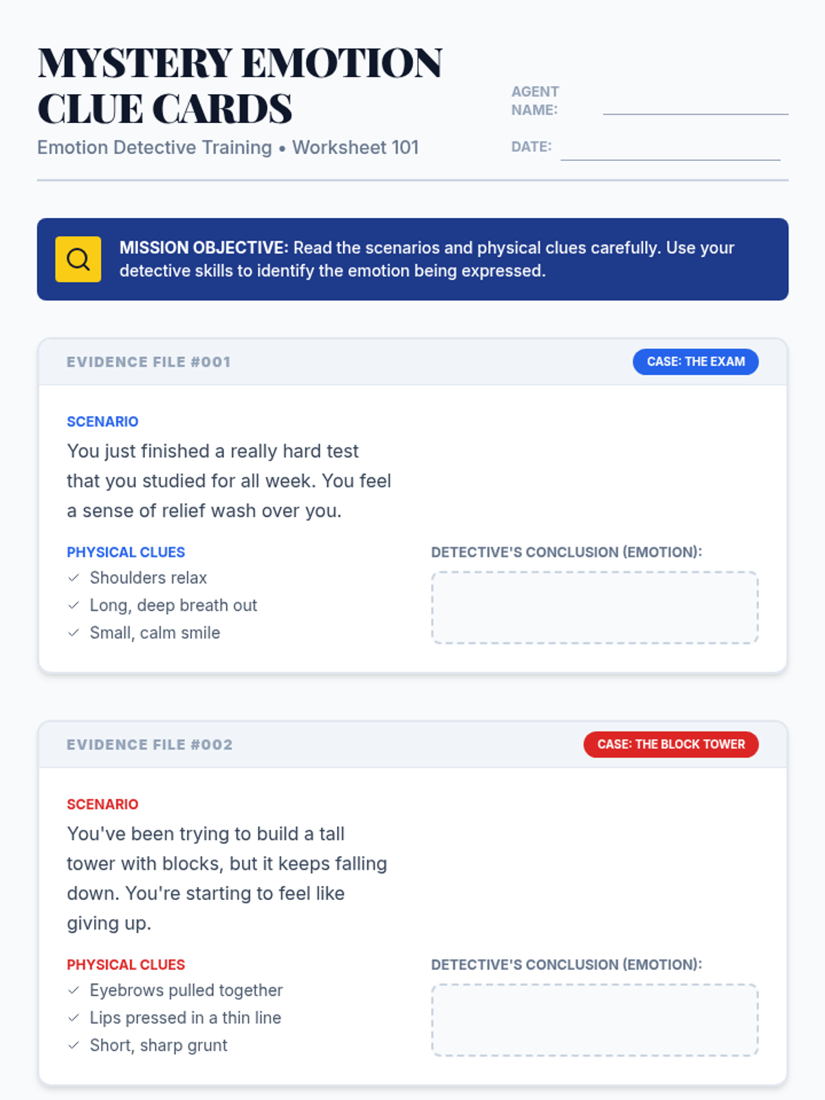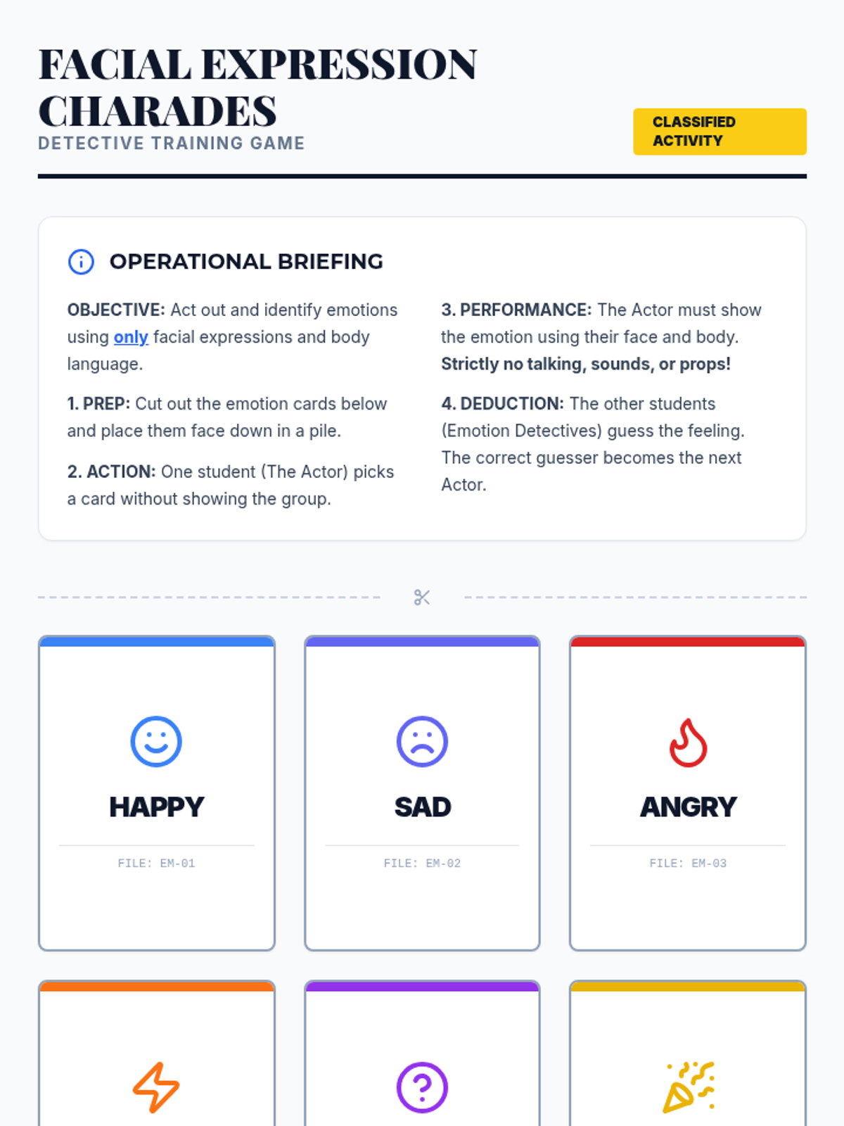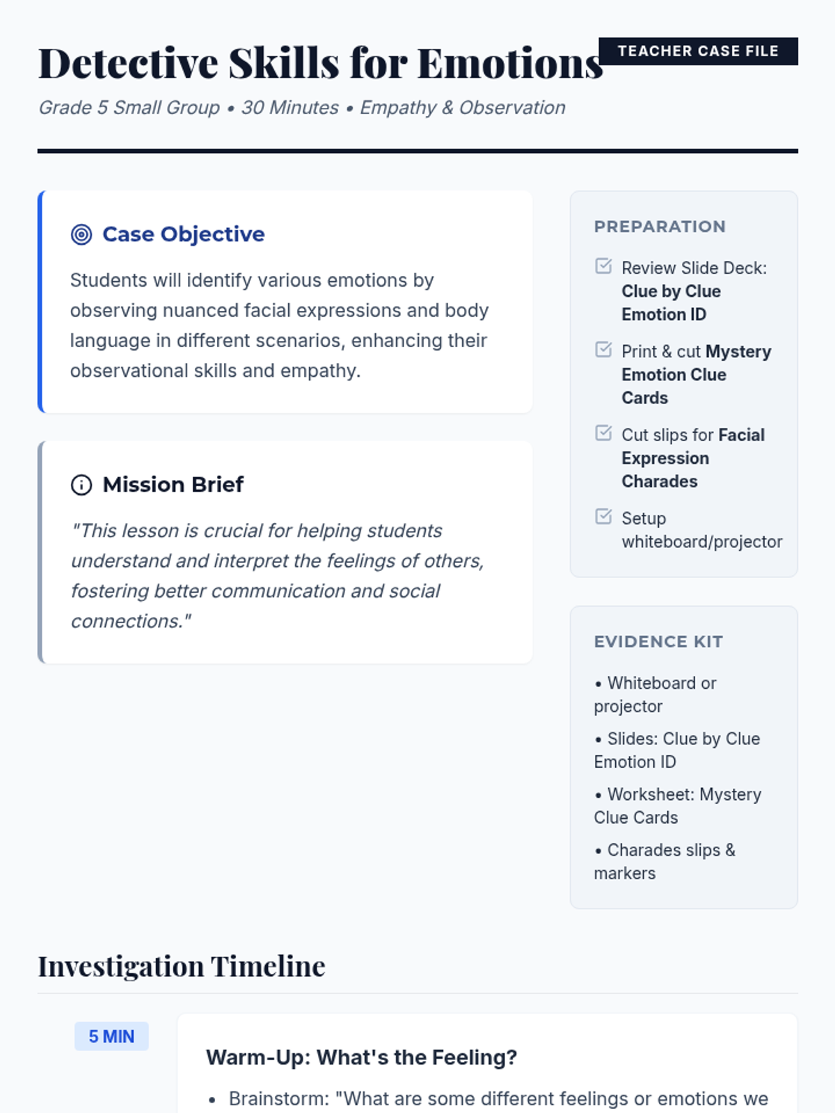 A 30-minute lesson where students become 'Emotion Detectives,' learning to identify feelings through facial expressions and body language clues.
