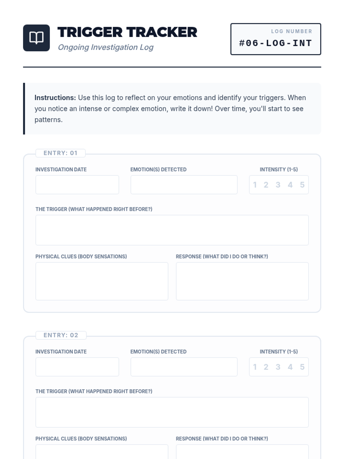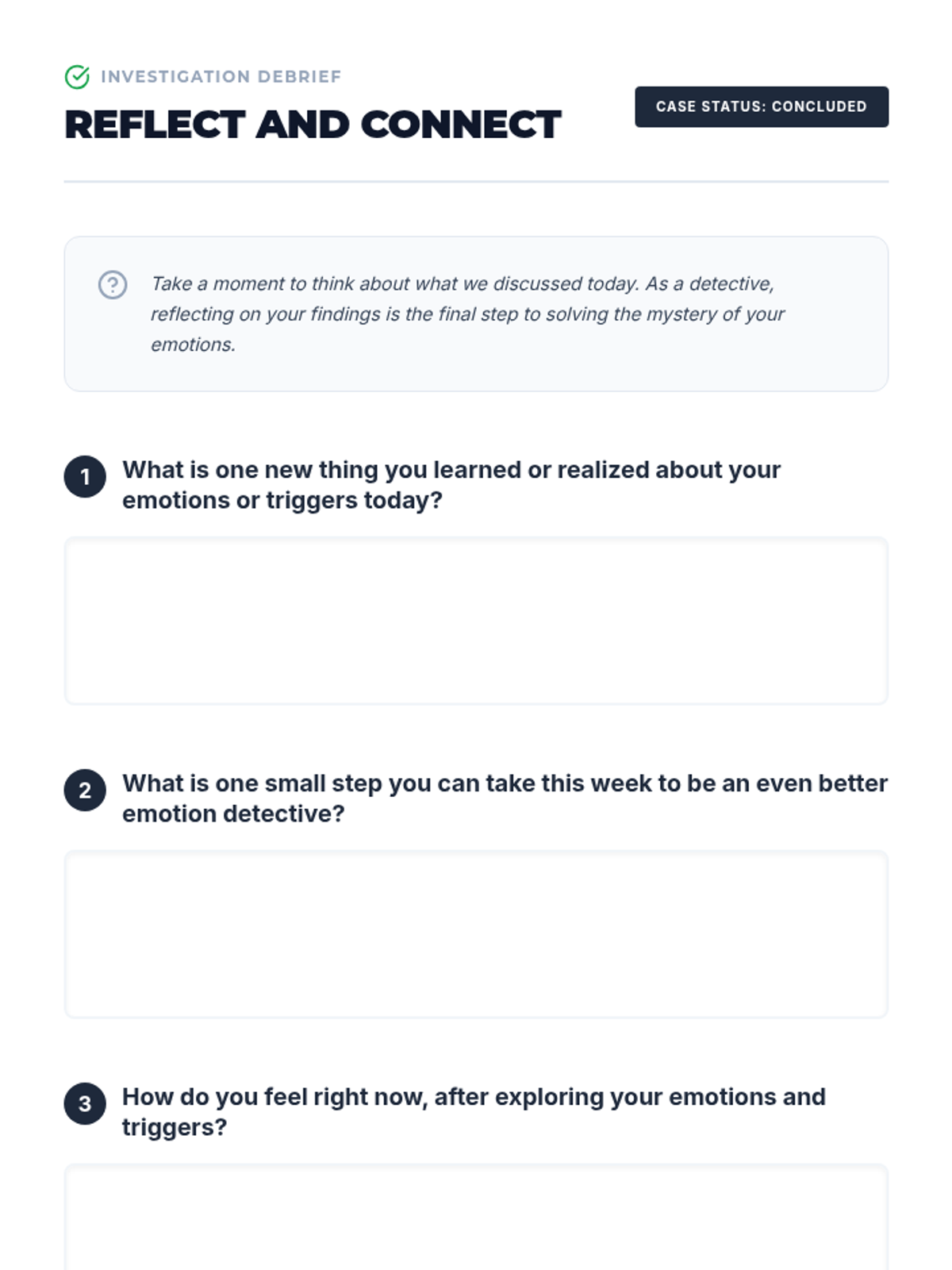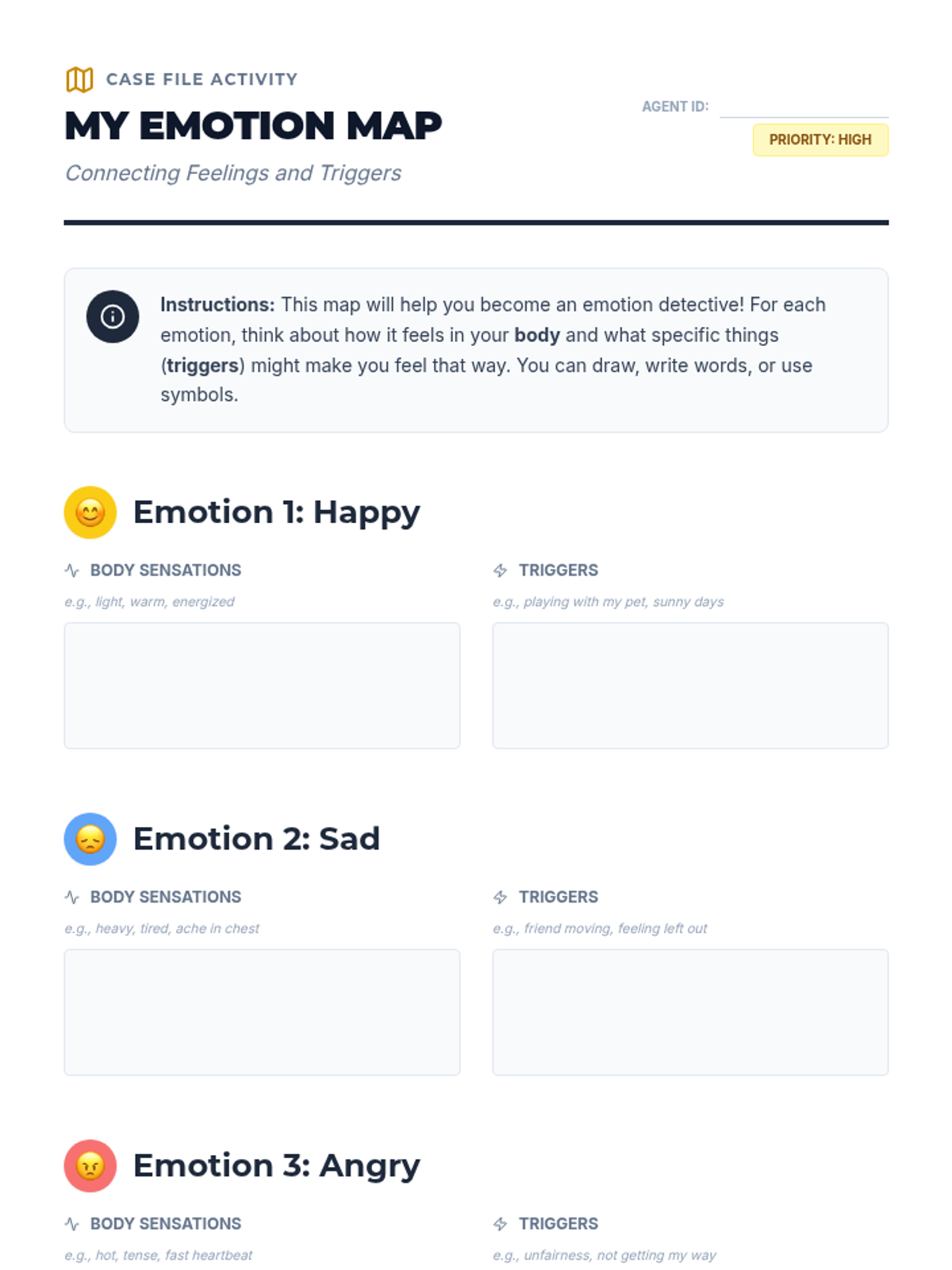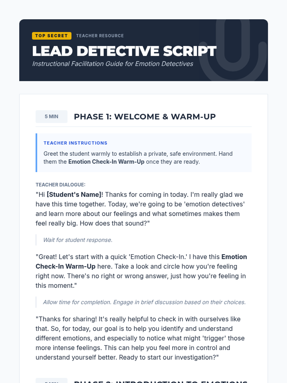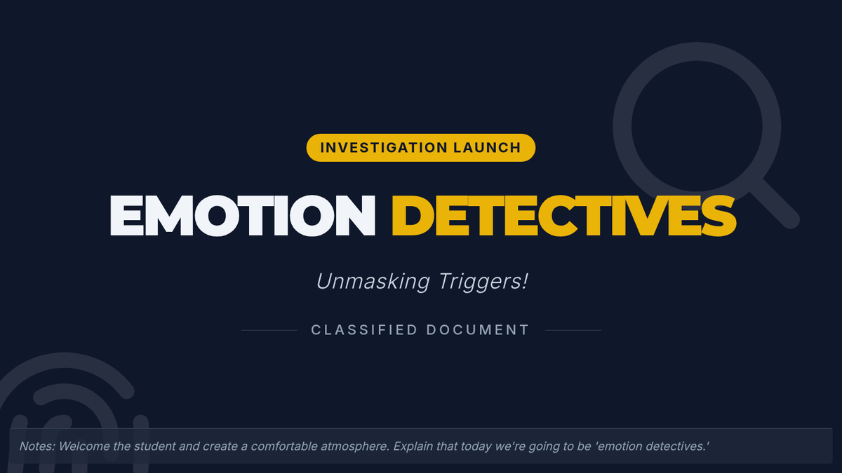 A 30-minute individual Tier 3 lesson for 6th-grade students to identify emotions, recognize personal triggers, and develop self-awareness through an 'emotion detective' investigation theme.