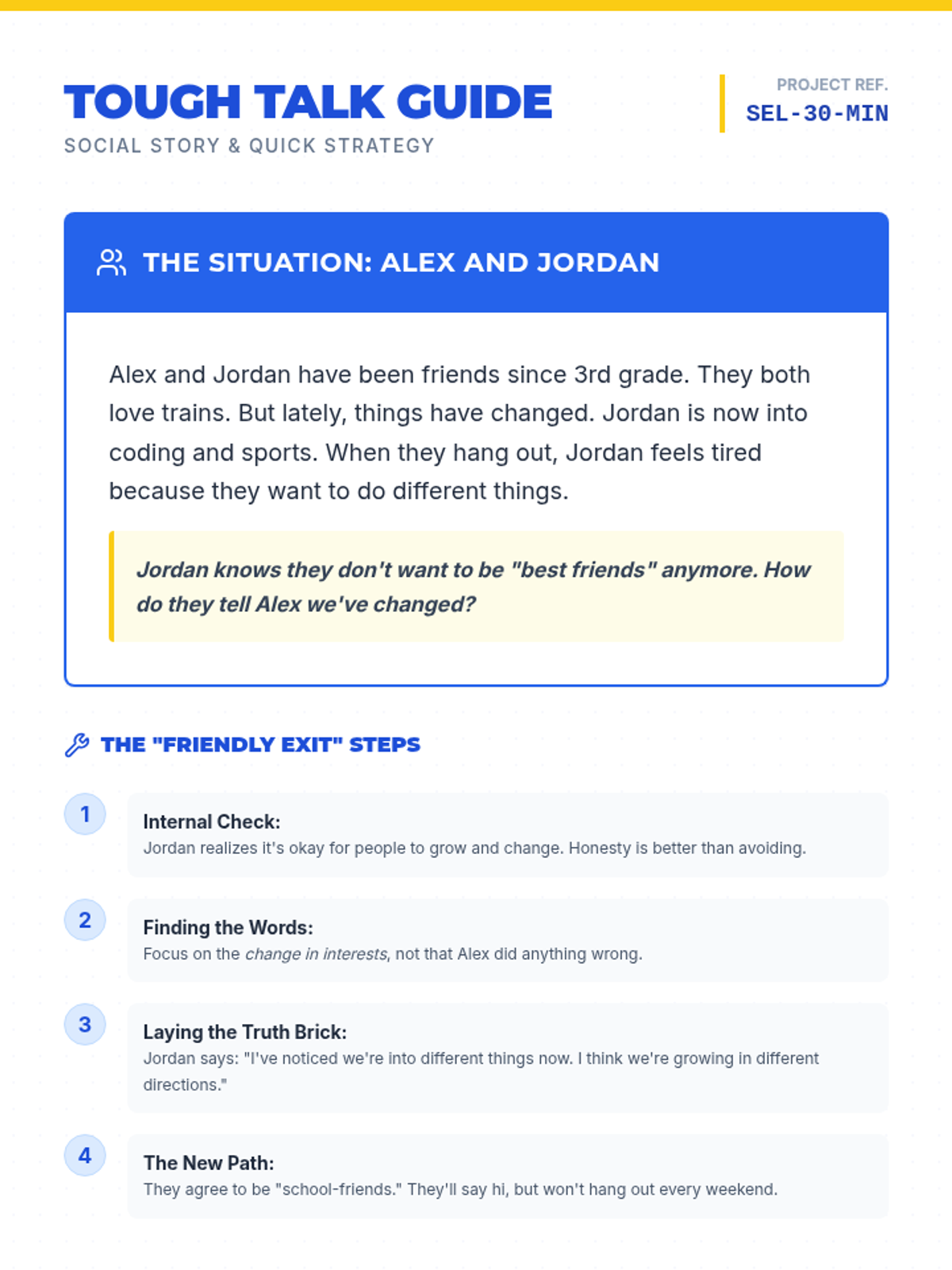 A comprehensive social-emotional learning lesson focused on developing the communication skills needed to navigate difficult conversations in junior high friendships. It includes a social story, role-playing practice, visual aids, and a teacher facilitation guide.