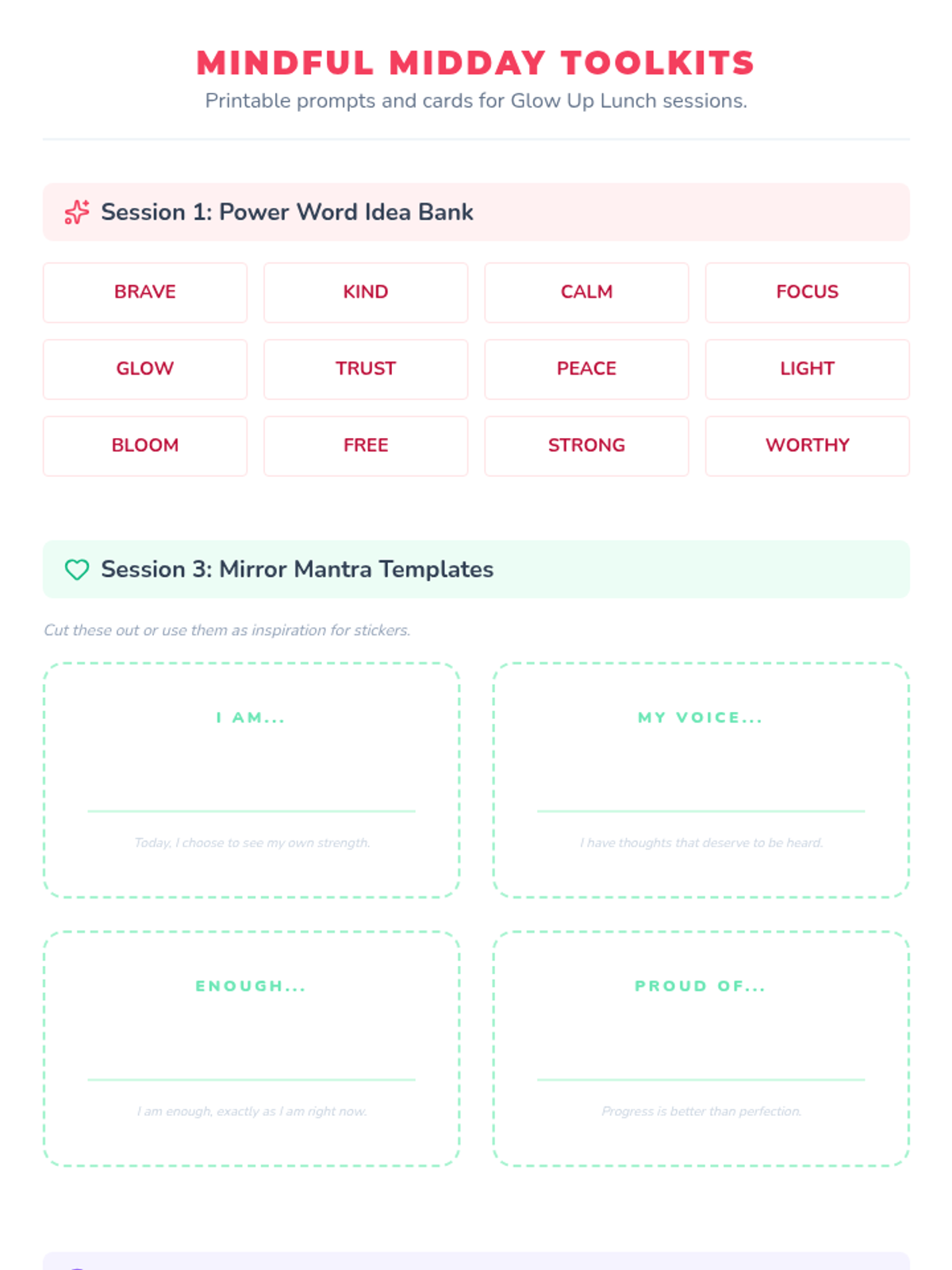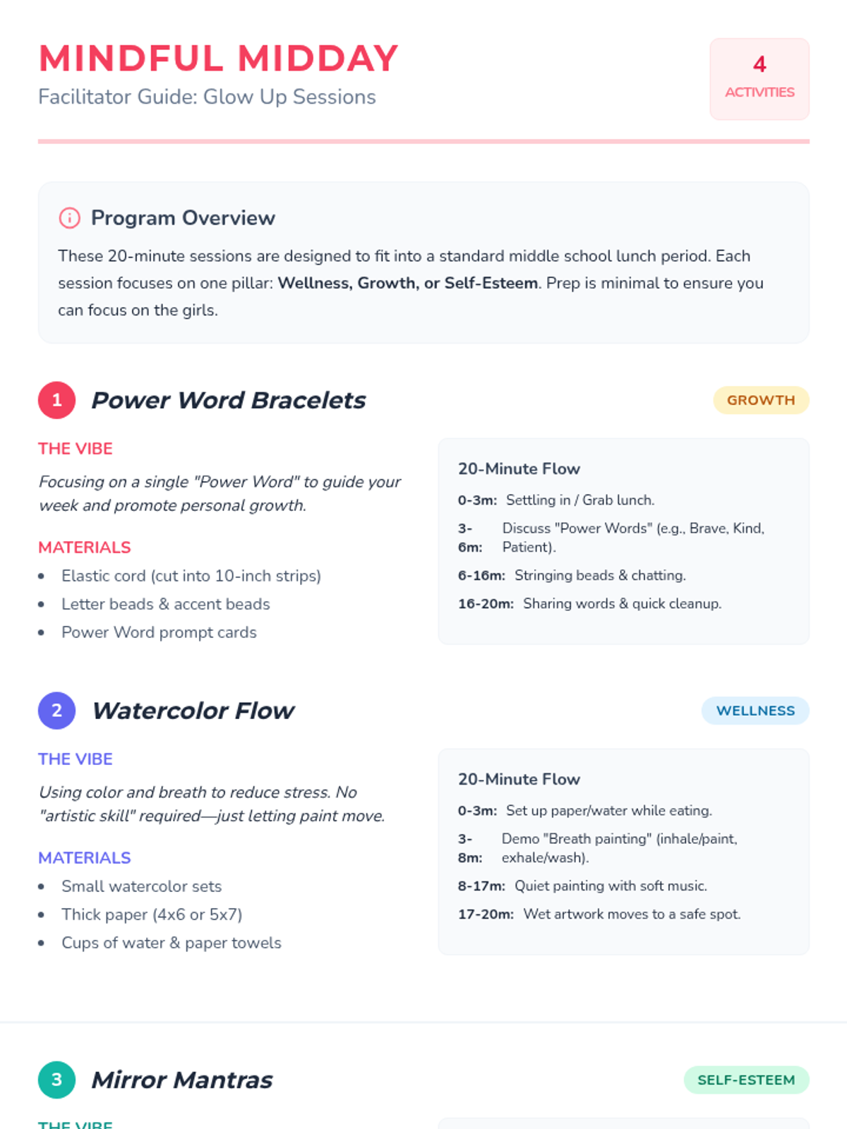 A series of four 20-minute lunch activities designed for middle school girls to promote wellness, growth, and self-esteem through creative mindfulness.