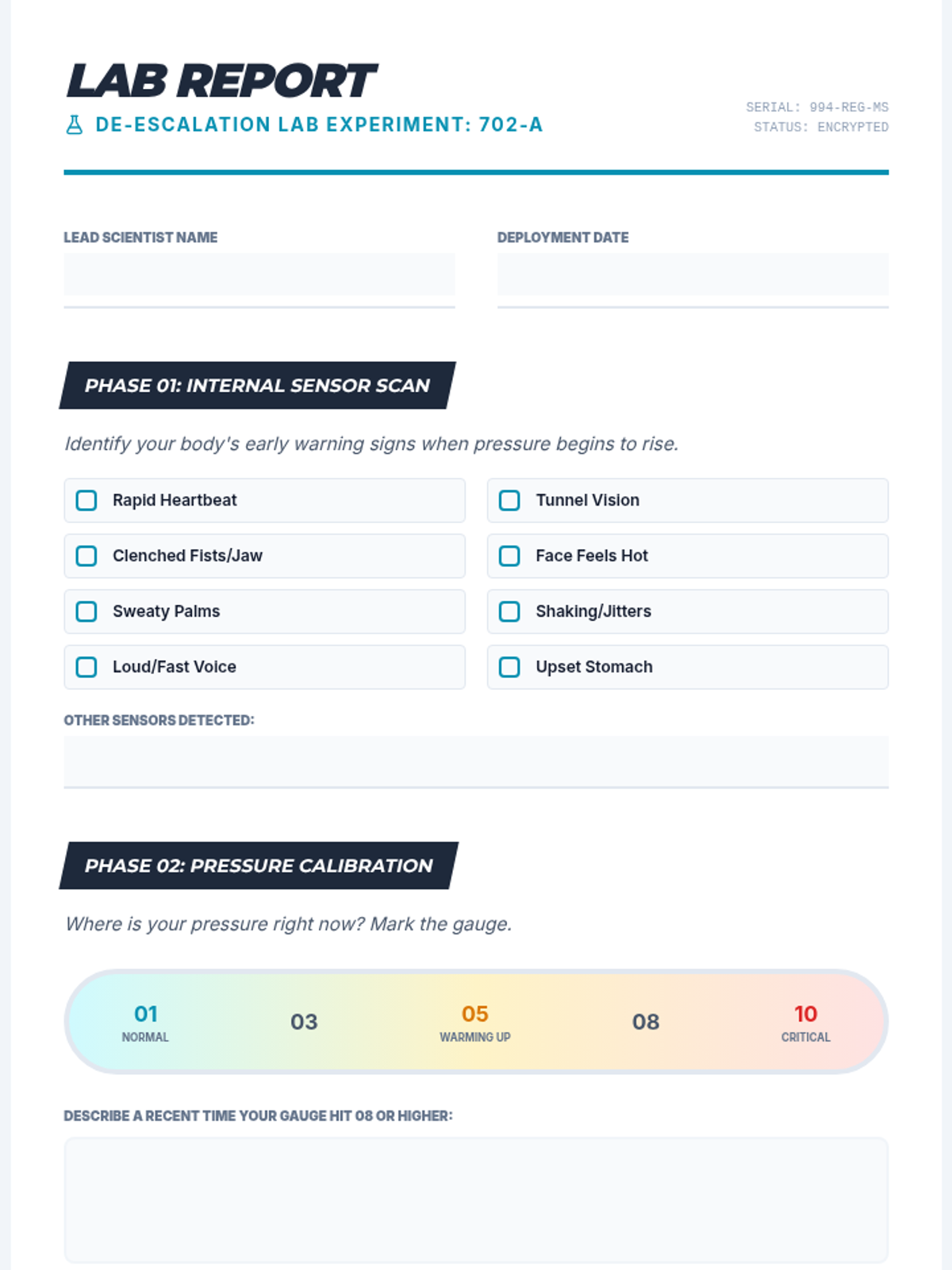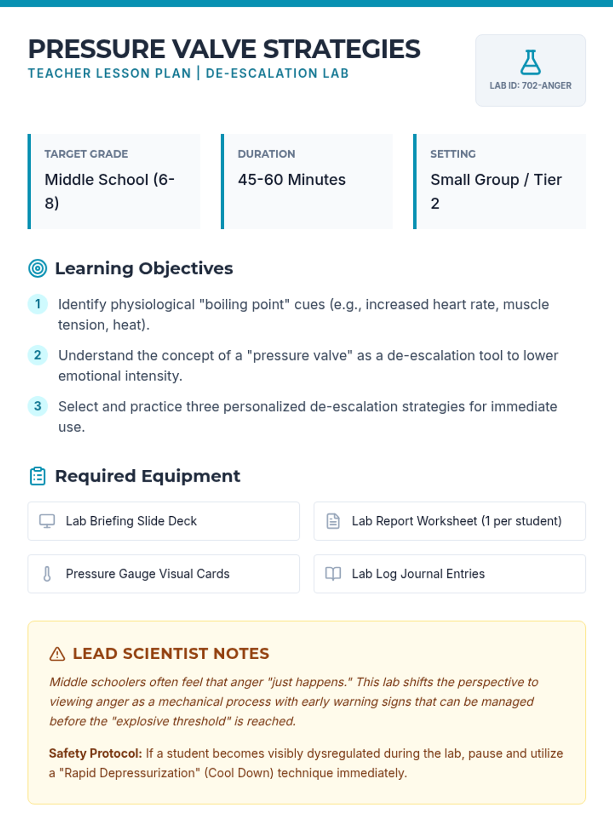 A laboratory-themed exploration of physiological anger cues and de-escalation strategies for middle schoolers to improve self-regulation and emotional awareness.